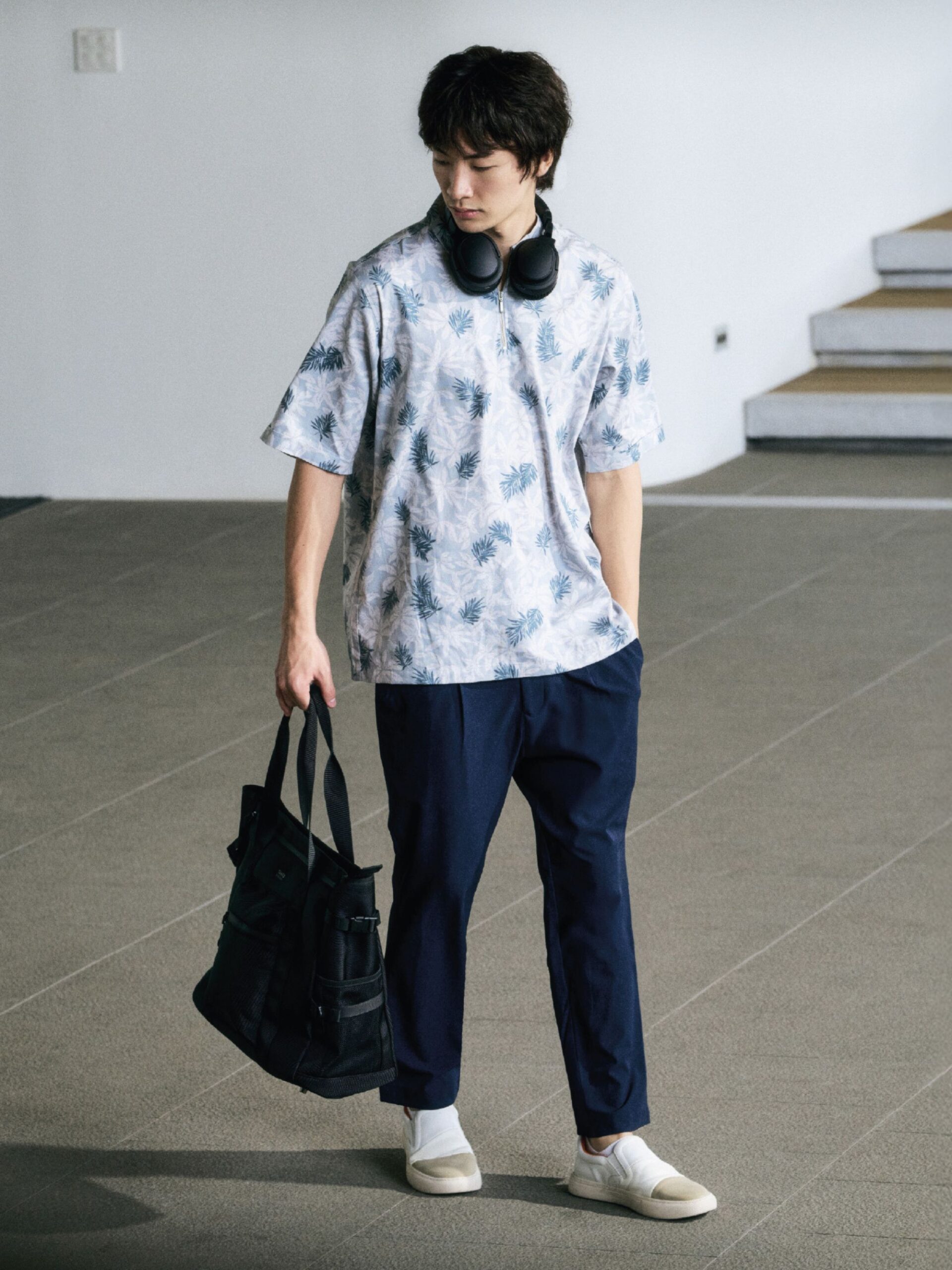#TOP เสื้อแขนสั้น คอซิป ผ้า cotton ทอลายคล้ายผ้าลินิน มีเทคโลโลยี Quick Dry, Cool Touch ใส่สบายไม่ระคายเคือง เนื้อผ้าพิมพ์ลายใบไม้ Tropical ทำให้ลุคของคุณดูชิคและมีไสตล์ #PANTS กางเกงทรง easy pants ผ้า Primeflex Dotair Polyester มีความยืดหยุ่น น้ำหนักเบา และดูแลรักษาง่าย โดยปลายขากางเกงปรับให้กว้างขึ้น ใส่สบายขึ้น เหมาะกับการเดินทาง ออกไปพบปะผู้คนได้อย่างคล่องตัวและมั่นใจ #ACCESSORIES กระเป๋า Tote นำเข้าจากญี่ปุ่น ที่ช่วยให้คุณนำของติดตัวไปได้ทุกที่