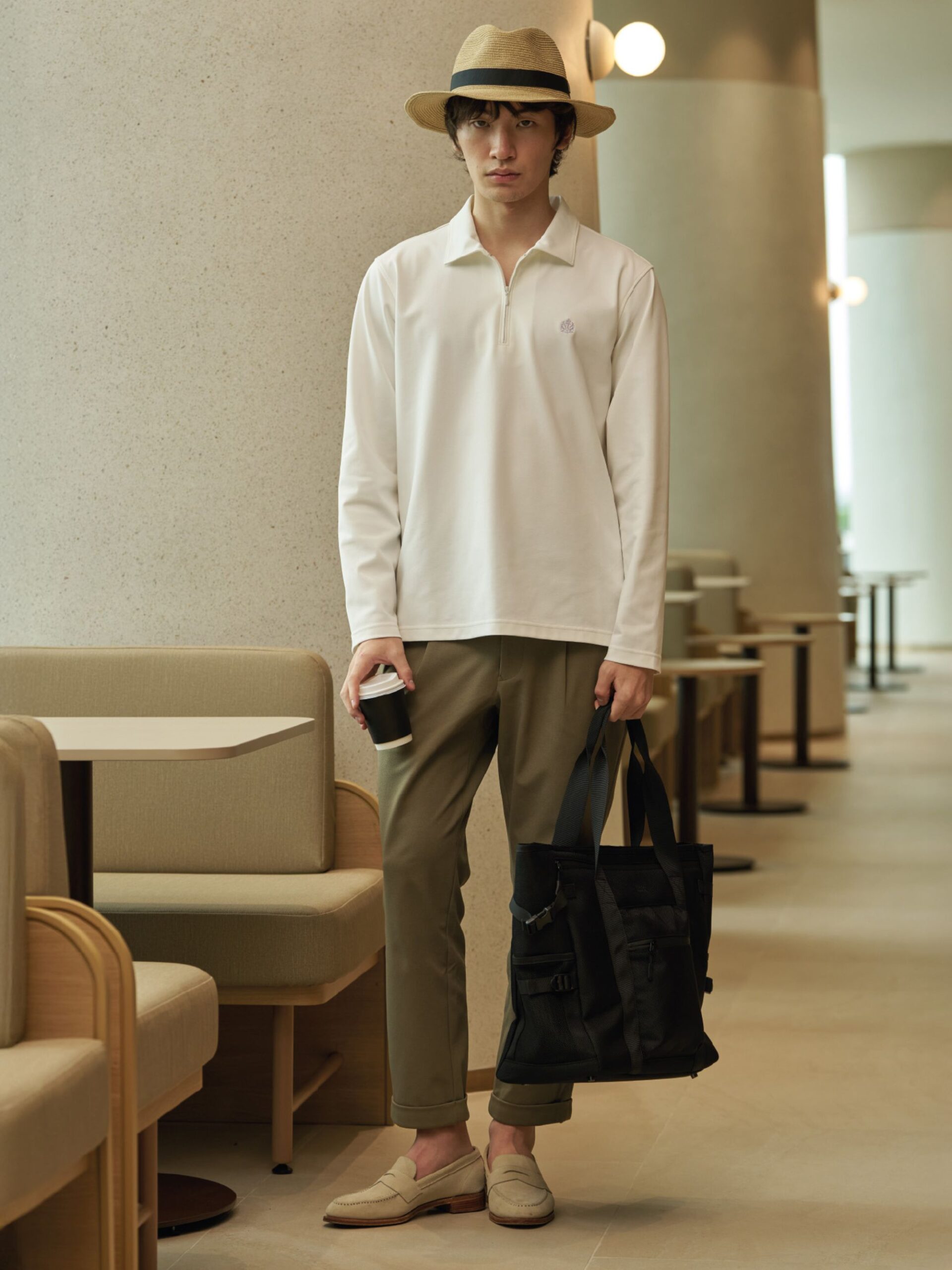 #TOP เสื้อโปโลแขนยาว คอซิป ที่สามารถใส่ซัมเมอร์นี้ได้อย่างสบายและดูดี ด้วยเทคโนโลยี Cool Touch และ UV Protection เนื้อผ้ามีความนุ่มลื่น เย็นสบาย #PANTS กางเกงขายาวทรง easy pants เนื้อผ้าเรียบลื่น เบาสบาย อยู่ทรง และดูแลรักษาง่าย ที่เอวมีตัวปรับความกระชับเอว และดีไซน์ปลายขากางเกงเป็น double pants พับทบขึ้น ให้ความรู้สึกคลาสสิก เรียบหรู #ACCESSORIES ให้การเดินทางในวันพักผ่อนคุณคล่องเคล่วขึ้น ด้วยกระเป๋า tote ผ้าไนลอน รุ่น Bumpy น้ำเข้าจากประเทศญี่ปุ่น มีช่องใส่ของ 6 ช่อง พร้อมช่องใส่ขวดน้ำ และช่องใส่ปากกา พร้อมหมวกสานที่เข้ากันดีกับลุคและช่วยให้คุณใส่กันแสงแดดได้อย่างมีไสตล์