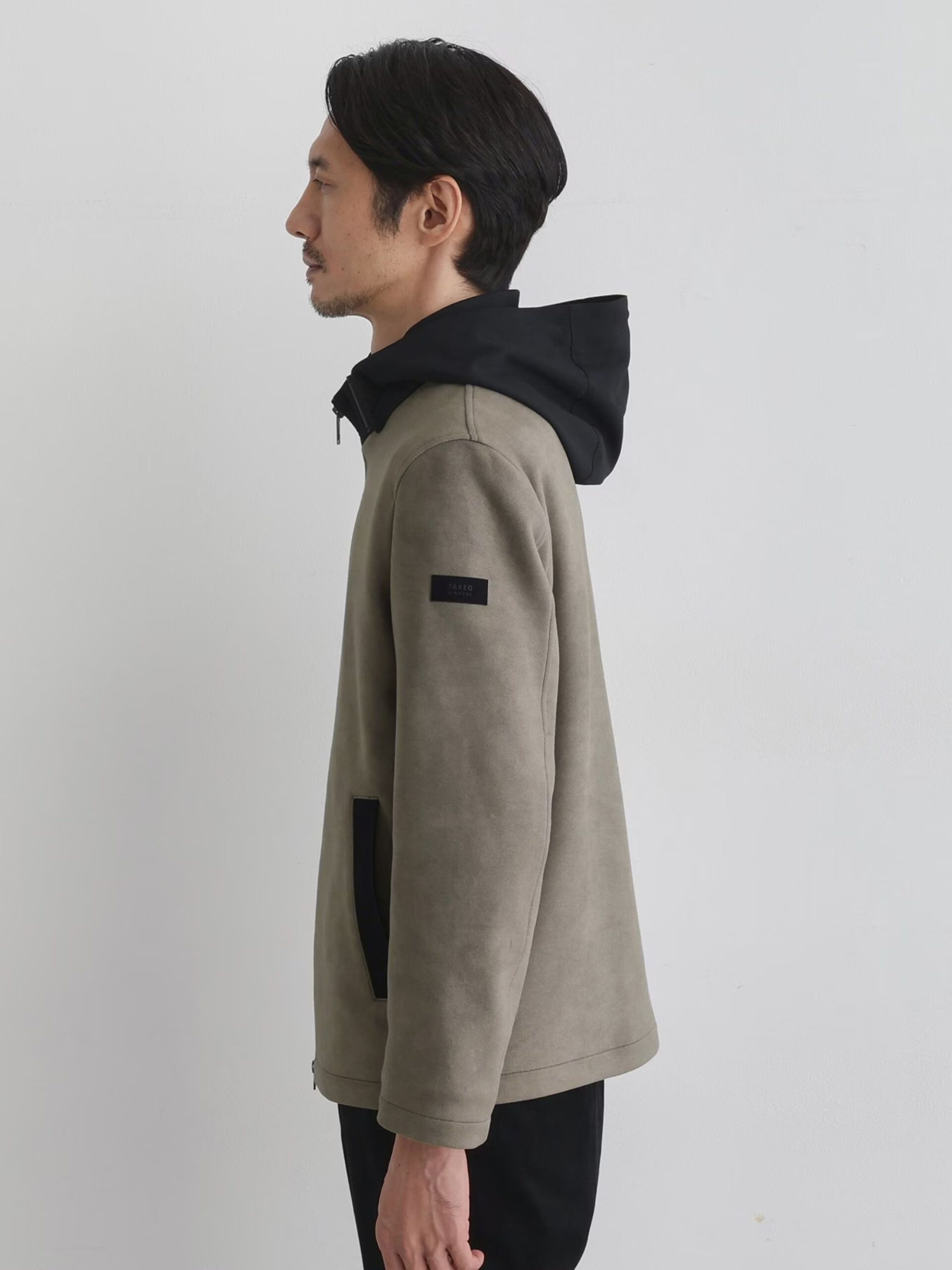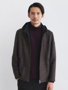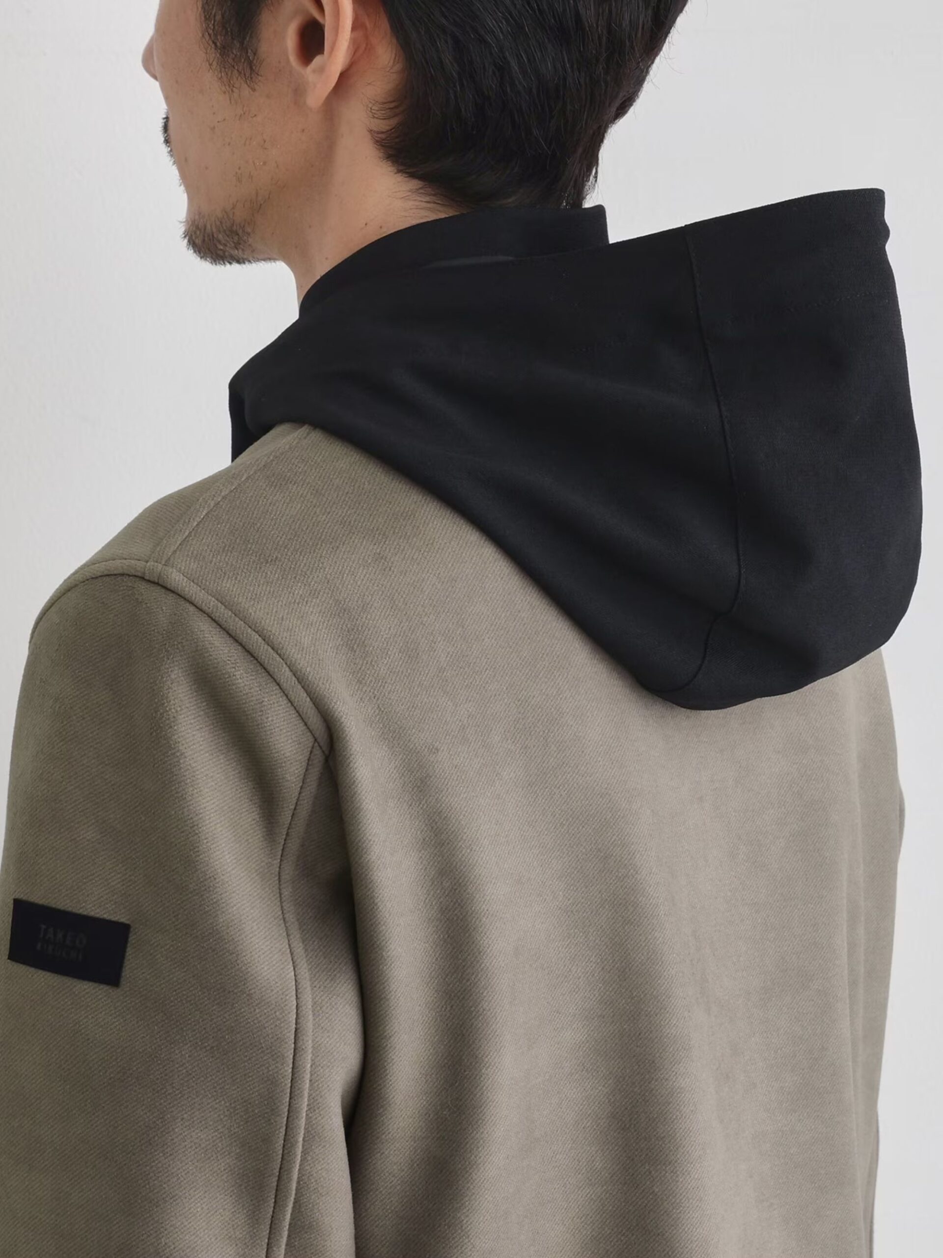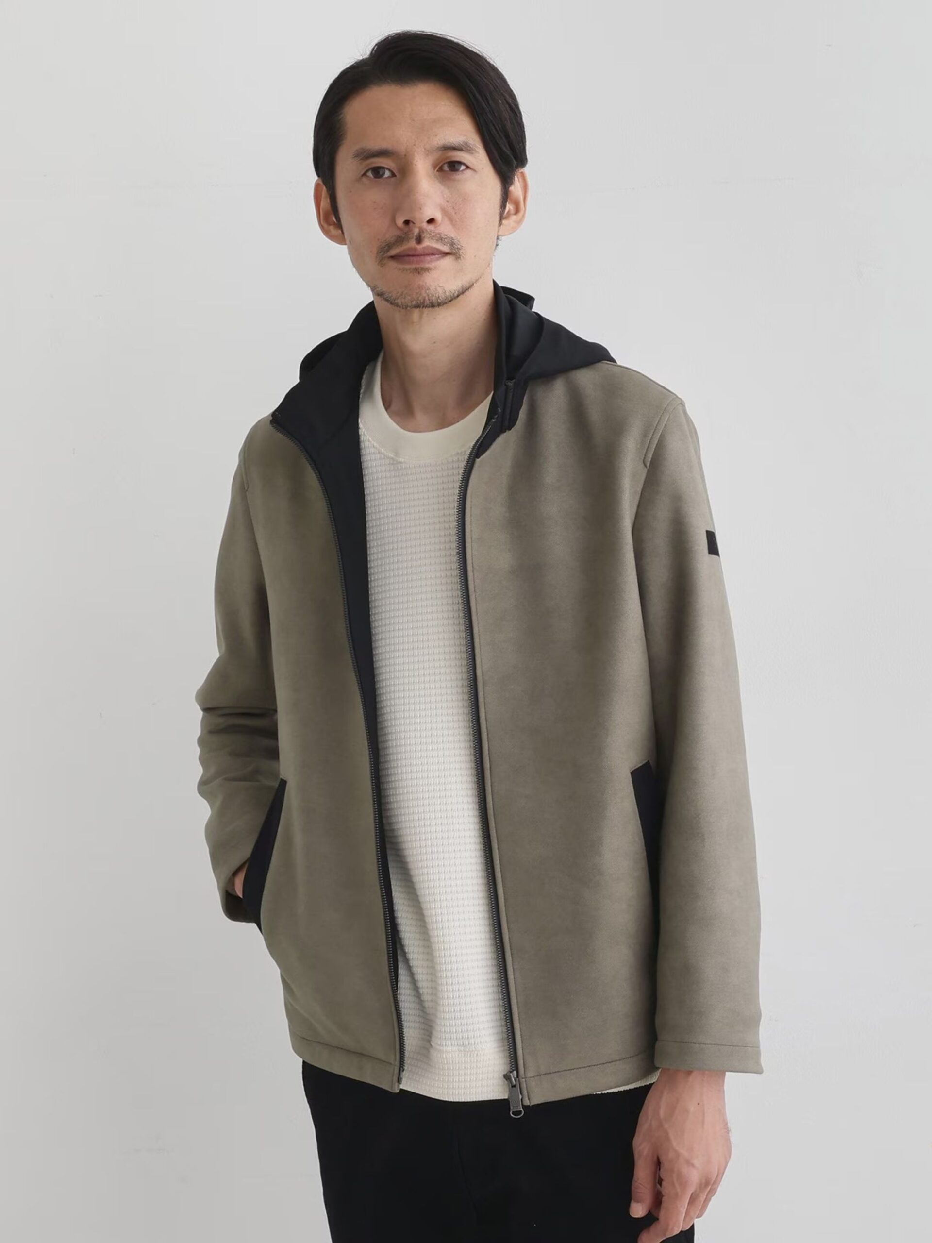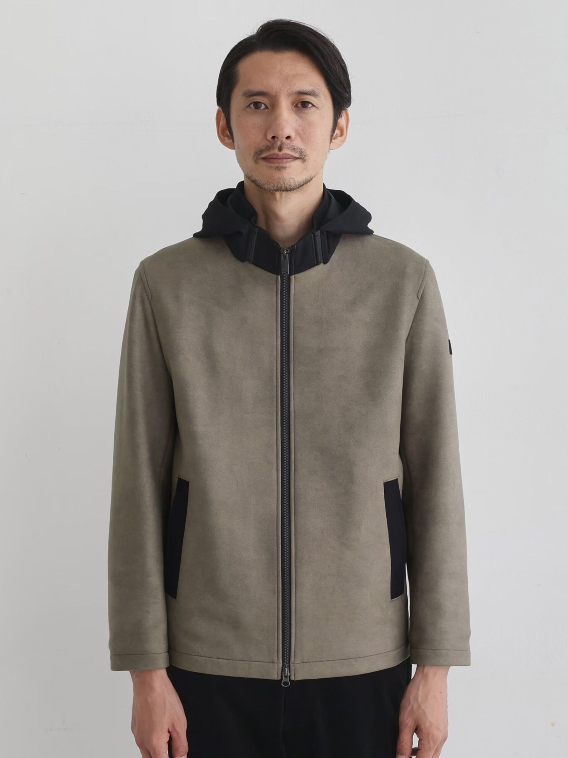 เสื้อแจ็คเก็ตนี้ทำจาก Down Fabric ซึ่งเป็นวัสดุที่มีคุณสมบัติการใช้งานหลากหลาย สามารถสวมเป็นแจ็กเก็ตน้ำหนักเบา หรือเป็นเลเยอร์ด้านในช่วงฤดูหนาวได้ จึงเป็นชิ้นที่ใช้งานได้อเนกประสงค์มาก พื้นผิวเนื้อผ้าสัมผัสนุ่มลื่นแบบหนังกลับ ให้ลุคที่ดูหรูหราและสุภาพ ฮู้ดสามารถถอดออกได้ ทำให้สวมใส่ได้ทั้งแบบพาร์กา หรือแบบคอตั้ง และเมื่อถอดฮู้ดออก จะช่วยให้แมตช์เป็นเลเยอร์ด้านในใต้โค้ทช่วงกลางฤดูหนาวได้ง่ายขึ้น