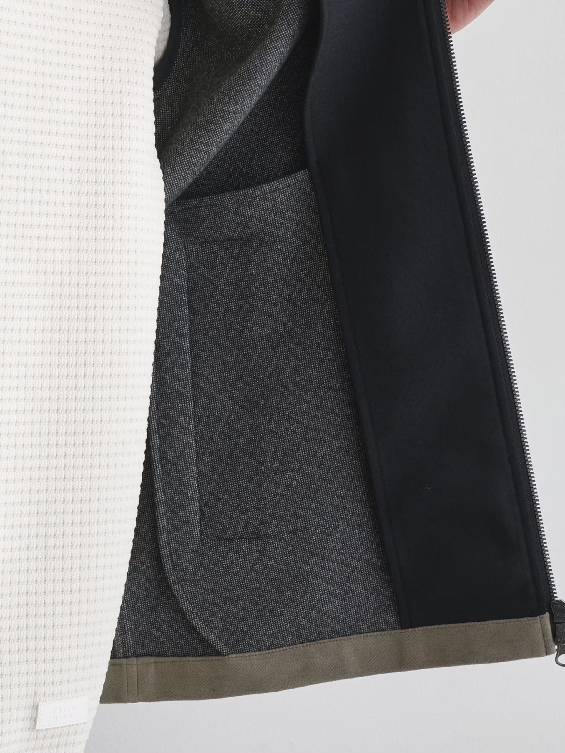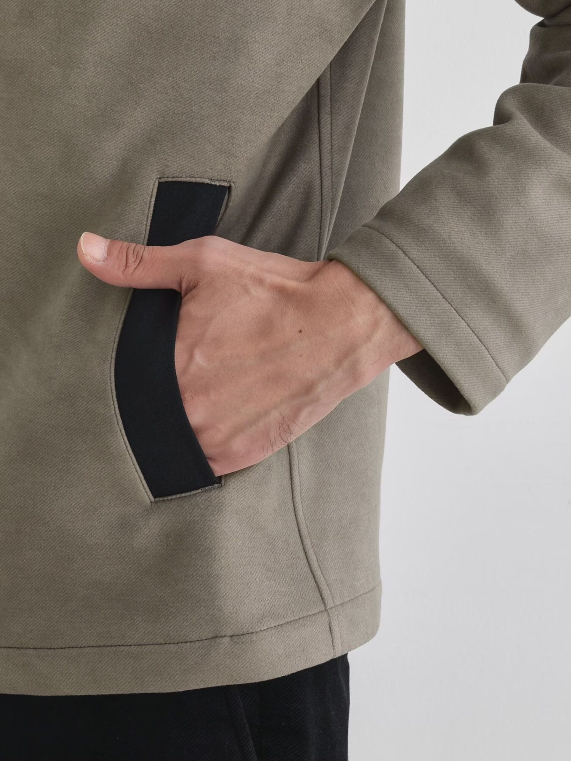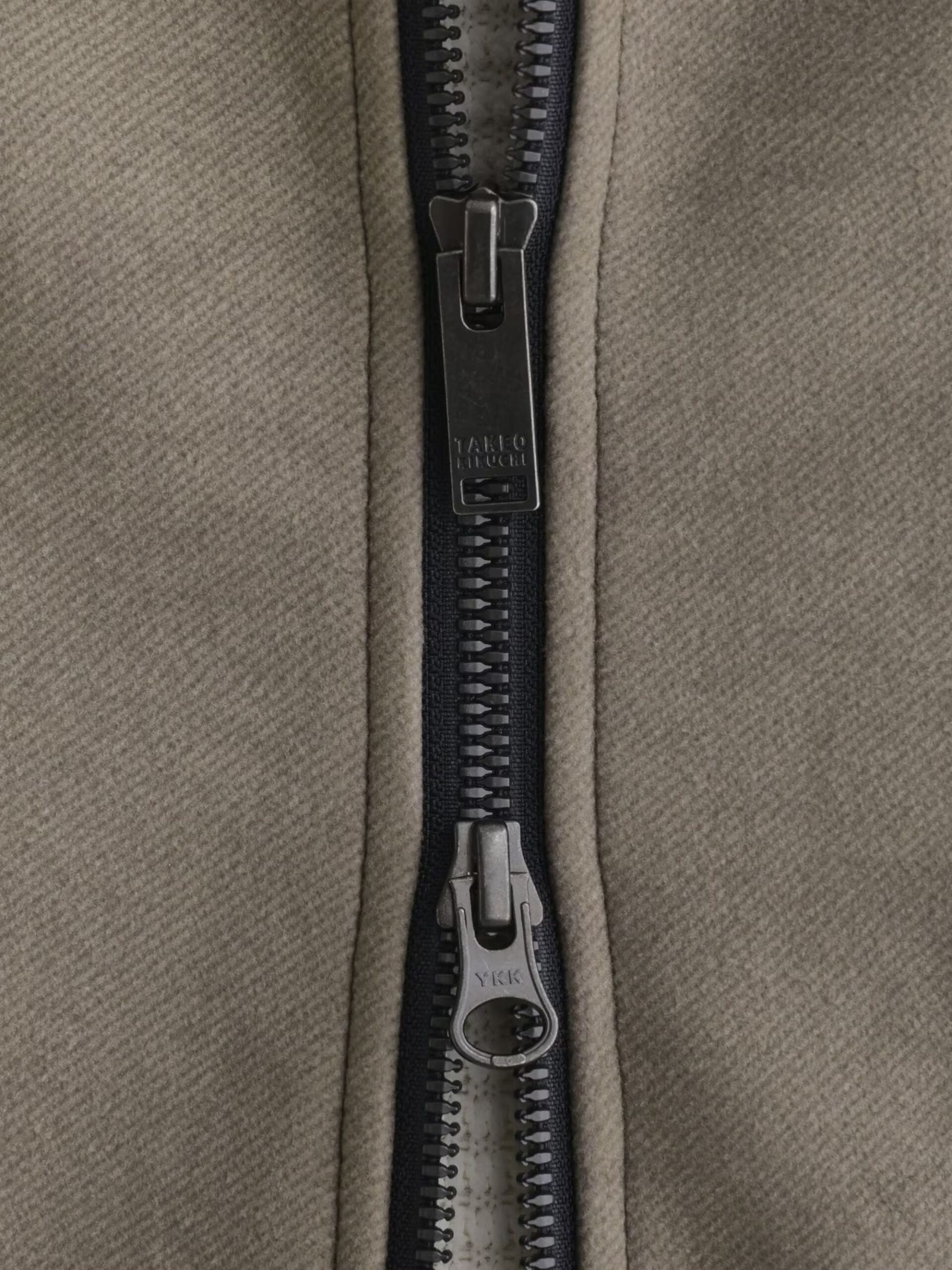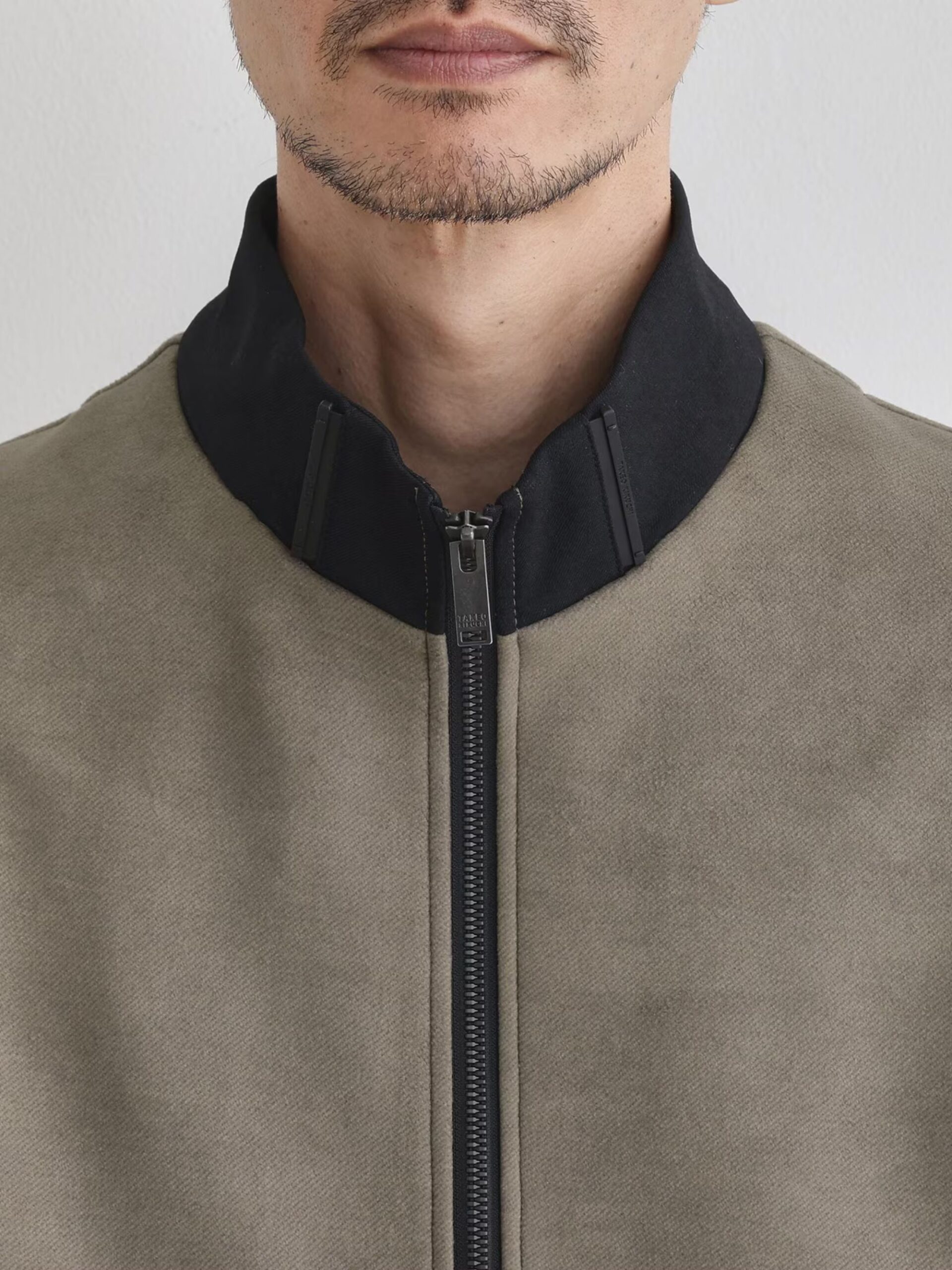 เสื้อแจ็คเก็ตนี้ทำจาก Down Fabric ซึ่งเป็นวัสดุที่มีคุณสมบัติการใช้งานหลากหลาย สามารถสวมเป็นแจ็กเก็ตน้ำหนักเบา หรือเป็นเลเยอร์ด้านในช่วงฤดูหนาวได้ จึงเป็นชิ้นที่ใช้งานได้อเนกประสงค์มาก พื้นผิวเนื้อผ้าสัมผัสนุ่มลื่นแบบหนังกลับ ให้ลุคที่ดูหรูหราและสุภาพ ฮู้ดสามารถถอดออกได้ ทำให้สวมใส่ได้ทั้งแบบพาร์กา หรือแบบคอตั้ง และเมื่อถอดฮู้ดออก จะช่วยให้แมตช์เป็นเลเยอร์ด้านในใต้โค้ทช่วงกลางฤดูหนาวได้ง่ายขึ้น