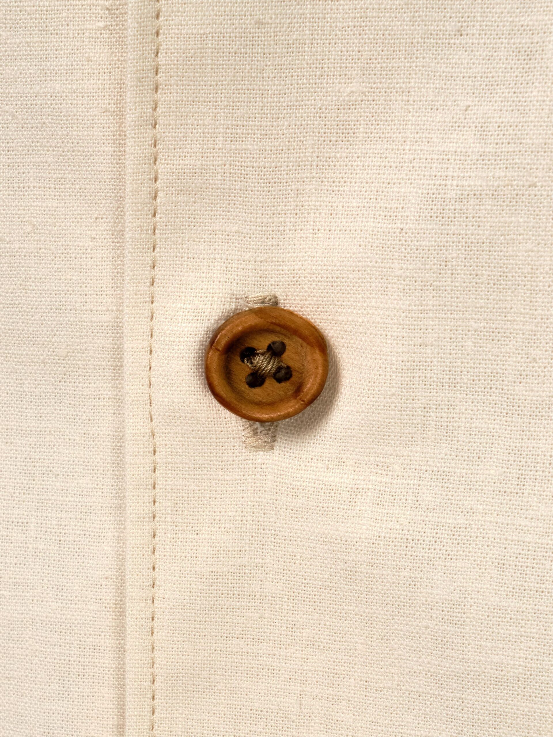 เสื้อตัวนี้ออกแบบมาคำเรียกร้องของลูกค้าที่ต้องการหาผ้าใยธรรมชาติ จึงออกแบบให้ดูเรียบง่าย มีลูกเล่นที่งานเดินตะเข็บสองเส้น เพื่อให้เกิด puckering บริเวณปก บ่า และกระเป๋า กระดุมเลียนแบบไม้