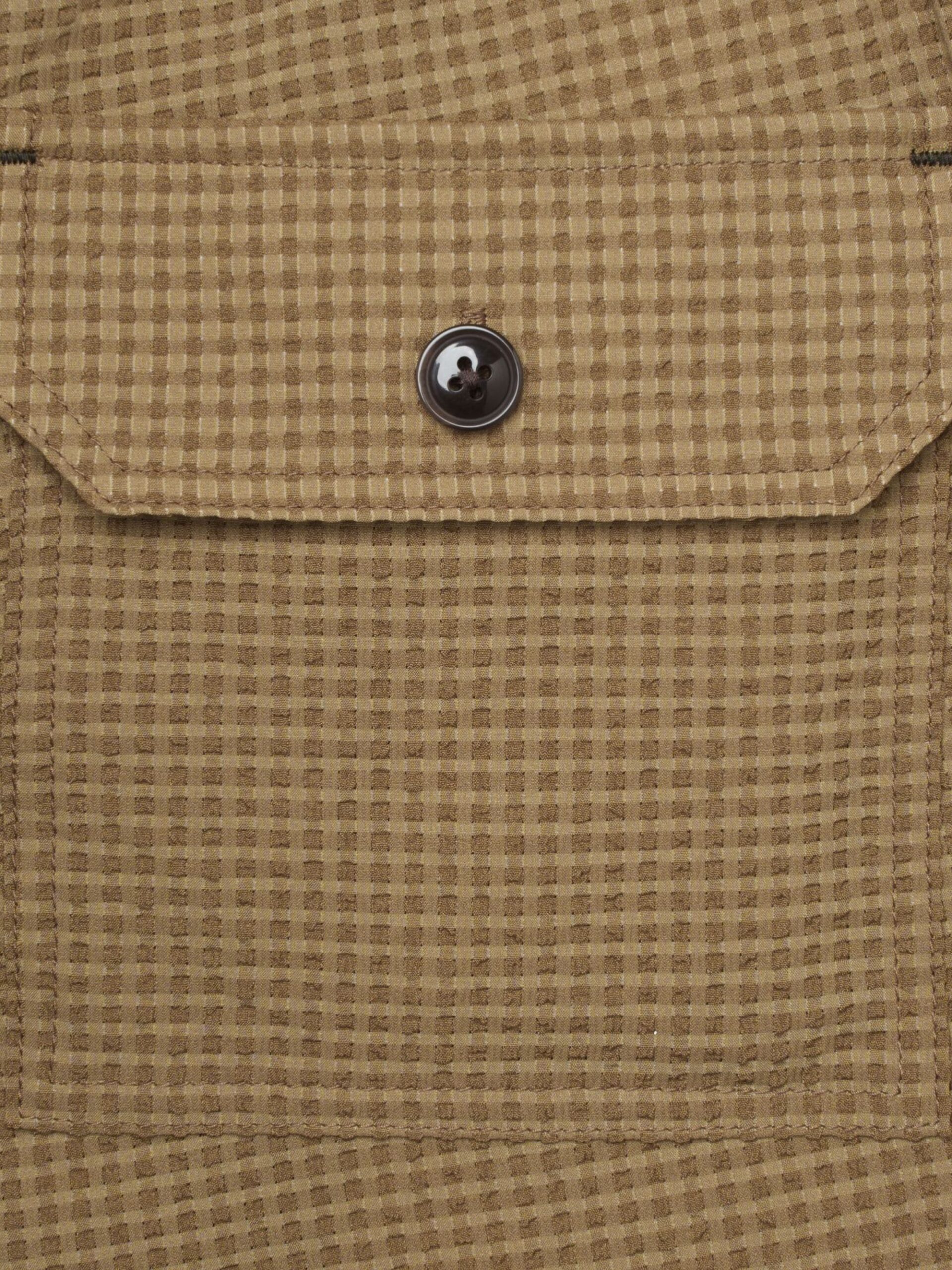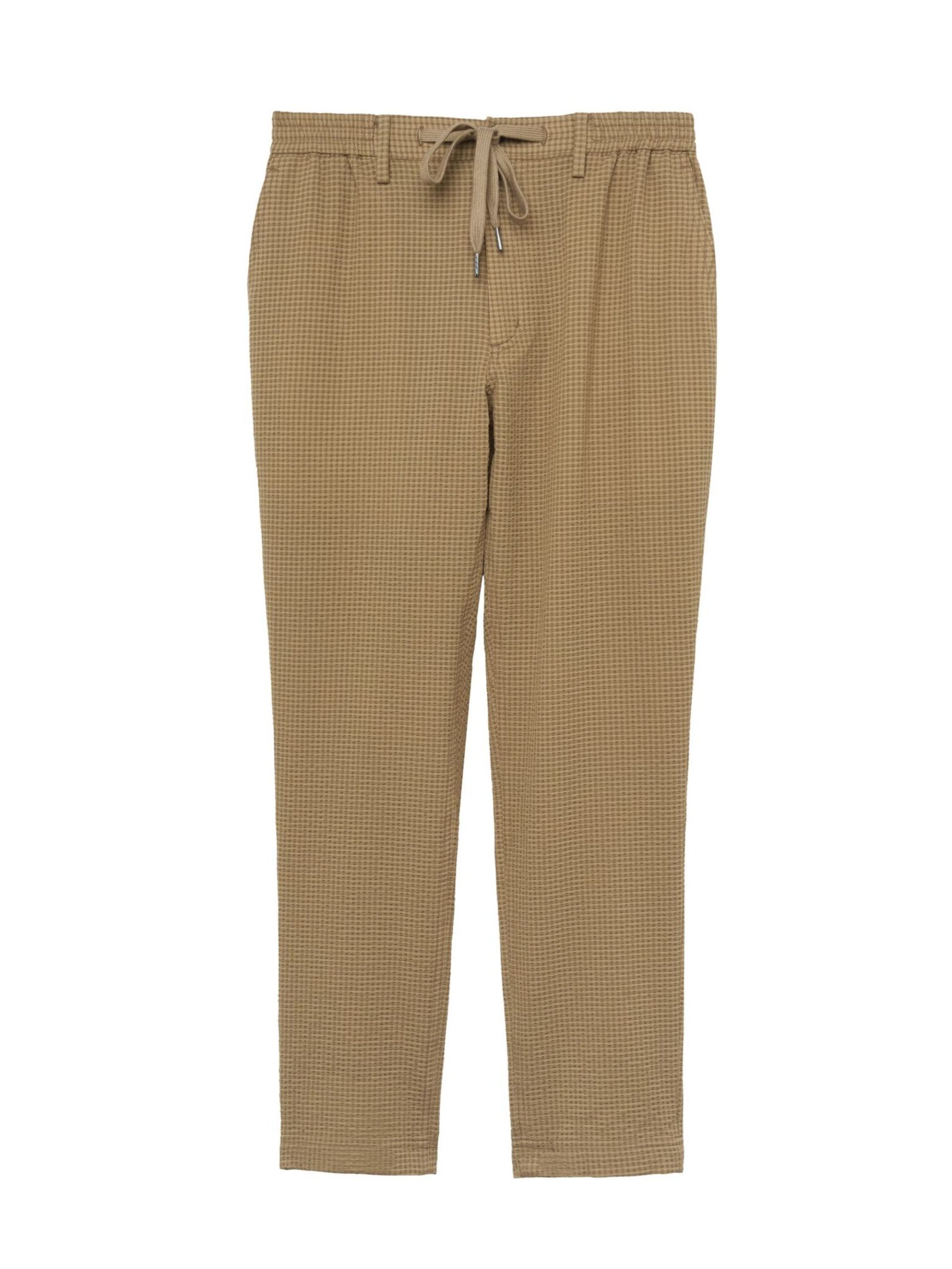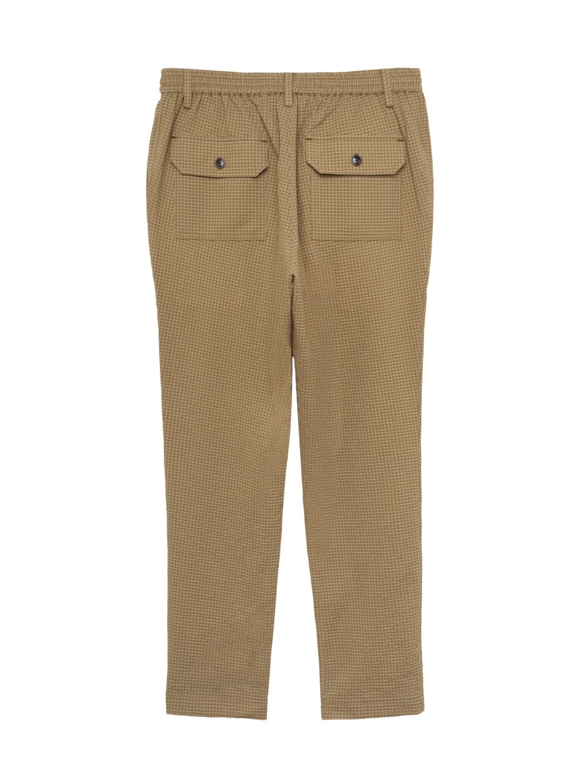 The Easy Pants are made from Polyester Primeflex, a two-way stretch fabric that is soft and comfortable to wear. For this version, the brand has selected Sucker fabric, known for its unique texture, excellent breathability, and wrinkle resistance. The fabric pattern resembles a Checkered Pattern (Seasonal Concept) but has been refined into a smaller scale for a more sophisticated look suited to gentlemen.