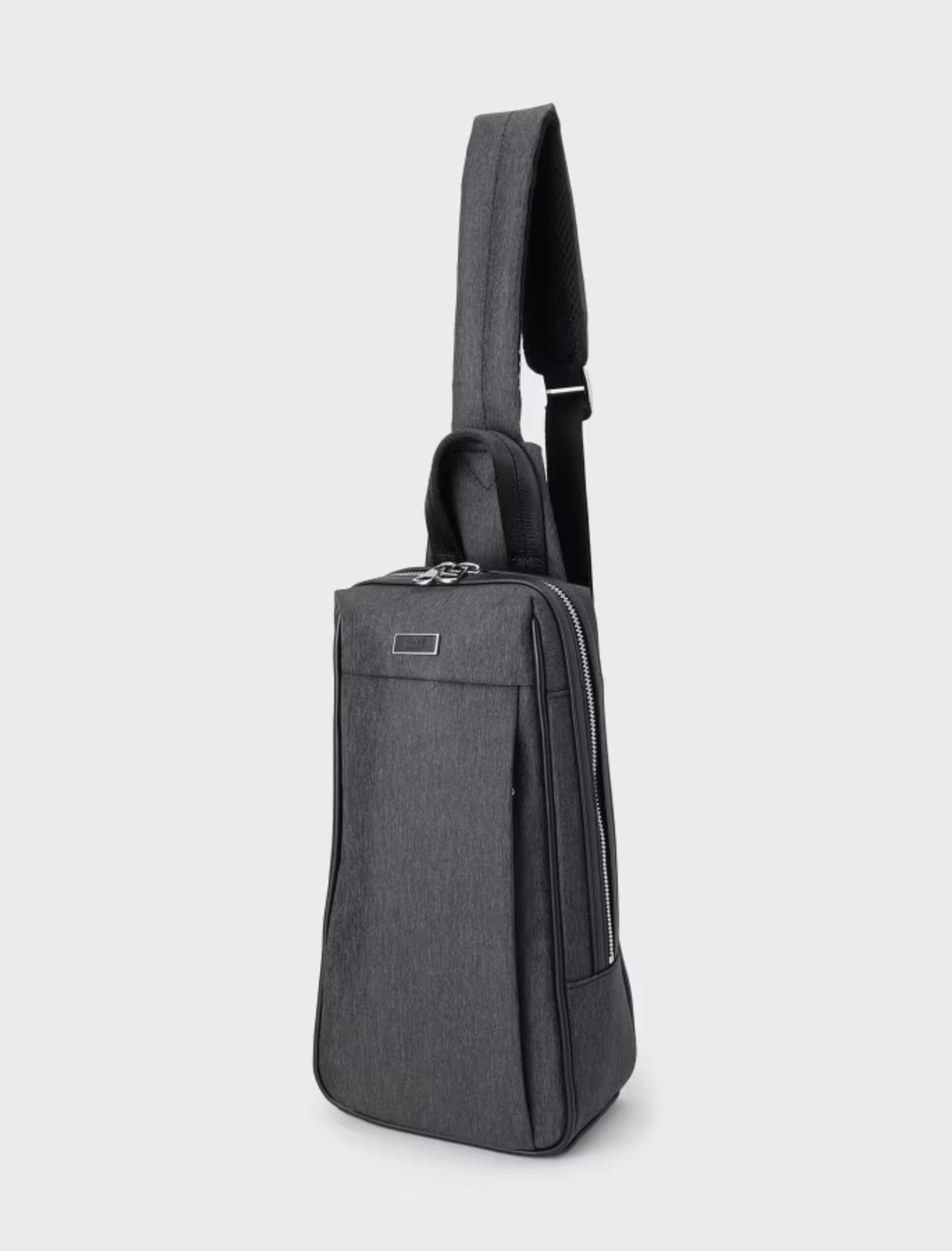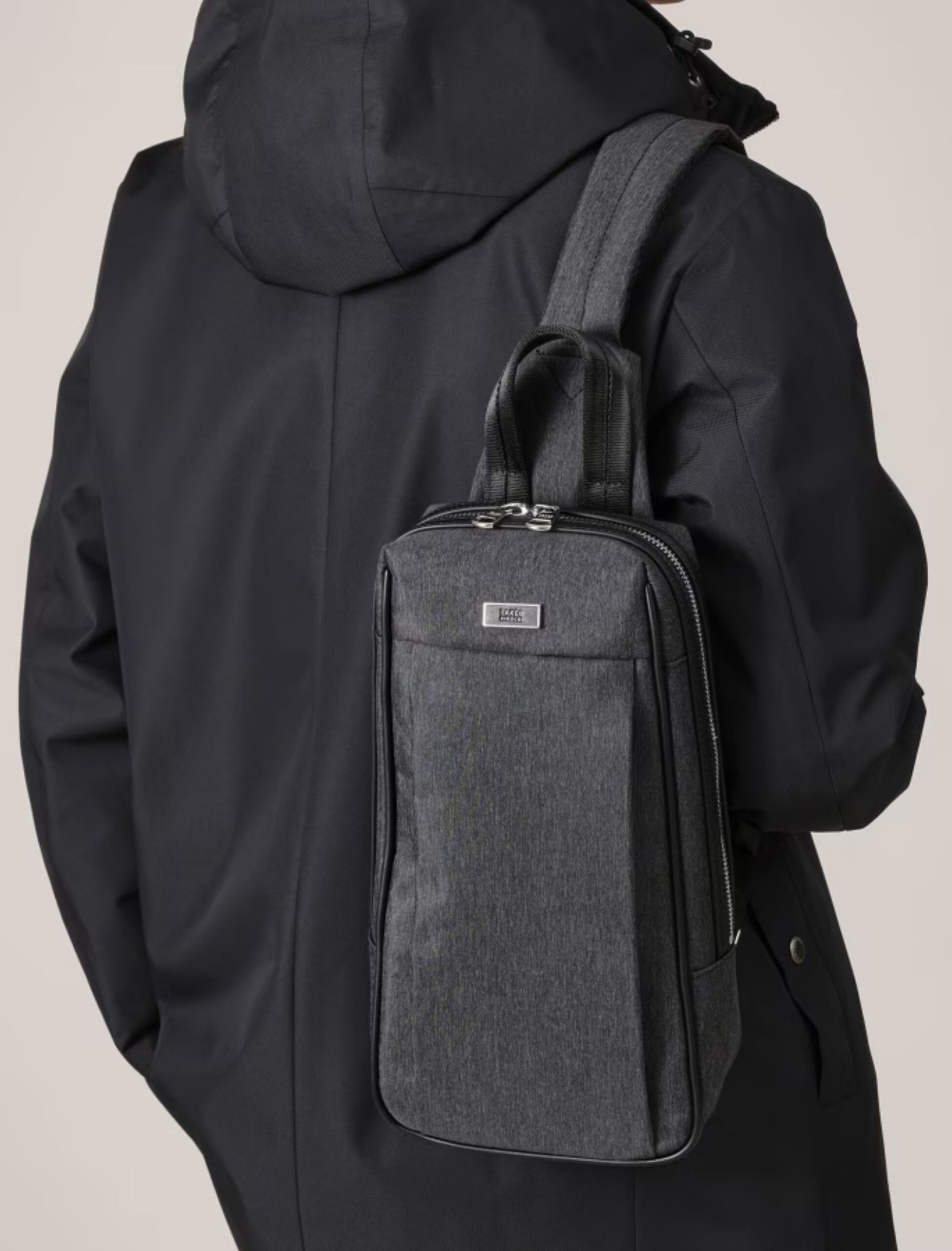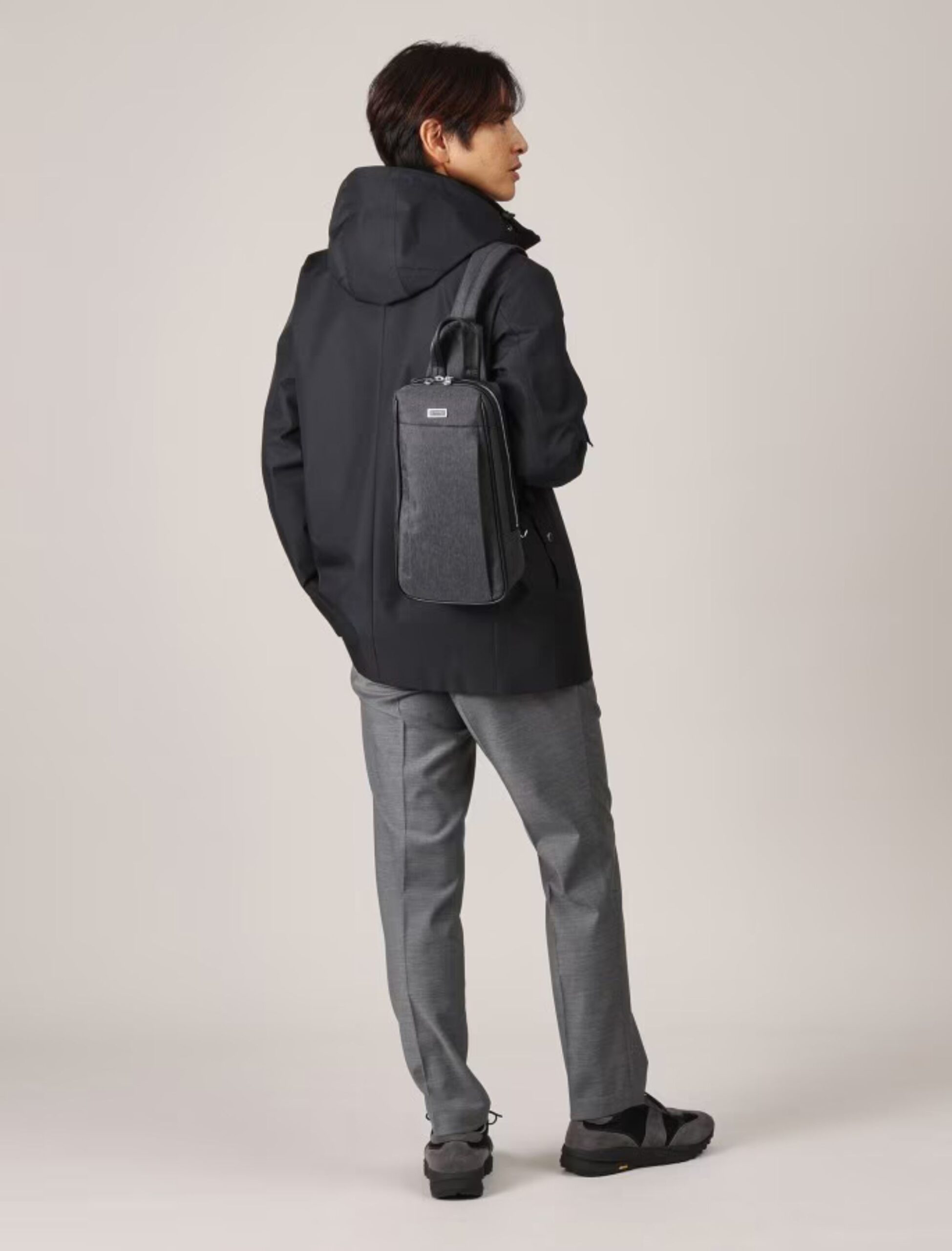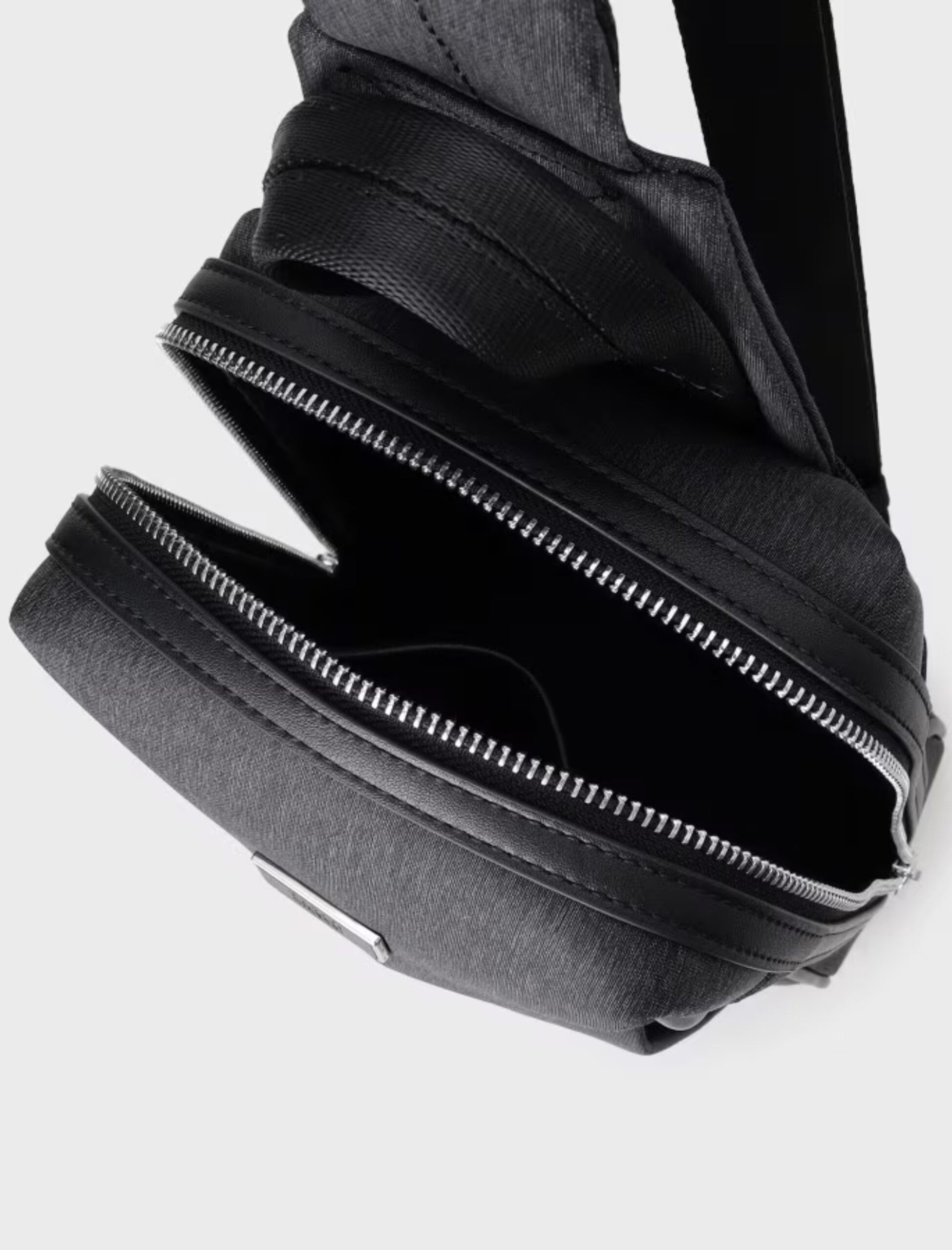 กระเป๋าสะพายข้างใบนี้ ผลิตจากผ้าใยสังเคราะห์ที่มีลวดลายแบบแฮร์ไลน์อย่างหรูหรา ตัวกระเป๋ามีดีไซน์เรียบง่ายและบางเฉียบ ช่วยขับเน้นความสวยงามของเนื้อผ้าได้เป็นอย่างดี แผ่นโลโก้บริเวณด้านหน้าทำจากโลหะผสมหนัง เพิ่มความหรูหราลงตัว ช่องกระเป๋าและห่วง D-ring ถูกออกแบบมาให้ใช้งานได้สะดวกทั้งสำหรับผู้ถนัดขวาและผู้ถนัดซ้าย สายสะพายสามารถปรับความยาวได้ เพื่อให้ใช้งานได้ทั้งแบบสะพายไหล่หรือสะพายข้าง (crossbody) ซิปกระเป๋ามาพร้อมหัวดึงแบบเฉพาะตัว แสดงให้เห็นถึงความใส่ใจในรายละเอียด ภายในกระเป๋ายังมีช่องสำหรับใส่ขวดน้ำหรือร่มพับ เพิ่มความเป็นระเบียบในการใช้งาน เนื้อผ้ามีคุณสมบัติกันน้ำ