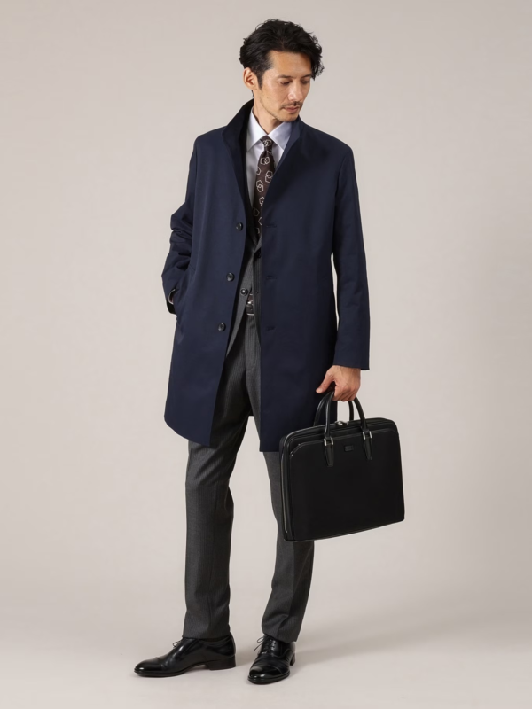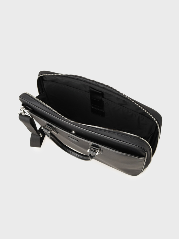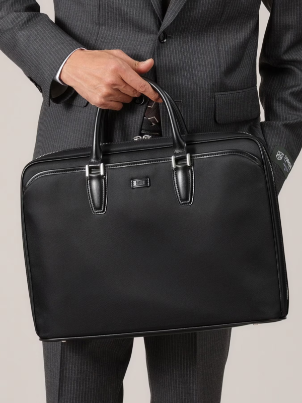 A business briefcase made of water-repellent synthetic material. Compatible with 15-inch laptops. The handle is made of genuine leather for durability.