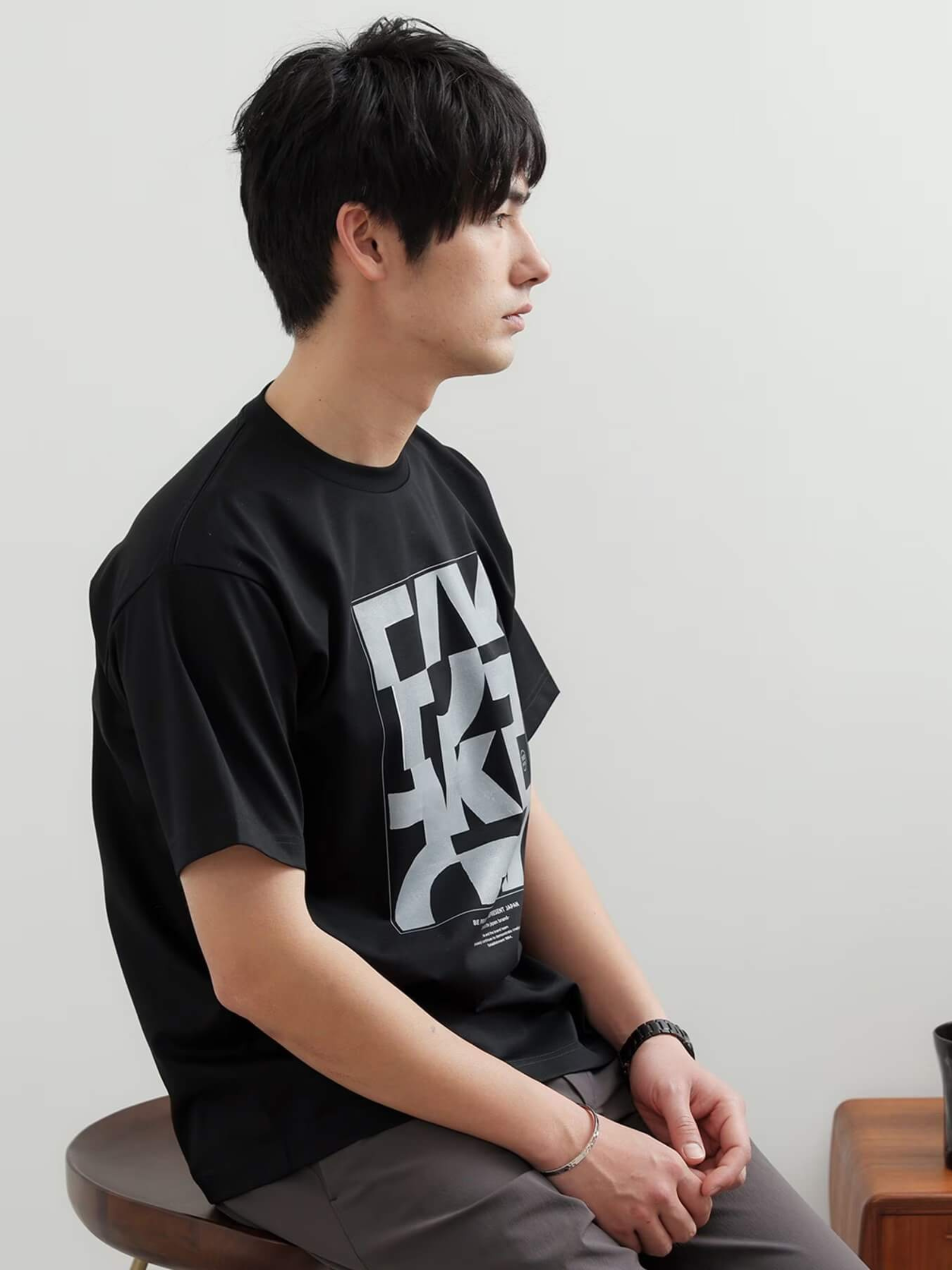 ตัวอักษร “TAKEO KIKUCHI” ถูกจัดเรียงแบบสุ่มคล้ายกับเกมสไลด์ปริศนาในอดีต สร้างลวดลายที่ดูมีเสน่ห์อย่างเป็นธรรมชาติและเรขาคณิตในเวลาเดียวกัน การพิมพ์ลายด้วยสีเดียว (โมโนโทน) ช่วยให้ได้ลุที่ดูเรียบหรูและสบาย