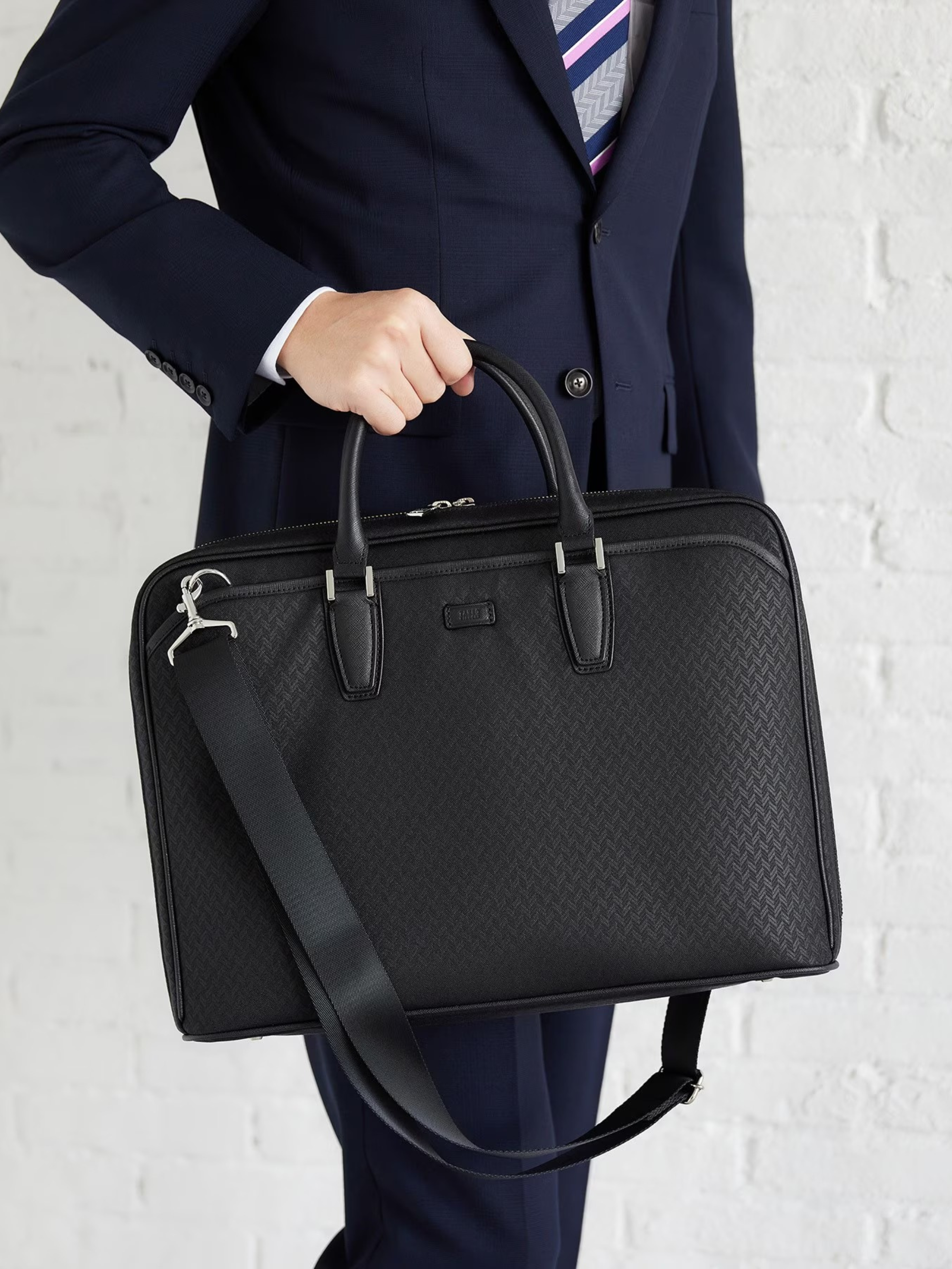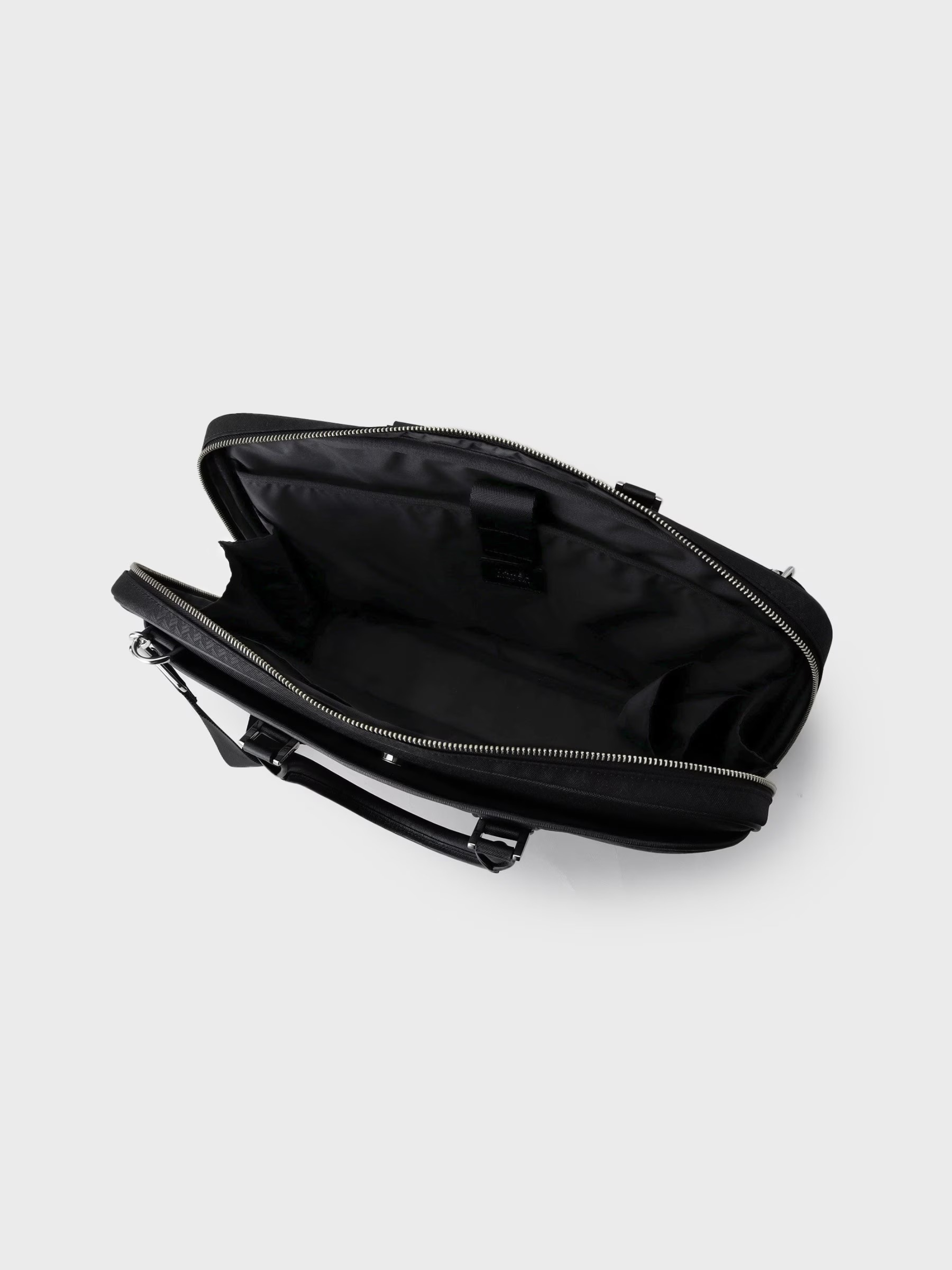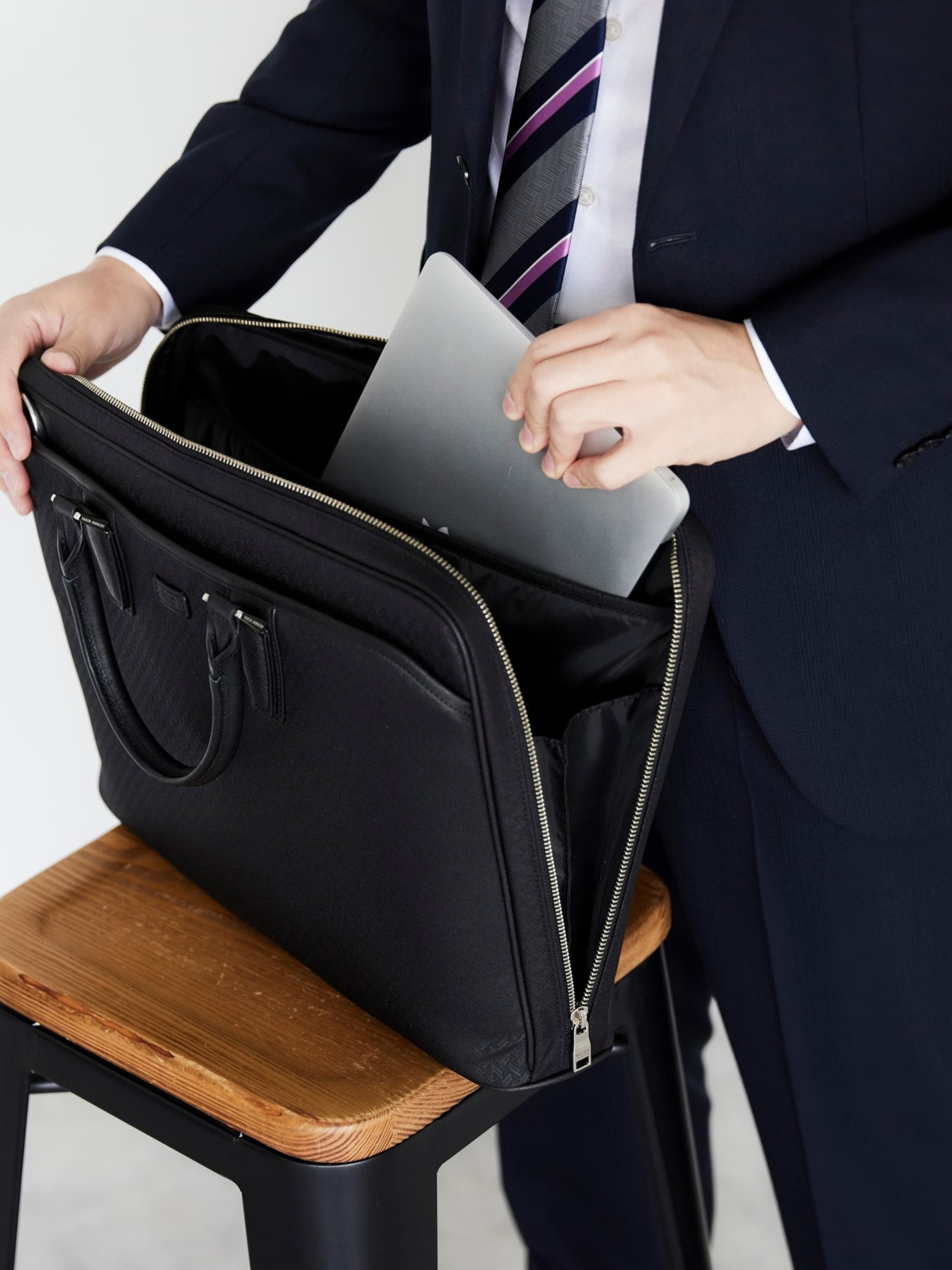 A business briefcase made of water-repellent synthetic material. Compatible with 15-inch laptops. The handle is made of genuine leather for durability.
