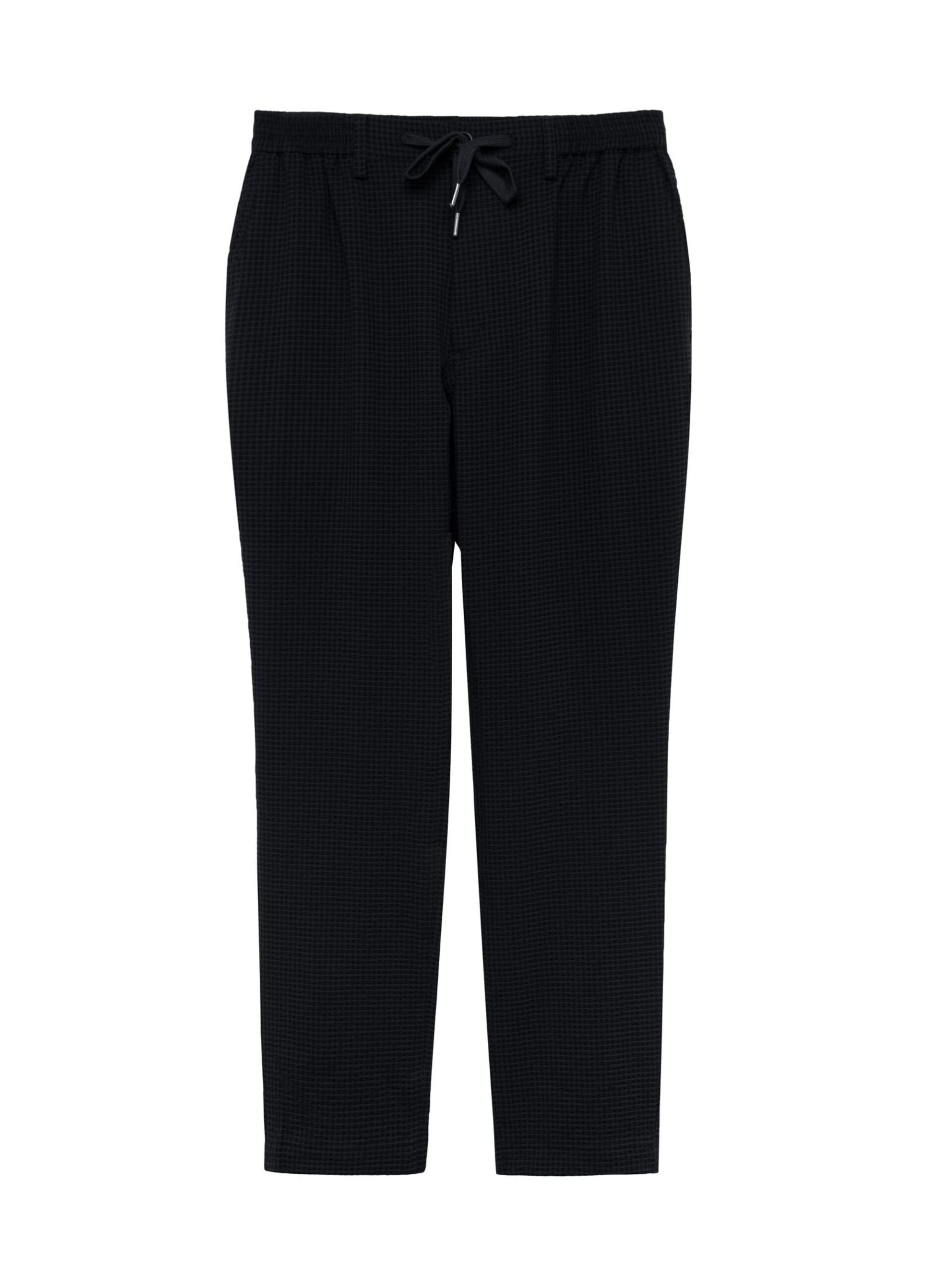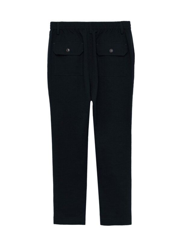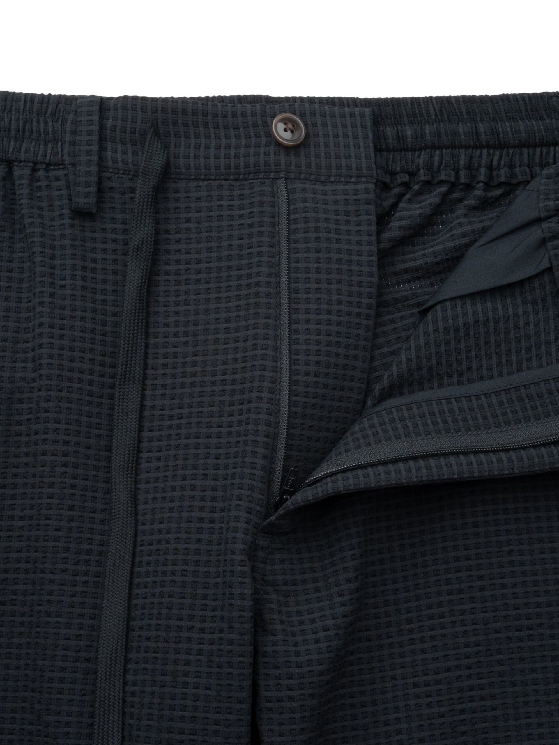 The Easy Pants are made from Polyester Primeflex, a two-way stretch fabric that is soft and comfortable to wear. For this version, the brand has selected Sucker fabric, known for its unique texture, excellent breathability, and wrinkle resistance. The fabric pattern resembles a Checkered Pattern (Seasonal Concept) but has been refined into a smaller scale for a more sophisticated look suited to gentlemen.