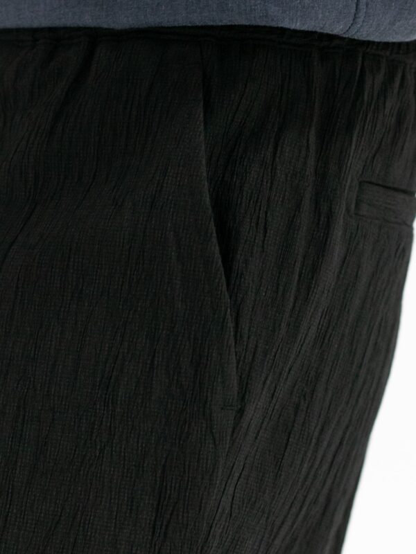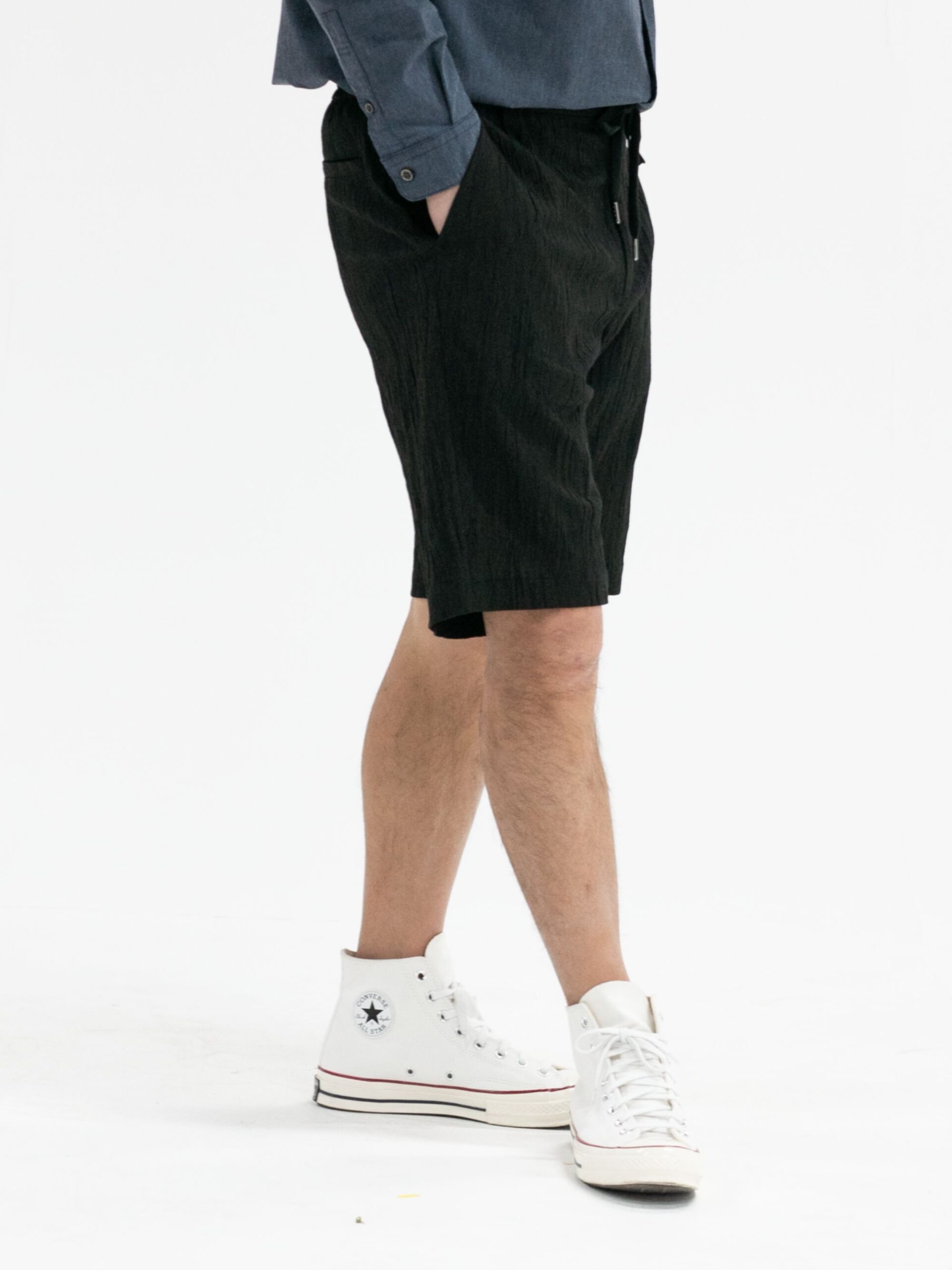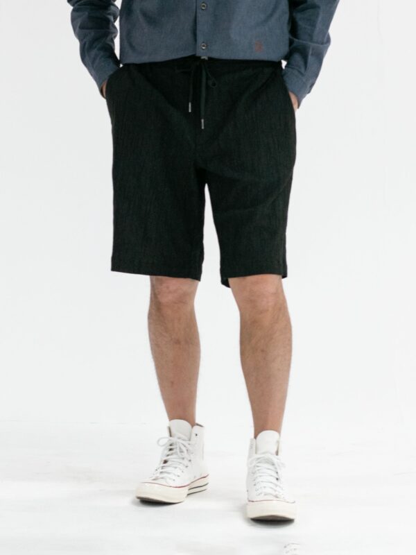 กางเกงขาสั้นประมาณเข่า เป็นกางเกง easy short pants ขอบเอวเป็นยางยืด และมีเชือกรูดสามารถปรับความกว้างได้ ตามคอนเซปท์ของ season นี้ ที่ต้องการสื่อให้เห็นถึง outdoorwear มีการเพิ่มกระเป๋าทางด้านขวา เป็นกระเป๋าซิปซ่อนสำหรับเก็บของสำคัญ เนื้อผ้าของกางเกงมี texture ที่เกิดจากด้ายยืน ดังนั้นจึงไม่ต้องห่วงเรื่องการรีด