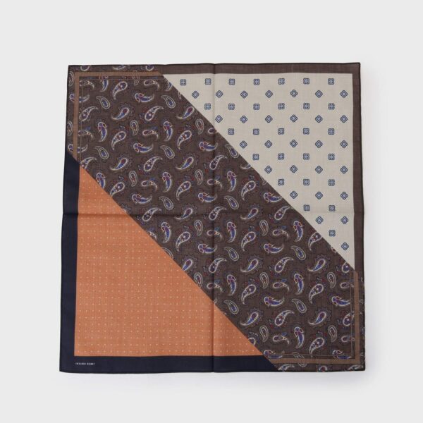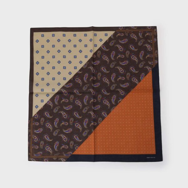 ผ้าเช็ดหน้าลายพิมพ์ที่มีลวดลายแบบเฉียง ประกอบด้วยจุด ลายเพสลีย์ ลายเล็ก ๆ และลายแบบดั้งเดิม เนื้อผ้านุ่ม ใส่สบาย และมีขนาดพอเหมาะที่จะใช้เป็นผ้าพันคอ จุดเด่นคือการสลับลวดลายให้มองเห็นเฉพาะลายเพสลีย์เมื่อใช้เป็นผ้าพันคอ ทำให้ง่ายต่อการแมตช์กับการแต่งตัว