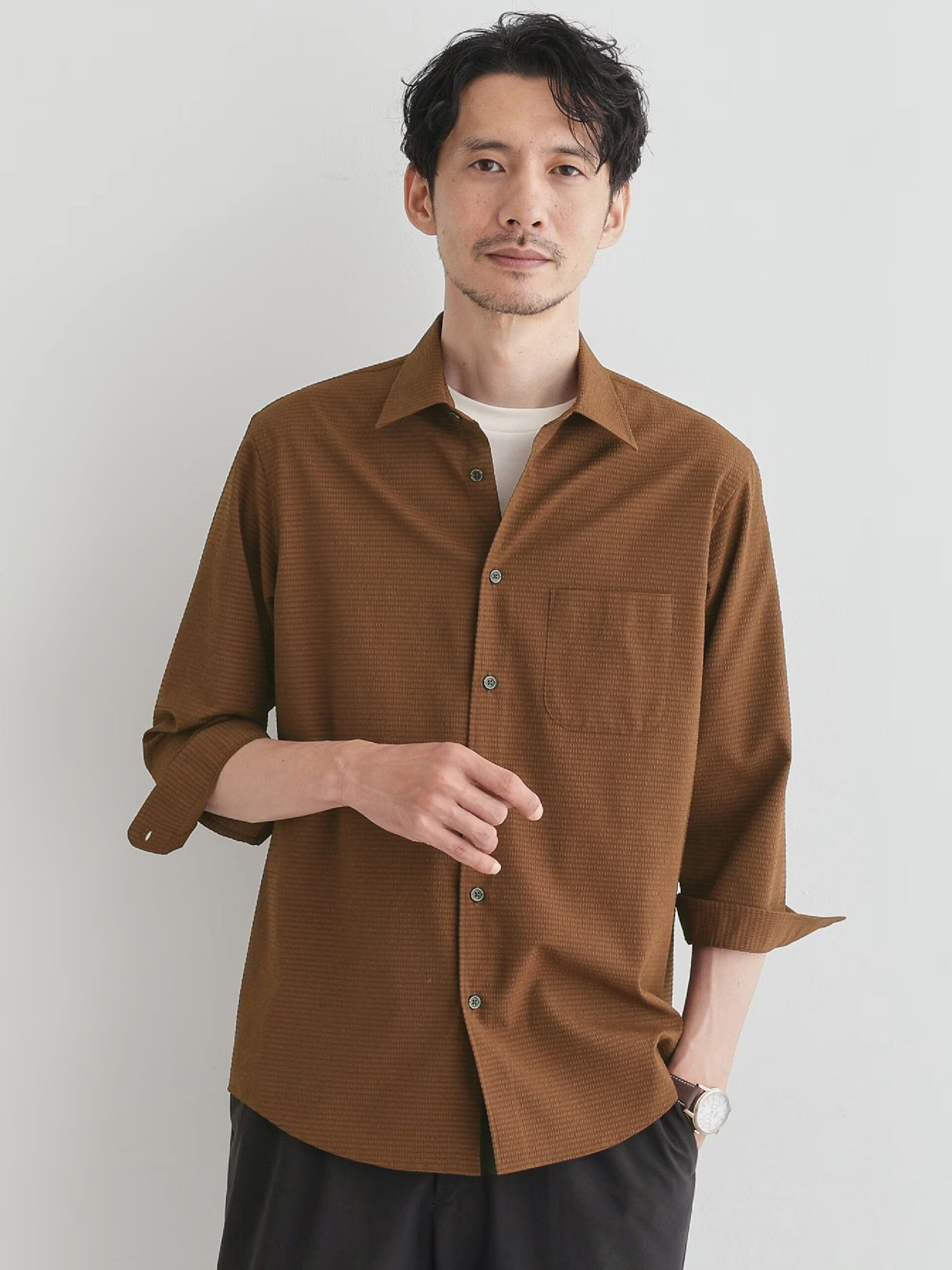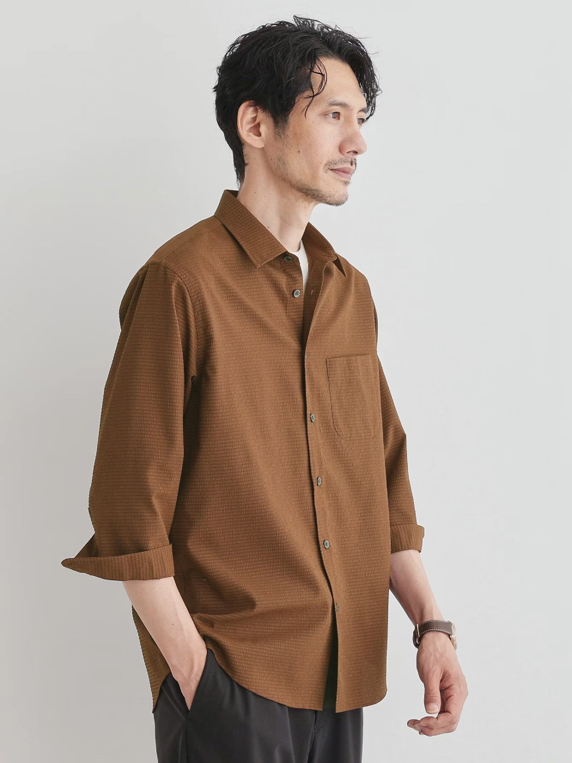 เสื้อเชิ้ตแขนสามส่วนนี้ตัดเย็บจากผ้าฟังก์ชันน้ำหนักเบา “DotAir” ของ TORAY ในเวอร์ชัน Seersucker ที่มีรูระบายอากาศขนาดเล็กในเนื้อผ้า จึงเหมาะอย่างยิ่งกับอากาศร้อนชื้นในช่วงซัมเมอร์ ผ้า Seersucker ยังช่วยลดการสัมผัสกับผิวโดยตรง ทำให้ใส่สบายมากขึ้น มีกระเป๋าอก 1 ช่อง
