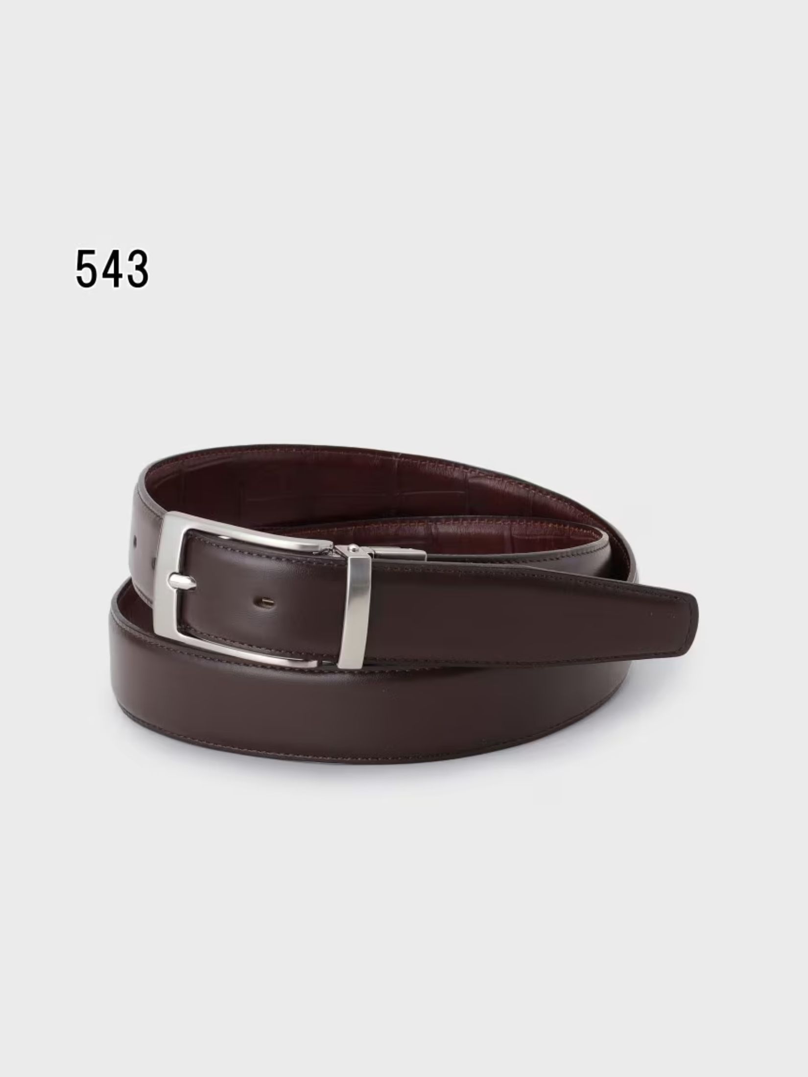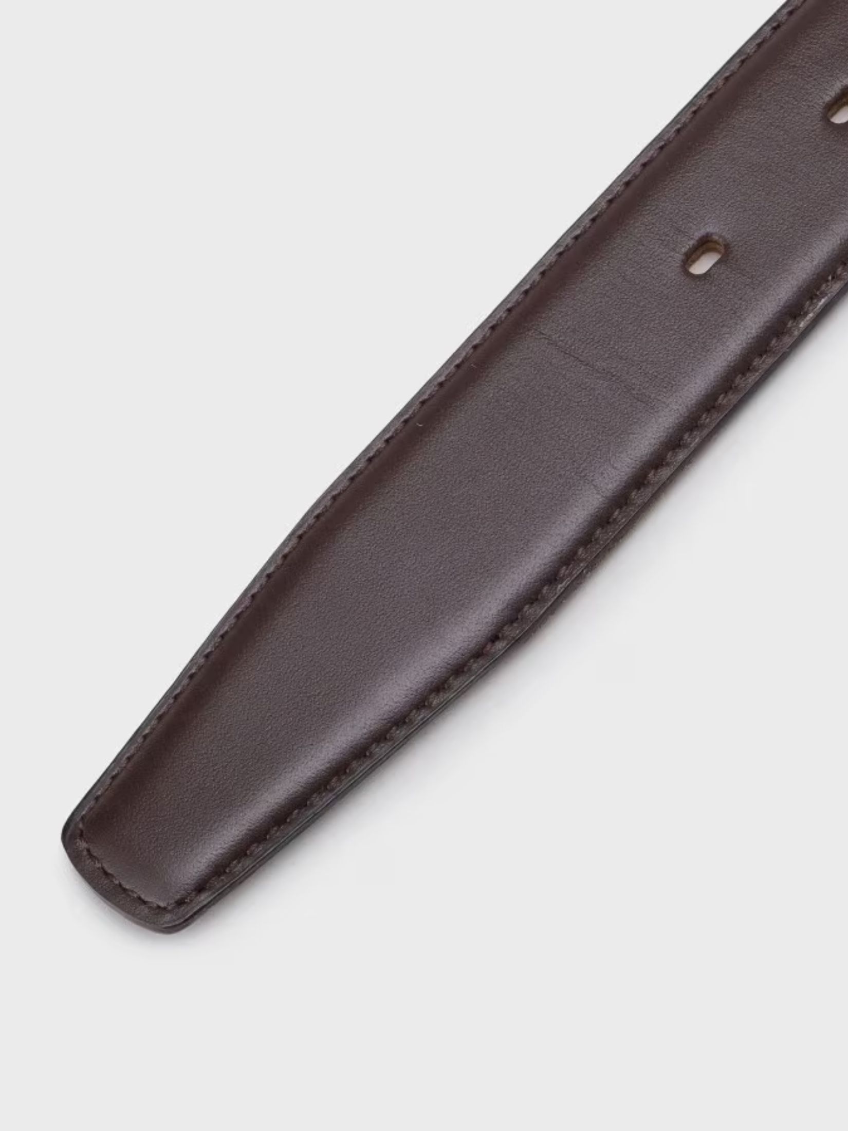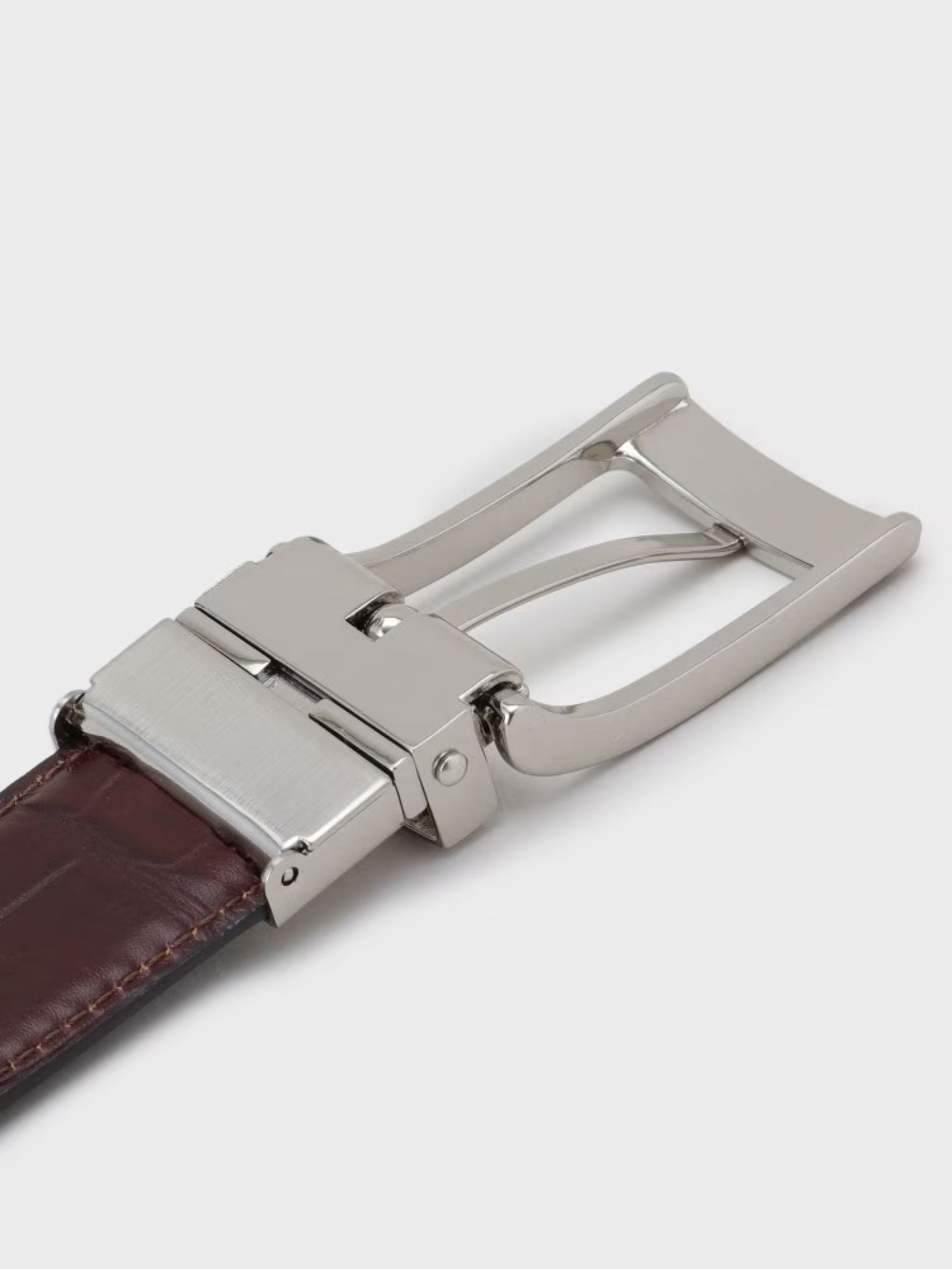 เข็มขัดแบบกลับด้านได้ (Reversible Belt) มาพร้อมดีไซน์เรียบหรูด้านหนึ่งเป็นผิวเรียบเรียบง่าย อีกด้านหนึ่งเป็นลายปั๊มหนังจระเข้ที่ให้ความรู้สึกหรูหราและมีเอกลักษณ์ หัวเข็มขัดทรง Omega สามารถปรับความยาวได้ง่าย เพียงตัดให้พอดี เหมาะอย่างยิ่งสำหรับเป็นของขวัญ