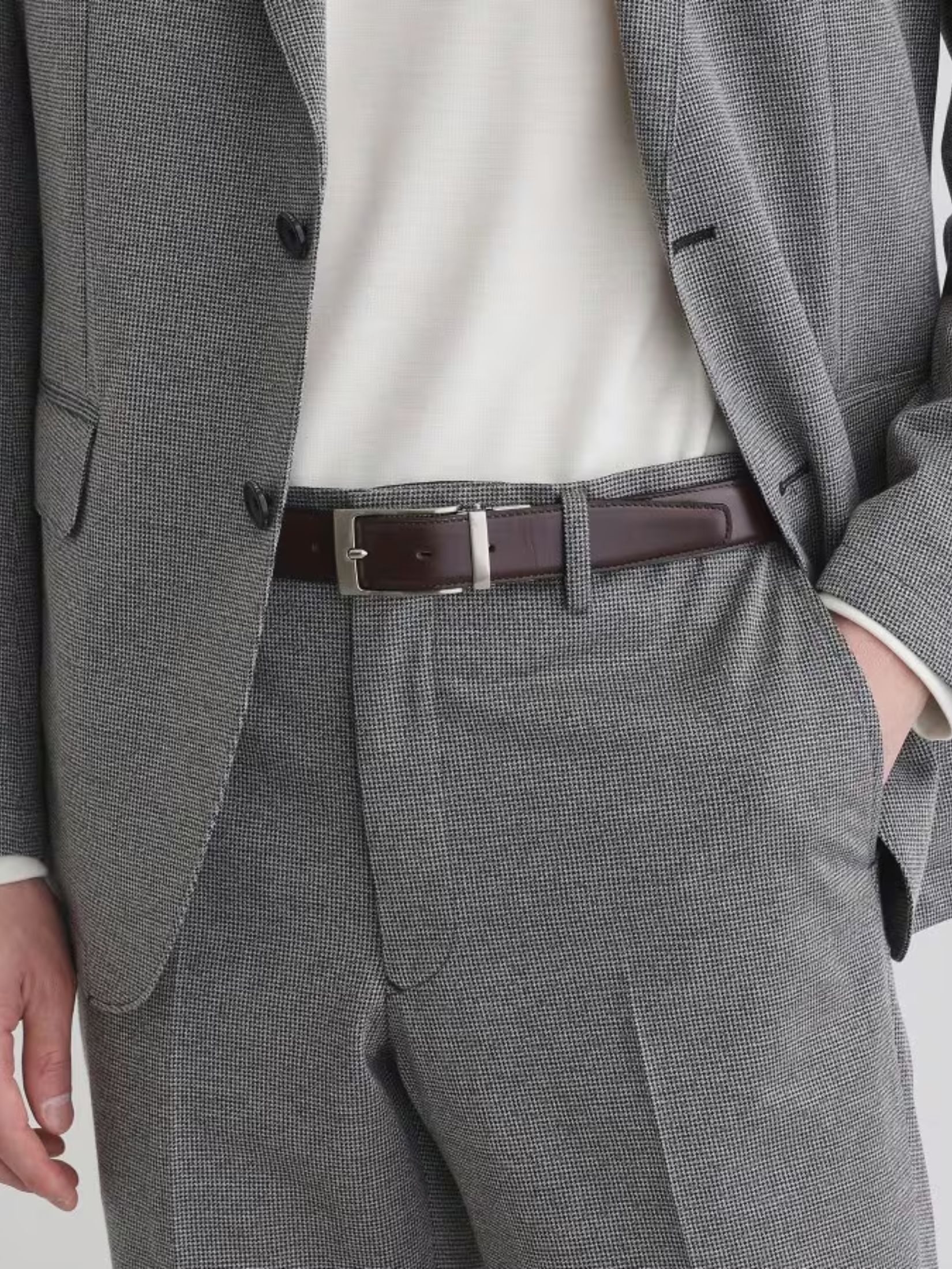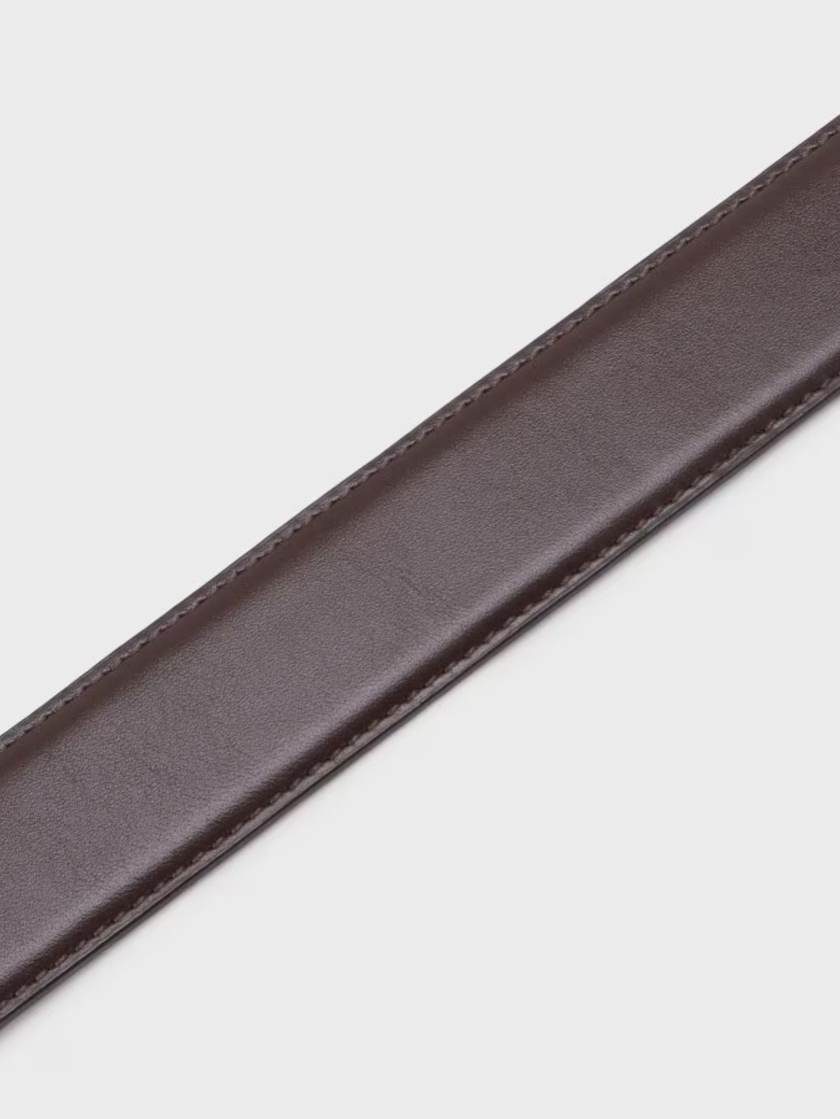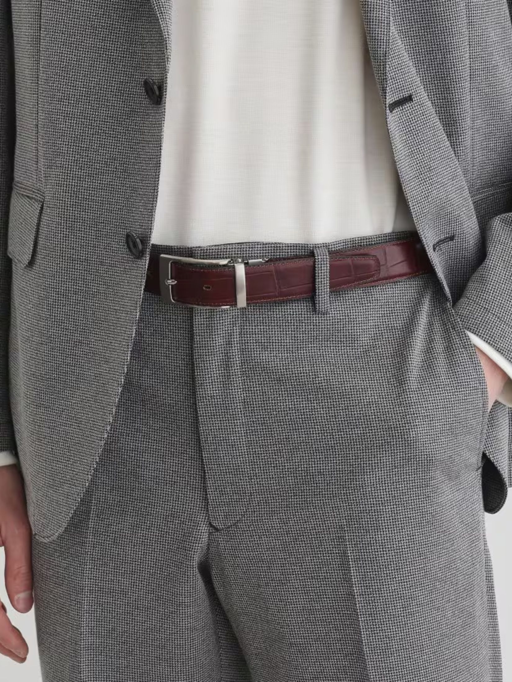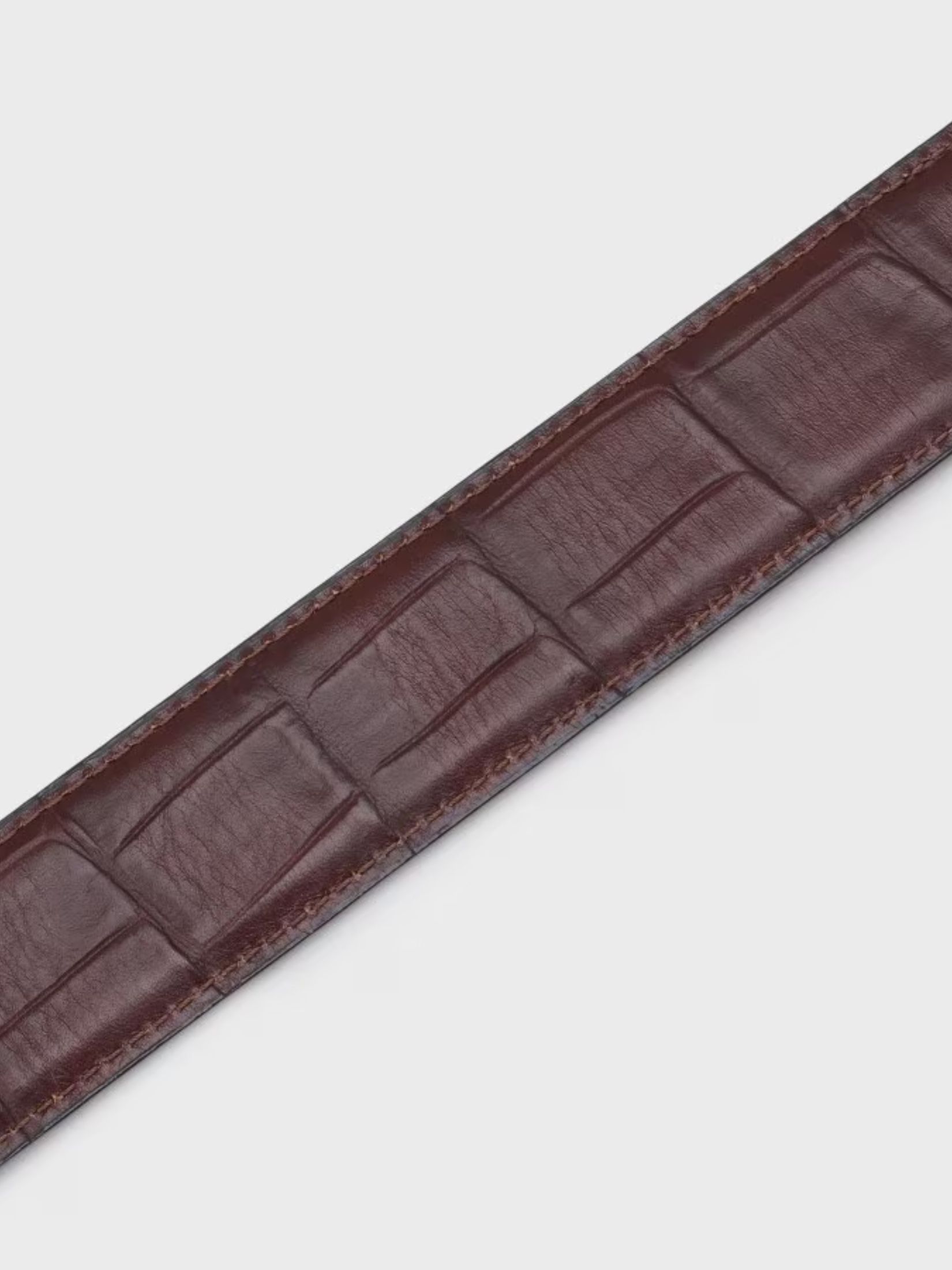 เข็มขัดแบบกลับด้านได้ (Reversible Belt) มาพร้อมดีไซน์เรียบหรูด้านหนึ่งเป็นผิวเรียบเรียบง่าย อีกด้านหนึ่งเป็นลายปั๊มหนังจระเข้ที่ให้ความรู้สึกหรูหราและมีเอกลักษณ์ หัวเข็มขัดทรง Omega สามารถปรับความยาวได้ง่าย เพียงตัดให้พอดี เหมาะอย่างยิ่งสำหรับเป็นของขวัญ
