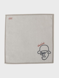 ผ้าเช็ดหน้าผ้าขนหนูพิมพ์ลายสไตล์ศิลปะ พร้อมภาพวาดพอร์เทรตของ Take-sensei ซึ่งเป็นชื่อเดียวกับแบรนด์ เนื้อผ้ามีพื้นผิวเรียบเนียน ไม่มีความขรุขระ ทำให้สามารถพิมพ์ลวดลายและภาพถ่ายได้อย่างสวยงาม ด้านหนึ่งของผ้าออกแบบให้เป็นผ้าเช็ดทำความสะอาดพกพา สามารถใช้เช็ดทำความสะอาดได้สะดวก แม้ขณะเดินทาง