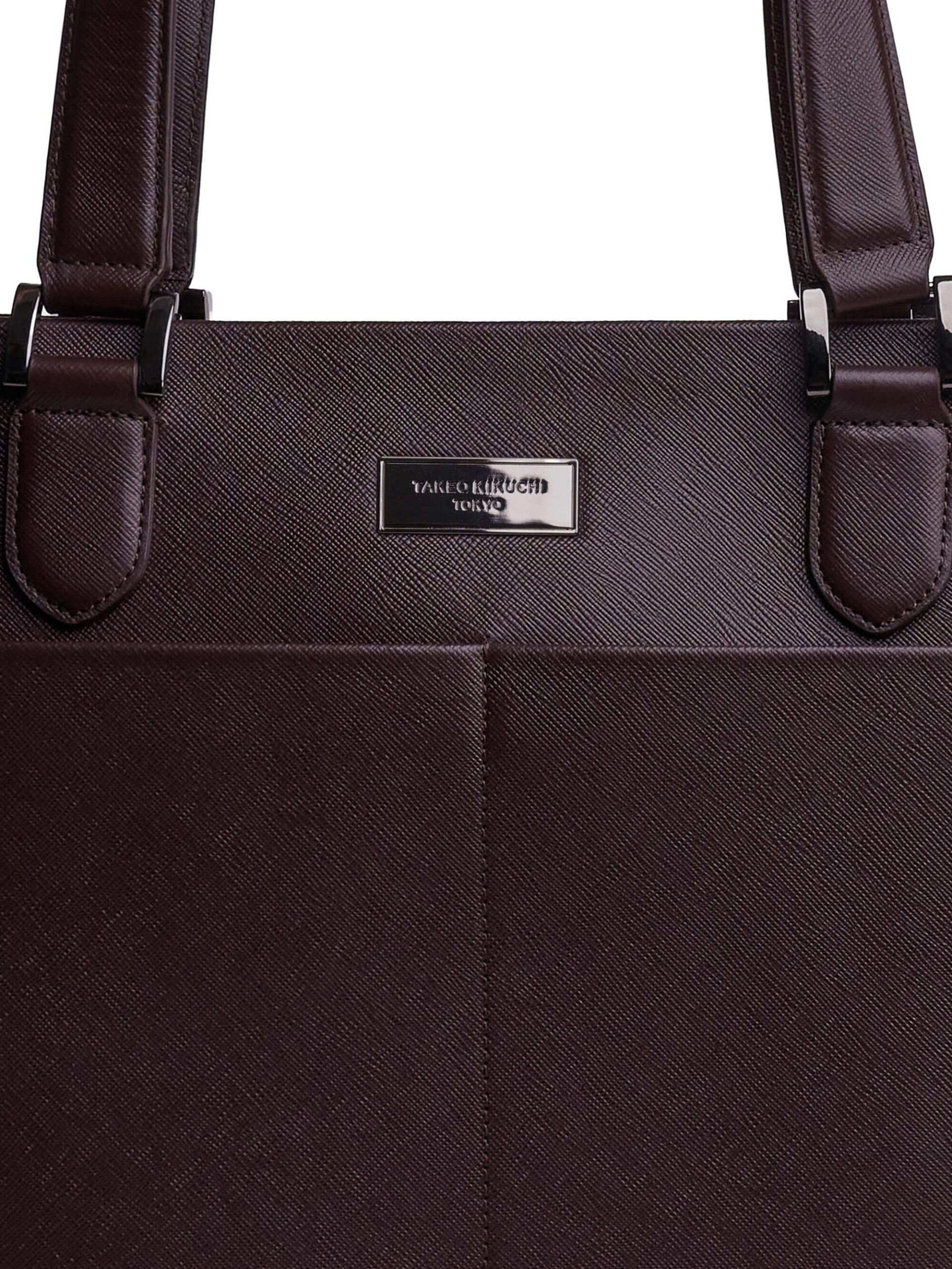 กระเป๋าโท้ท สำหรับใช้ได้ทุกโอกาสทั้งวันทำงานและวันสบาย ๆ ผลิตจากหนังแท้ลาย Saffiano ทั้งใบ ทำให้ดีไซน์ดูเรียบหรู ช่วงบนติดโลโก้โลหะรมดำ สลักโลโก้ TAKEO KIKUCHI