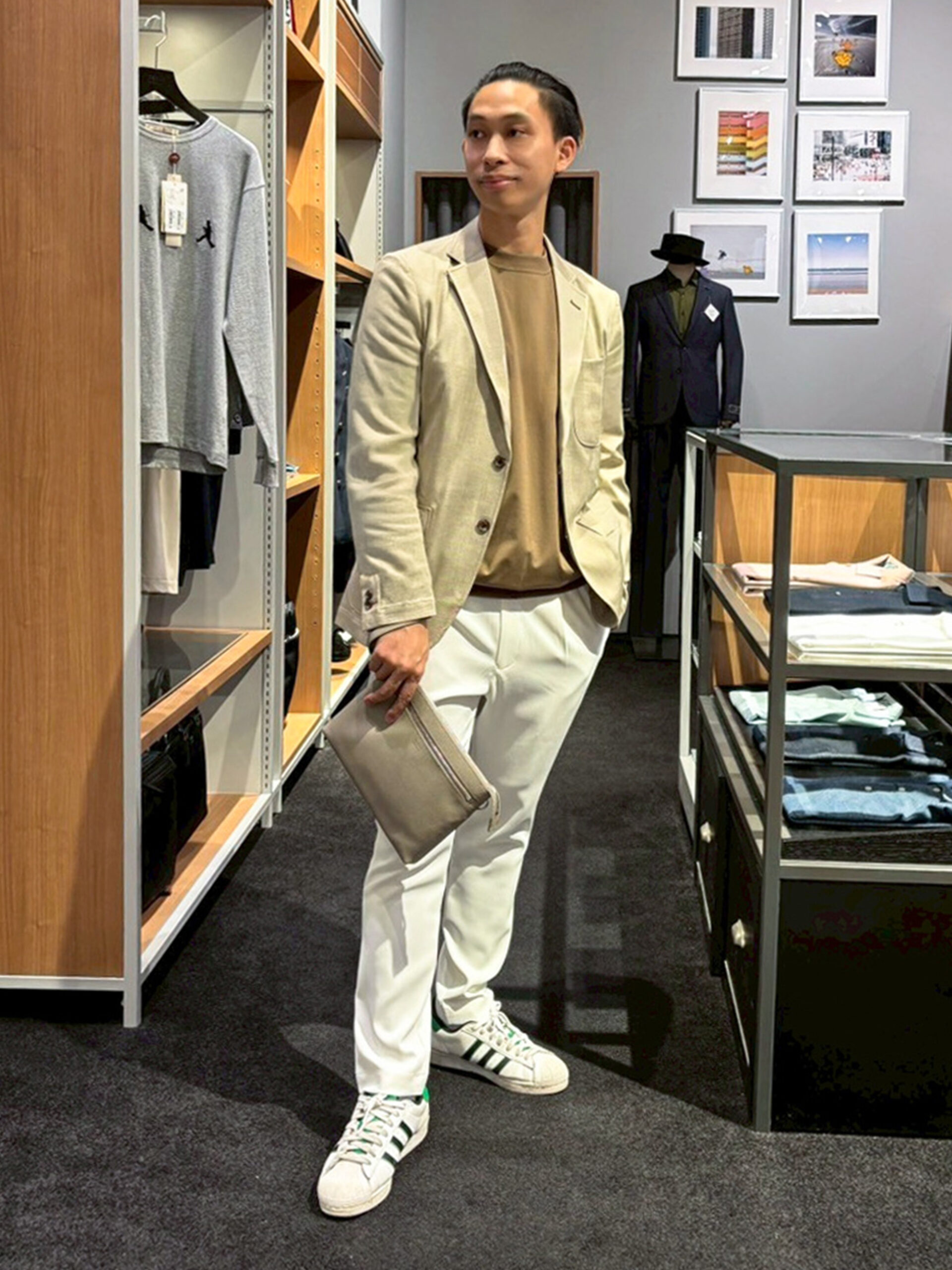 สร้างเลเยอร์ด้วยเสื้อ Blazer สีเบจ รุ่น ‘ECO DENIM STRETCH BLAZER’ ที่ผลิตจากเส้นใย Polyeser ผสมเส้นใย Tencel และ Triacetate ที่เป็นใยผ้าธรรมชาติ ให้ความรู้สึกใส่สบาย นุ่ม ยับยาก ทักทอให้มีลายคล้ายผ้าเดนิม ให้ลุคดูมีความทางการแต่ก็มีความขี้เล่น ไม่เป็นทางการจนเกินไป ขนาดที่ใส่เป็น Size: 02/M รอบอก 109 cm., ความยาวเสื้อ 70 cm., ไหล่กว้าง 45.5 cm, ความยาวแขน 61 cm.