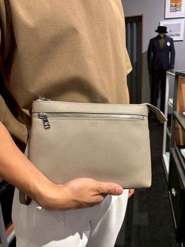 และกระเป๋า Clutch หนังแท้ สีเบจ รุ่น BEIGE LEATHER CLUTCH BAG นำเข้าจากประเทศญี่ปุ่น ที่ให้ความคล่องตัว ดูดี โดยมีสายคล้องมือ และสายสะพายที่สามารถคล้องเป็นกระเป๋าสะพายและนำออกได้ ความยาวสายสะพาย 74.5-142.5cm. น้ำหนักกระเป๋า 330 g.