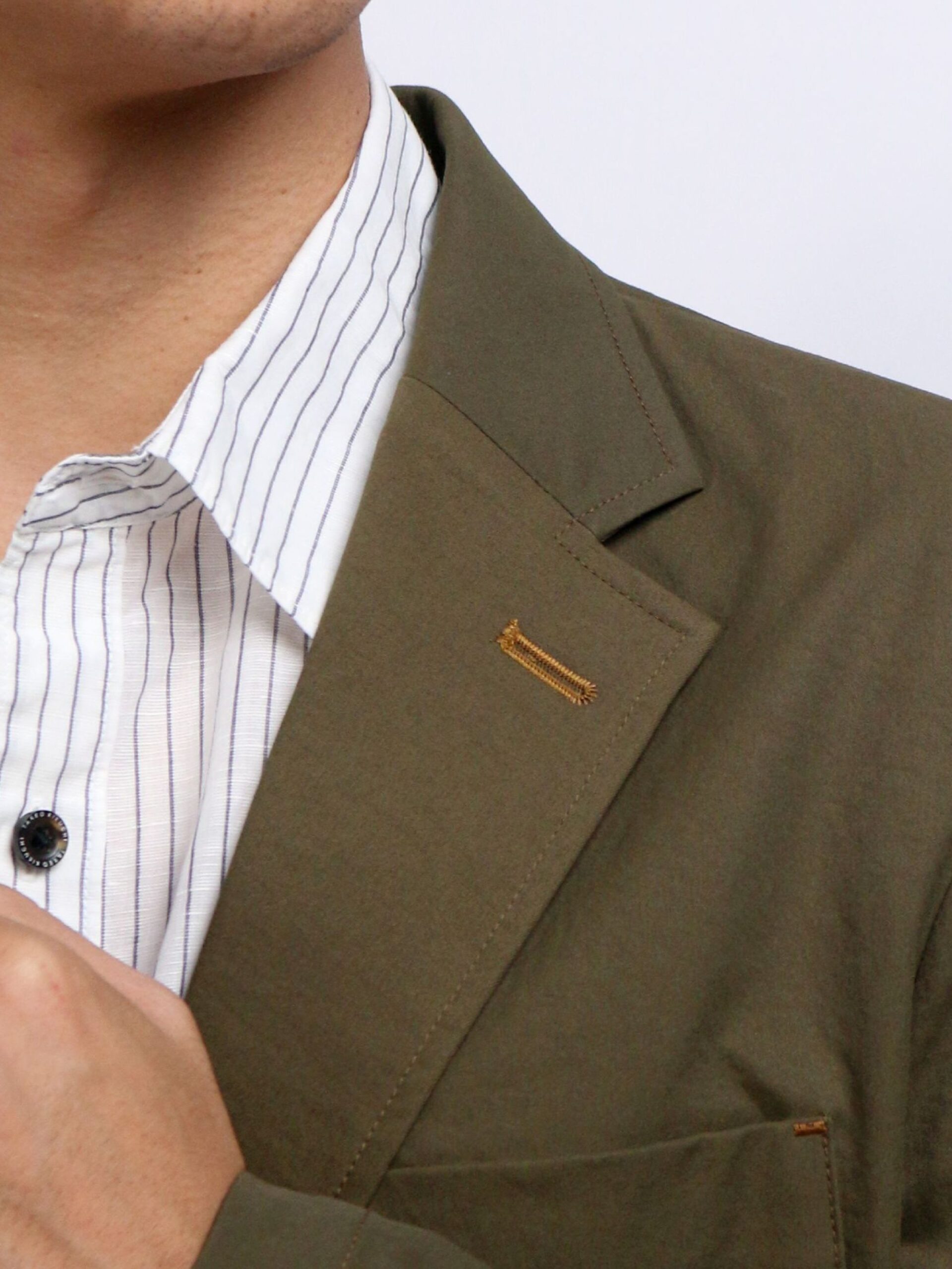แจ็คเก็ตสูท ผ้า Polyester Primeflex under veil คุณสมบัติเด่นคือ ป้องกันรังสี UV, Cool touch และ Quickdry เนื้อผ้ามีความเบา และดู Causual ตัวแจ็กเก็ตจะไม่รัดช่วงเอว (เหมือนงาน Bishu) ผ่าหลัง มีกระเป๋าปะที่เอวและอก มีการเล่น Tacking ที่บริเวณปากกระเป๋า และรังดุม