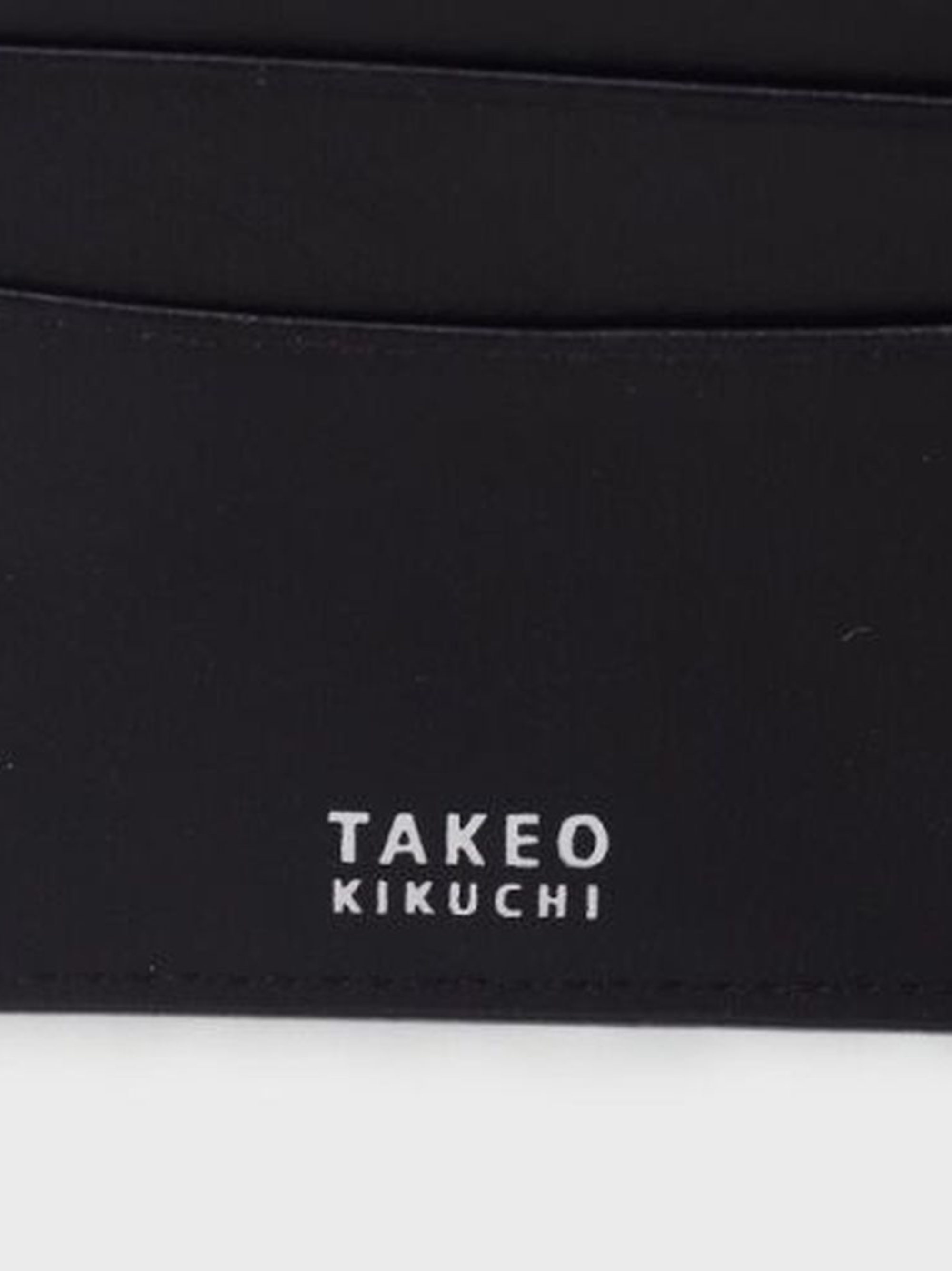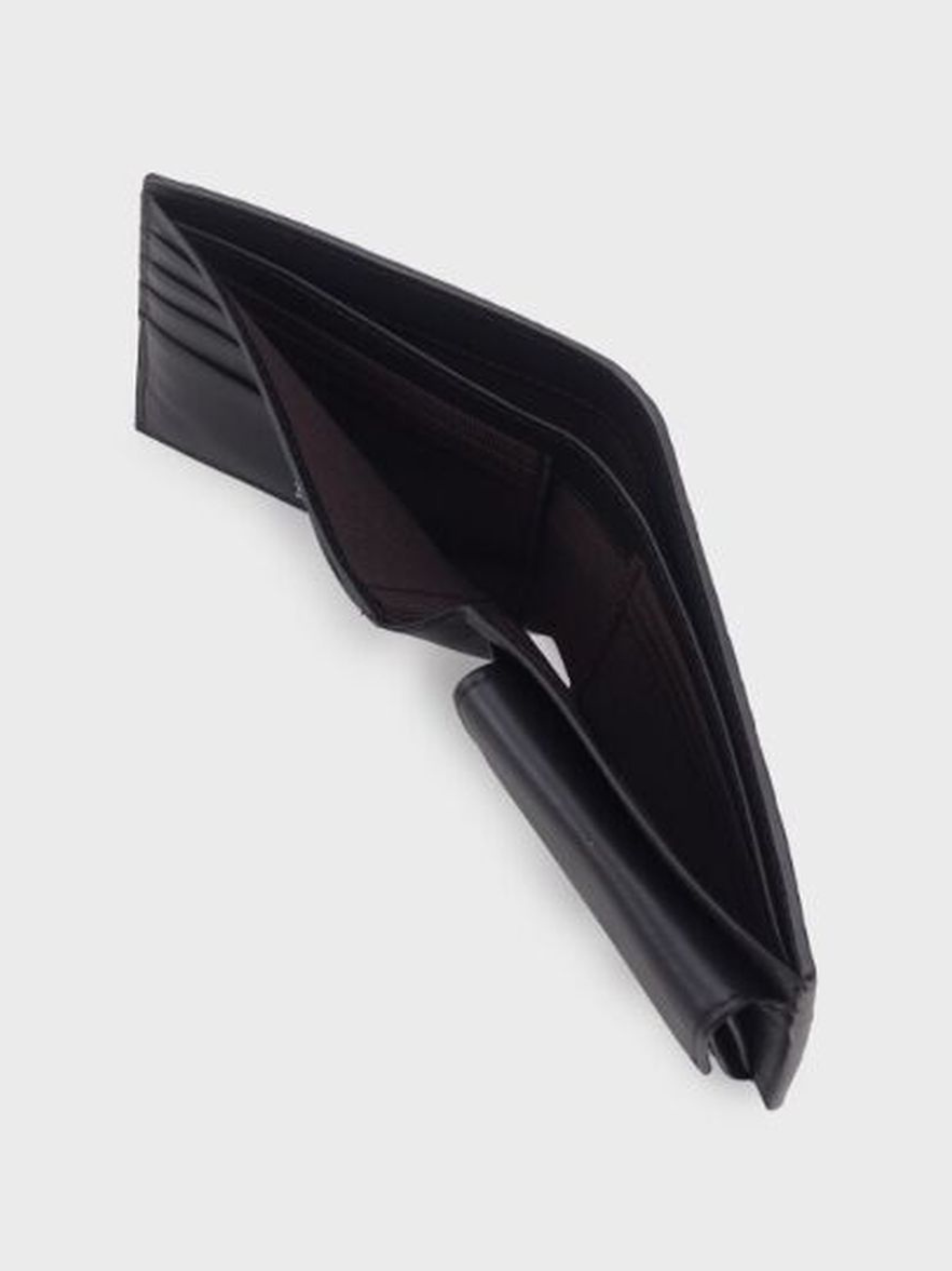 A bi-fold wallet with a line-shaped blocking design made of soft shrink and smooth Italian leather.