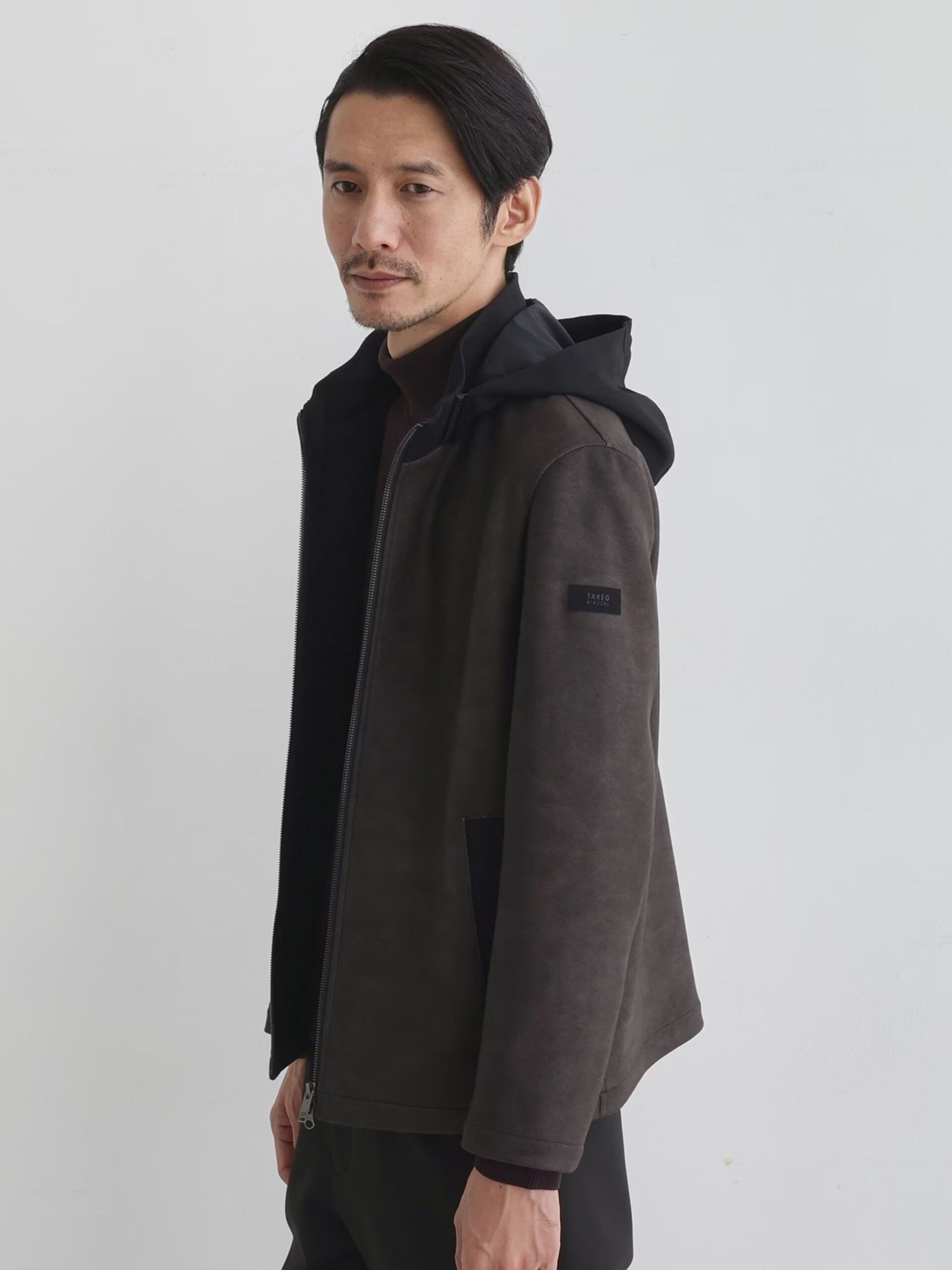 เสื้อแจ็คเก็ตนี้ทำจาก Down Fabric ซึ่งเป็นวัสดุที่มีคุณสมบัติการใช้งานหลากหลาย สามารถสวมเป็นแจ็กเก็ตน้ำหนักเบา หรือเป็นเลเยอร์ด้านในช่วงฤดูหนาวได้ จึงเป็นชิ้นที่ใช้งานได้อเนกประสงค์มาก พื้นผิวเนื้อผ้าสัมผัสนุ่มลื่นแบบหนังกลับ ให้ลุคที่ดูหรูหราและสุภาพ ฮู้ดสามารถถอดออกได้ ทำให้สวมใส่ได้ทั้งแบบพาร์กา หรือแบบคอตั้ง และเมื่อถอดฮู้ดออก จะช่วยให้แมตช์เป็นเลเยอร์ด้านในใต้โค้ทช่วงกลางฤดูหนาวได้ง่ายขึ้น
