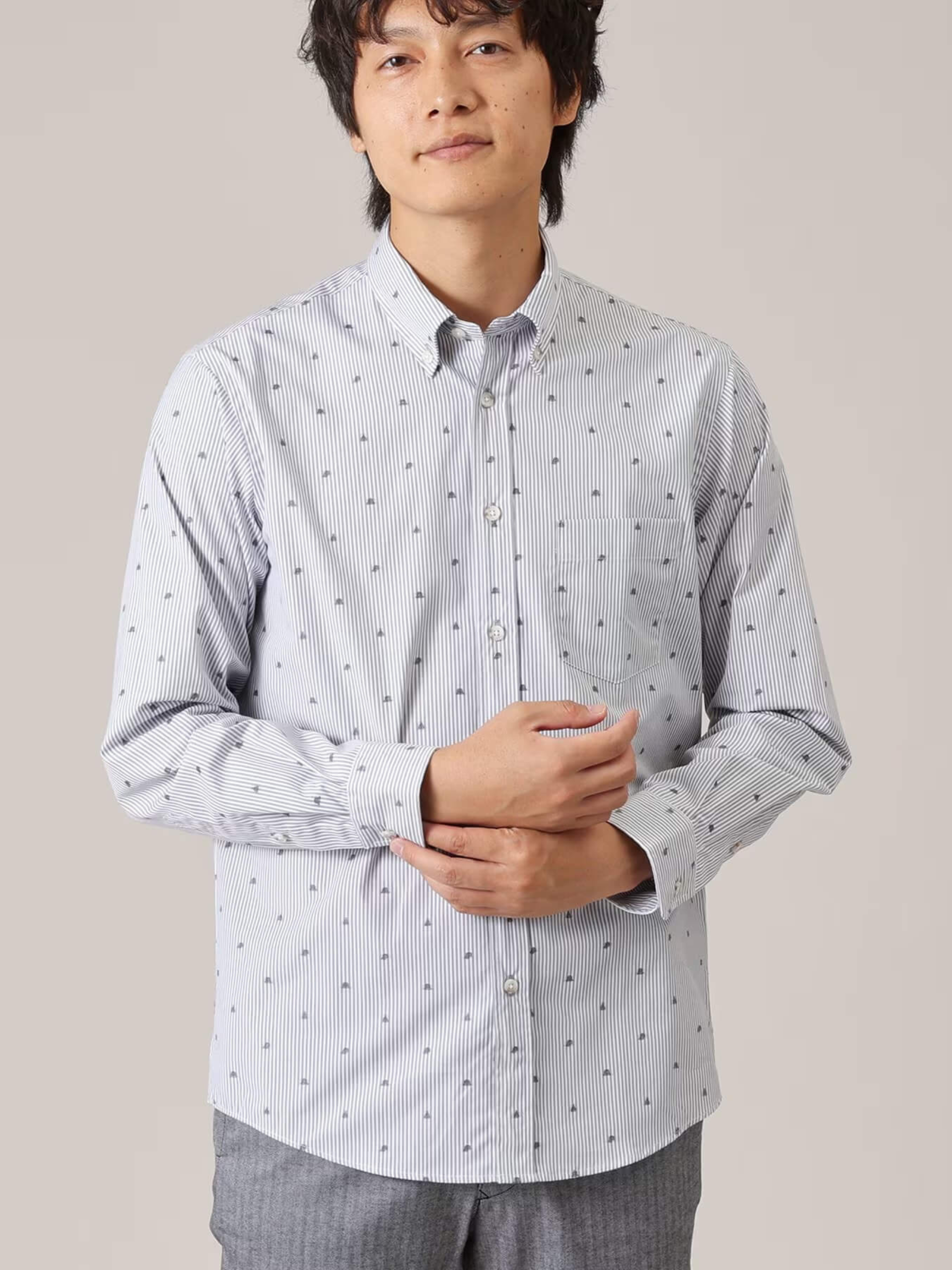 เสื้อเชิ้ตแขนยาว ทำจากผ้าลวดลายทั่วตัวสุดสนุก ผสมผสานระหว่างลายทางแบบลอนดอนดั้งเดิมกับไอคอนิกของ TAKEO KIKUCHI อย่างหมวกโบว์ลิ่ง หมวกเบสบอล และหมวกไหมพรม ซิลูเอตพื้นฐานที่สามารถจับคู่กับแจ็คเก็ตสำหรับลุคออฟฟิศแคชวลได้อย่างลงตัว