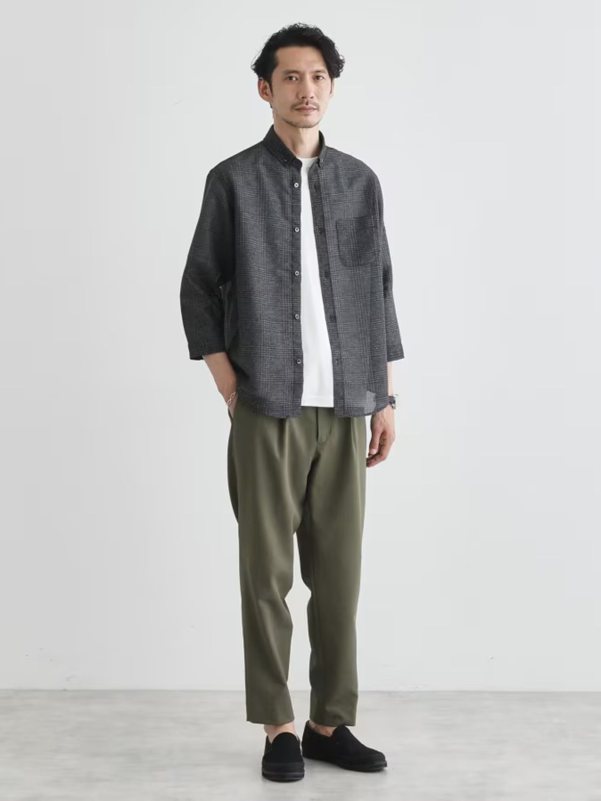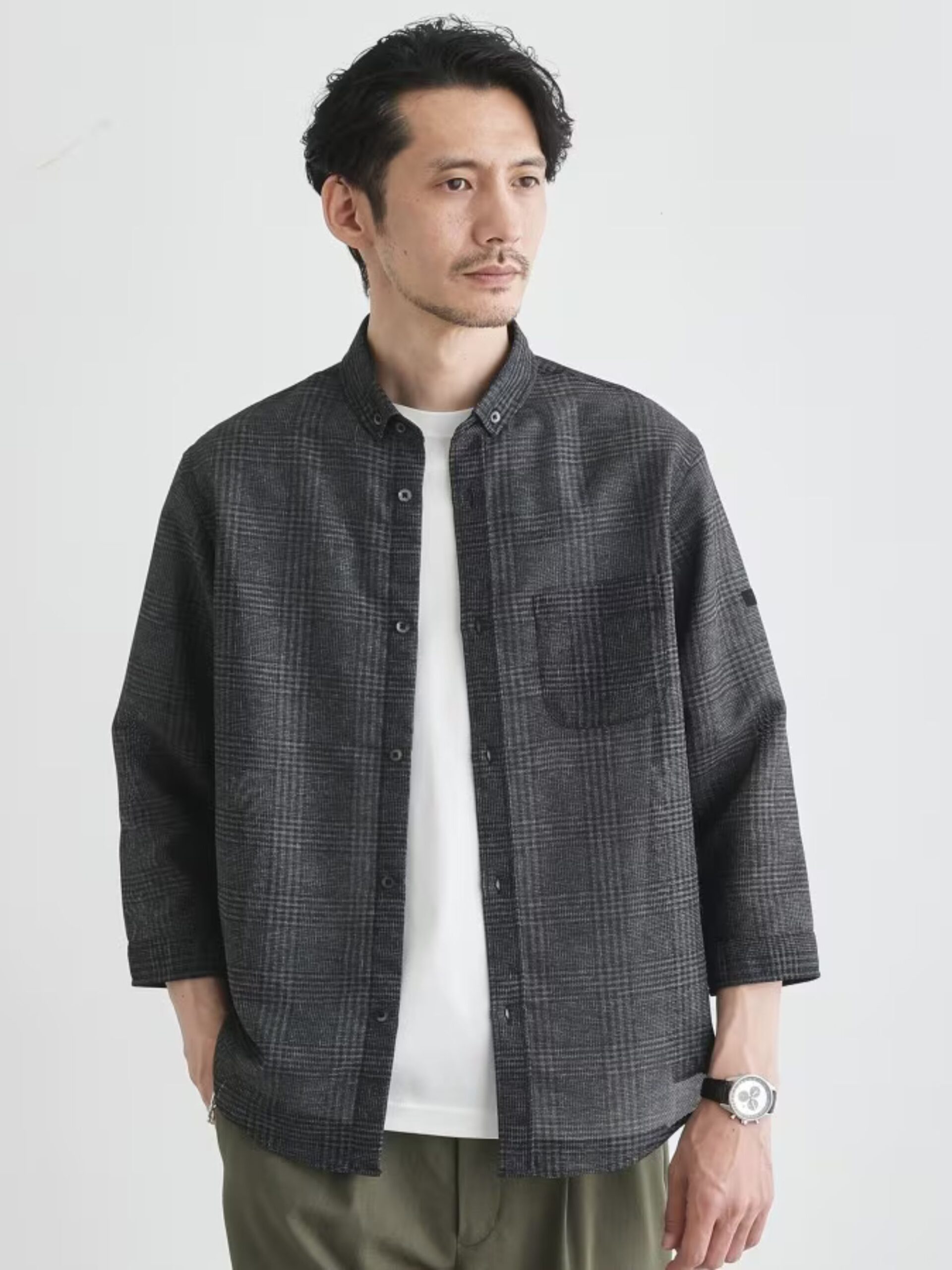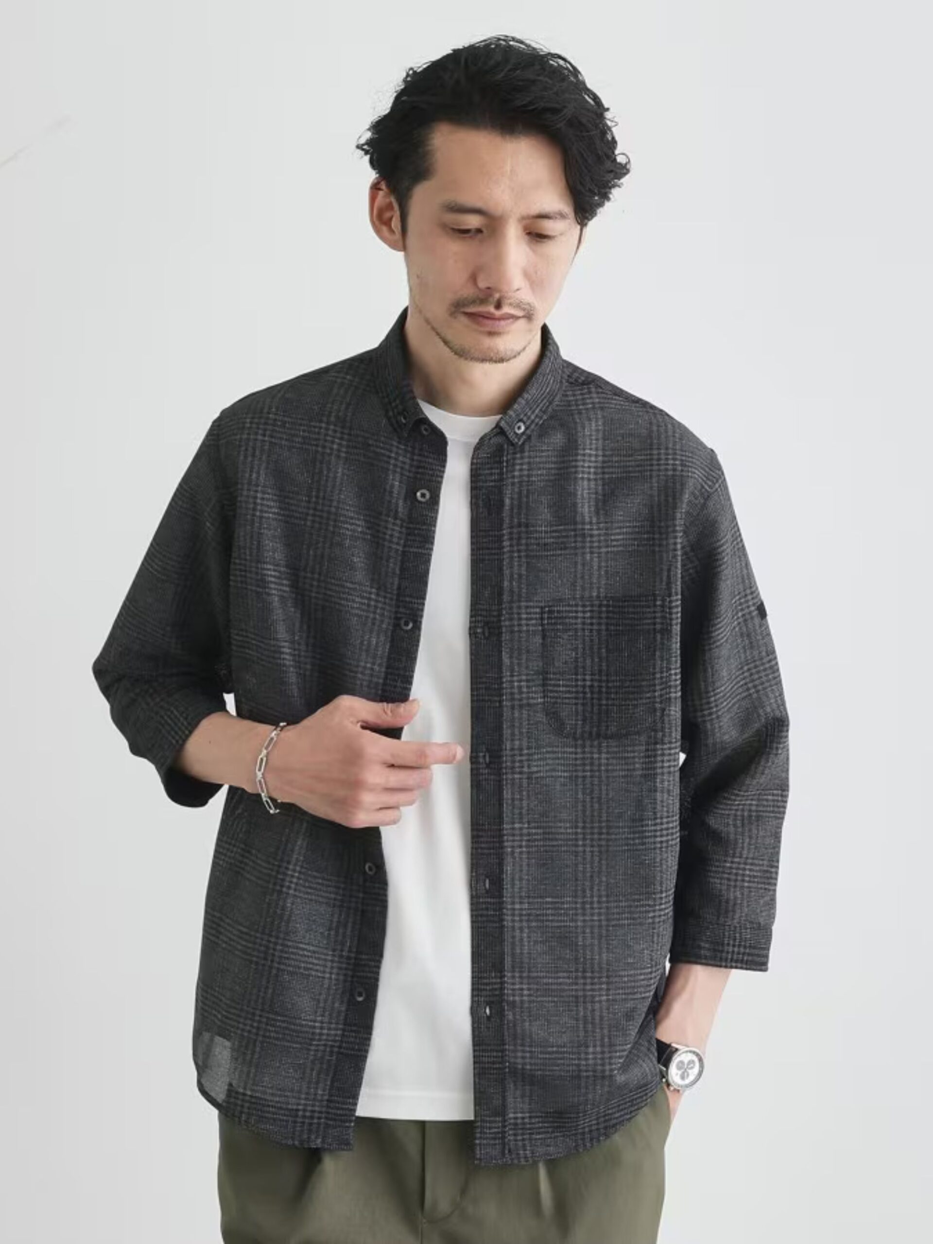 เสื้อเชิ้ตแขนสามส่วน ผลิตจากผ้าทวิล (Twill Weave) ให้สัมผัสแบบ Dry Touch และระบายอากาศได้ดี ทำให้รู้สึกสดชื่นและสวมใส่สบาย เหมาะอย่างยิ่งกับอากาศร้อนชื้นของญี่ปุ่น ดีไซน์ที่เรียบง่ายสะอาดตา ช่วยขับให้เห็นความโปร่งเบาของเนื้อผ้าและลายตารางที่ต่อเนื่องอย่างสวยงาม คอเสื้อแบบ Compact Button-down ให้ความรู้สึกคมเนี้ยบ แต่ดูเบากว่าคอเสื้อทั่วไป แขนสามส่วนออกแบบพร้อมปลายแขนที่สามารถพับขึ้นได้ง่าย สะดวกต่อการปรับอุณหภูมิให้เหมาะกับสภาพอากาศเสื้อตัวนี้สามารถสวมทับเสื้อยืดหรือเสื้อคัตแอนด์โซว์ได้อย่างมีสไตล์ เหมาะกับช่วงต้นฤดูร้อนที่อุณหภูมิแตกต่างระหว่างเช้าและเย็น รวมถึงช่วยบังแดดและใส่ได้อย่างสบายในอาคารช่วงกลางวันของหน้าร้อน