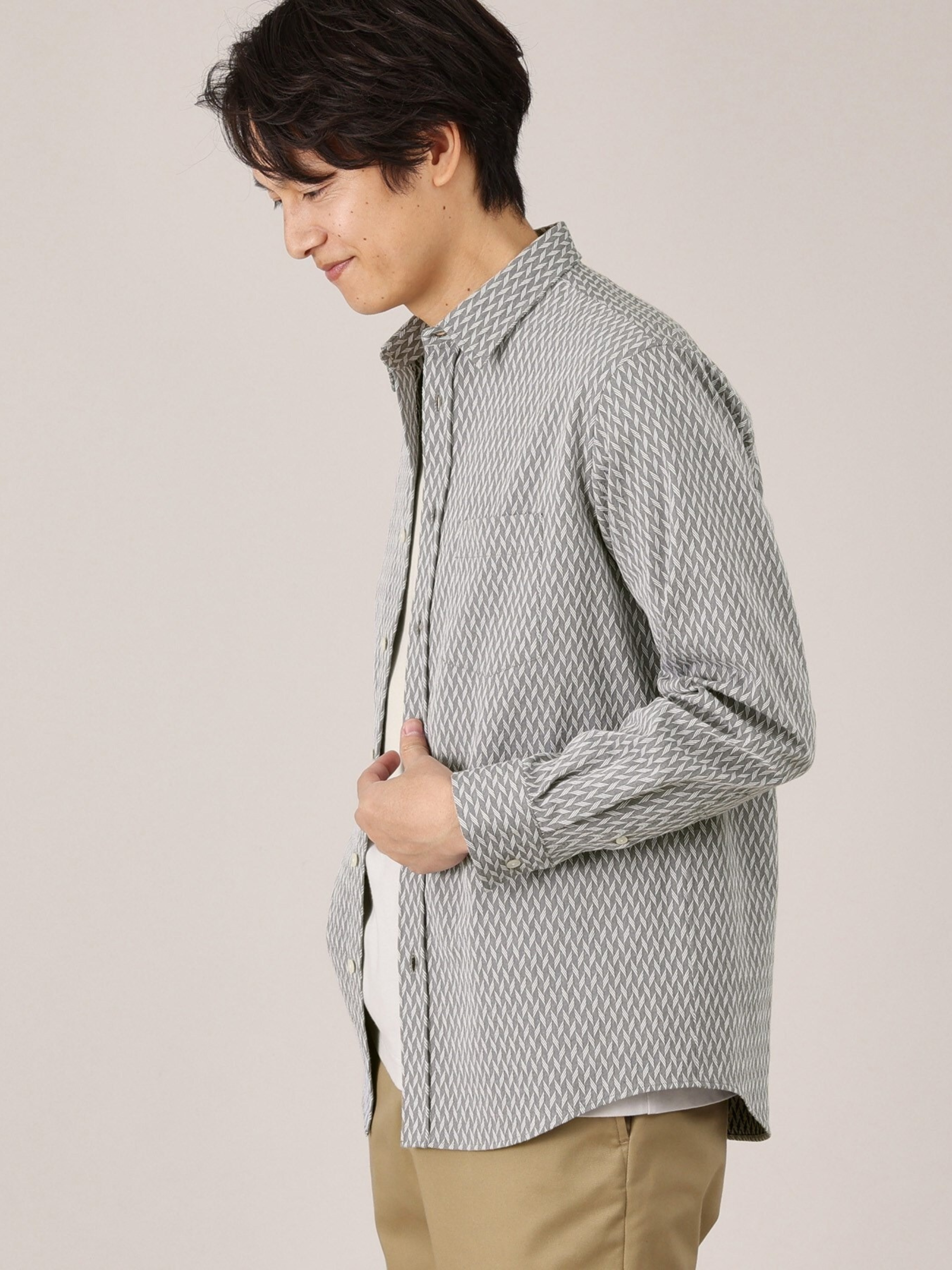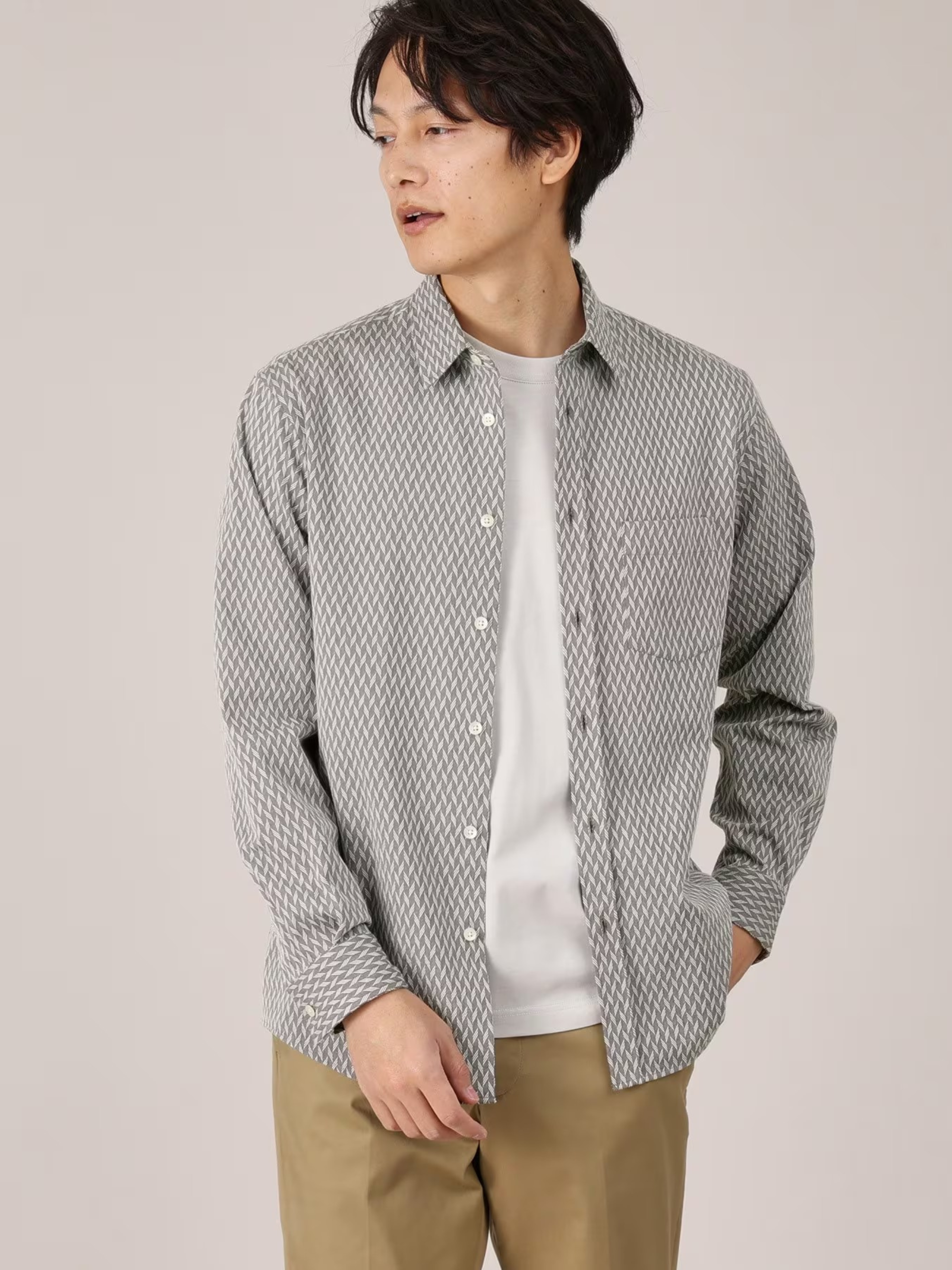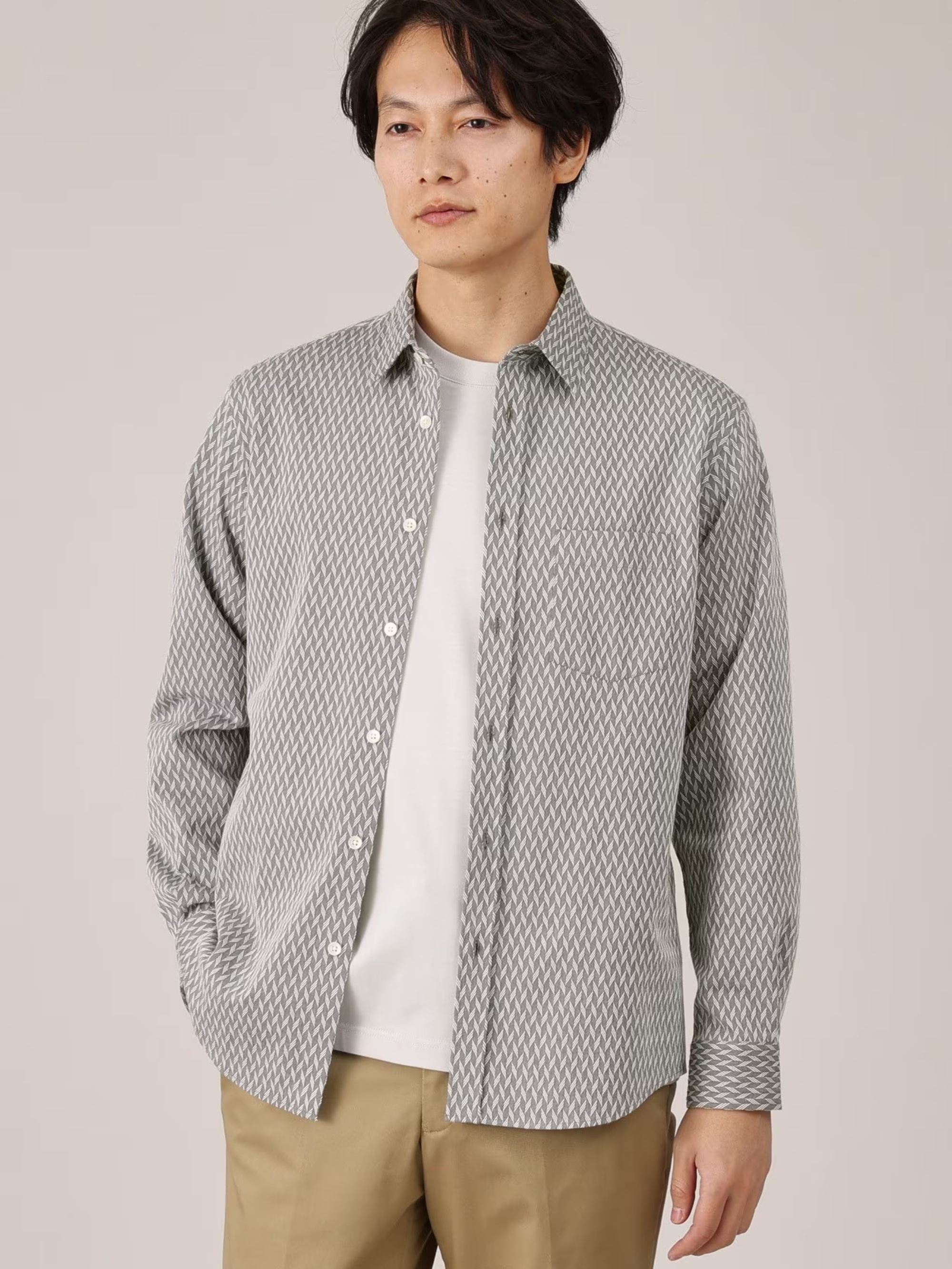 เสื้อเชิ้ตแขนยาว ผลิตจากผ้า Banshu-woven ที่เพิ่มความยืดหยุ่นให้กับพื้นผิวแบบ Dobby Weave ที่มีมิติและลวดลายไม่เรียบเสมอกัน โทนสีแบบ Chambray และพื้นผิวที่ไม่เรียบของผ้าทำให้สัมผัสนุ่มลื่น น้ำหนักเบา และให้ความรู้สึกสดชื่นเหมาะกับฤดูใบไม้ผลิ นอกจากนี้ ยังมีความยืดหยุ่นและสวมใส่สบาย