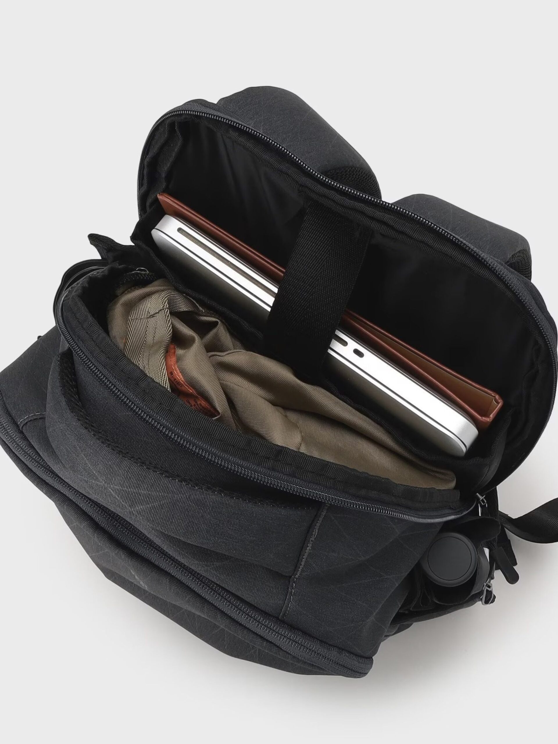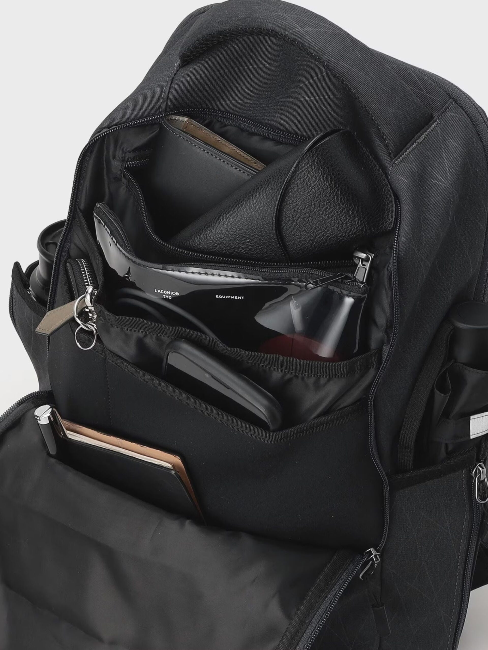เมื่อเปิดซิปด้านหน้าจะพบช่องกระเป๋า neoprene และช่องซิป ส่วนภายในช่องหลักจะมีช่องสำหรับใส่แล็ปท็อป ช่องซิป และช่องเล็กๆเพื่อจัดเก็บสิ่งของได้สะดวก ภายนอกมีการออกแบบที่ไม่ฉูดฉาดเกินไป ใช้วัสดุน้ำหนักเบาที่มีลวดลายเงา ส่วนวัสดุด้านในมีความบางและนุ่ม เพิ่มความลงตัวและภาพลักษณ์ที่ดูอ่อนโยน สามารถเข้ากับการแต่งกายทั้งวันทำงานและวันหยุด ใส่ใจในฟังก์ชันการจัดเก็บ มีช่องกระเป๋าที่ใช้งานสะดวก เช่น ช่องที่มองเห็นของด้านในได้ง่าย และช่องซิปด้านข้างที่สามารถใส่ขวดน้ำหรือร่มพับได้