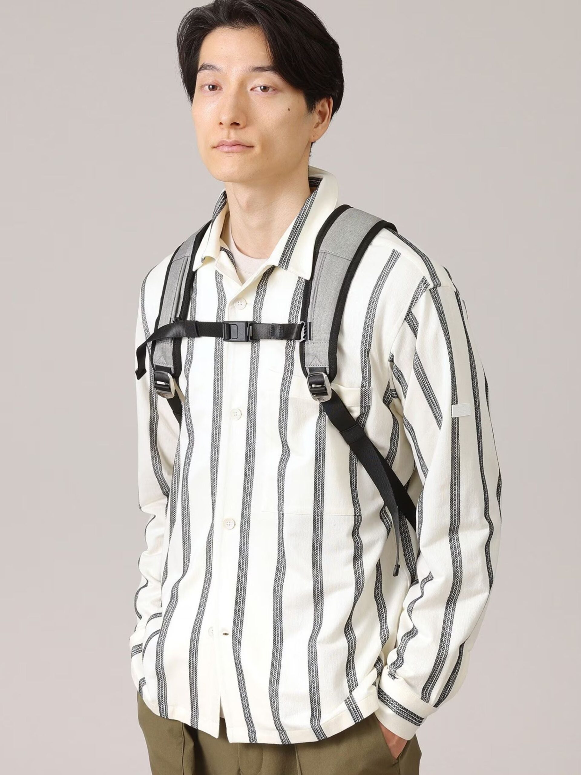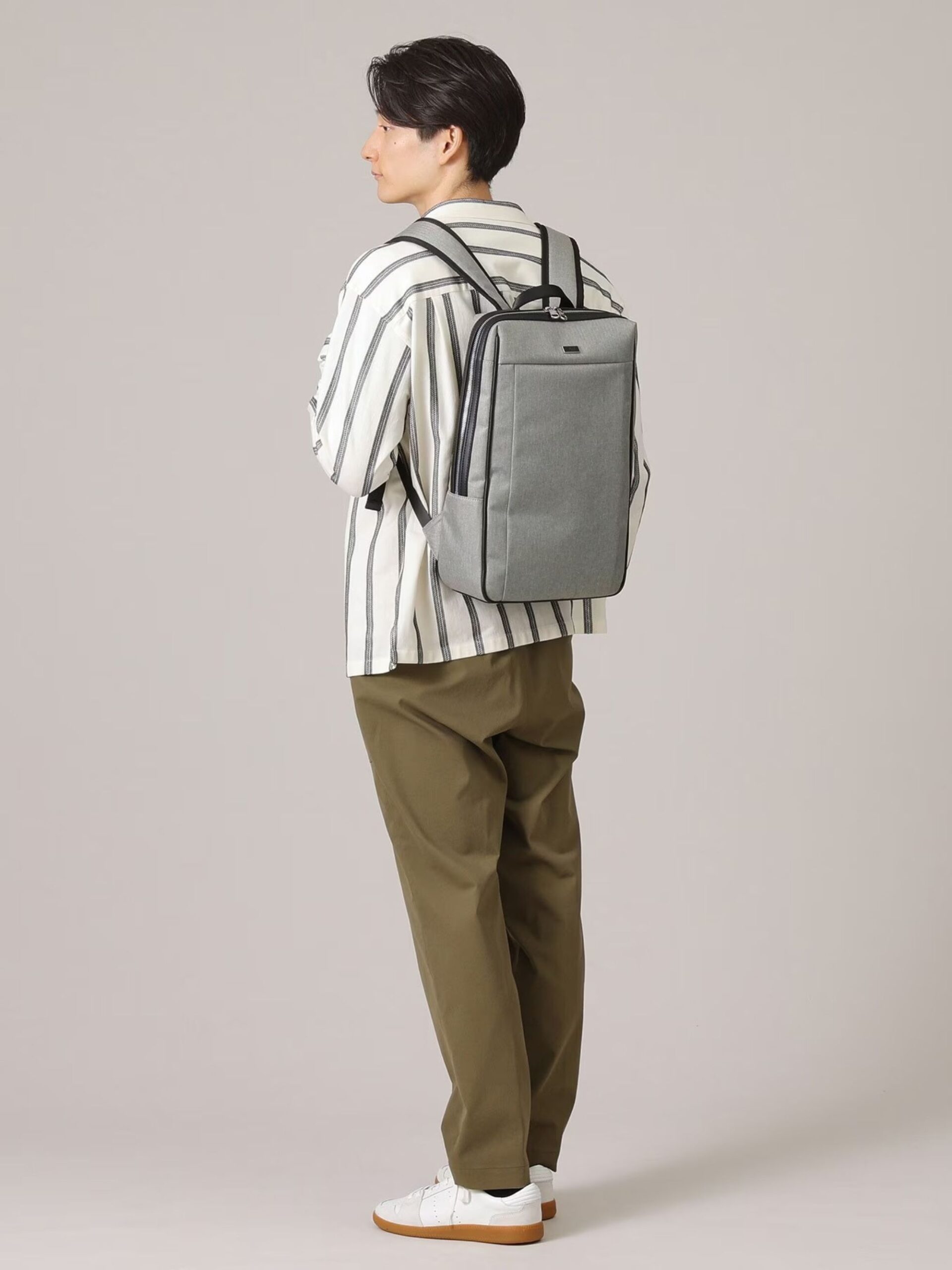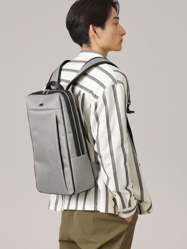 กระเป๋าเป้สะพายหลัง ทำจากผ้าใยสังเคราะห์พร้อมลวดลายลายก้างปลาอัน ออกแบบให้เรียบง่ายและบาง แผ่นโลโก้มีแผ่นโลหะและหนังผสมกันซึ่งให้ความรู้สึกหรูหรา ภายในใช้งานได้ดีและมีช่องใส่ PC ที่สามารถรองรับแล็ปท็อปและแท็บเล็ตได้ ทางแบรนด์ให้ความสนใจเป็นพิเศษกับการบุผ้า เพื่อไม่ให้รอยยับที่ด้านข้างและพื้นผิวมองเห็นได้ชัดเจน