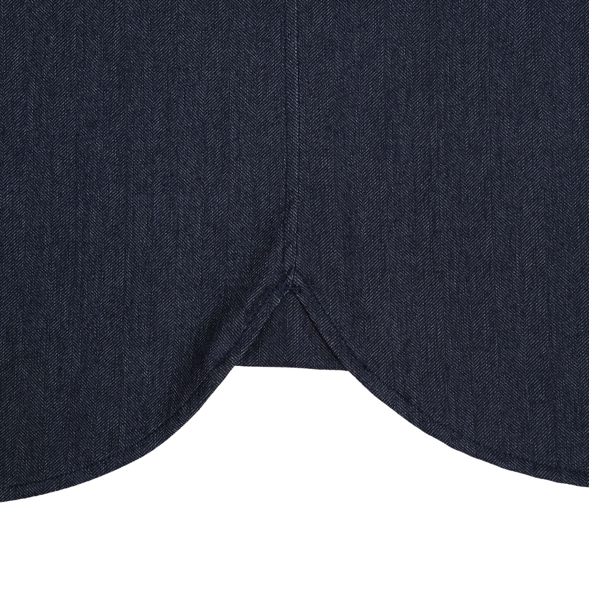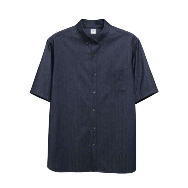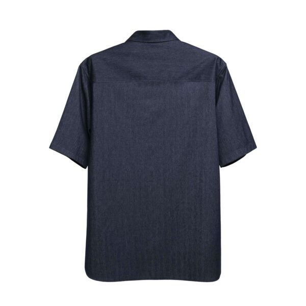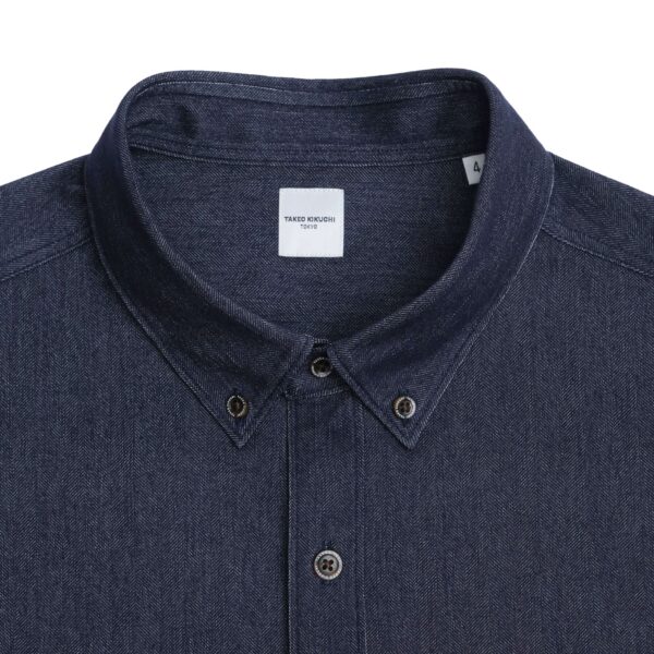 เสื้อเชิ้ตแขนสั้นคอ Button-Down ผลิตจากผ้า Yarn-Dyed Jersey Knit ที่มีเนื้อนุ่ม เด้ง และยืดหยุ่นสูง ด้วยโครงสร้างแบบ High-Gauge ทำให้ผ้ามีน้ำหนักเบา ทอแบบ Twill ลาย Herringbone และผ่านกระบวนการย้อมสีให้มีลักษณะคล้าย Denim
