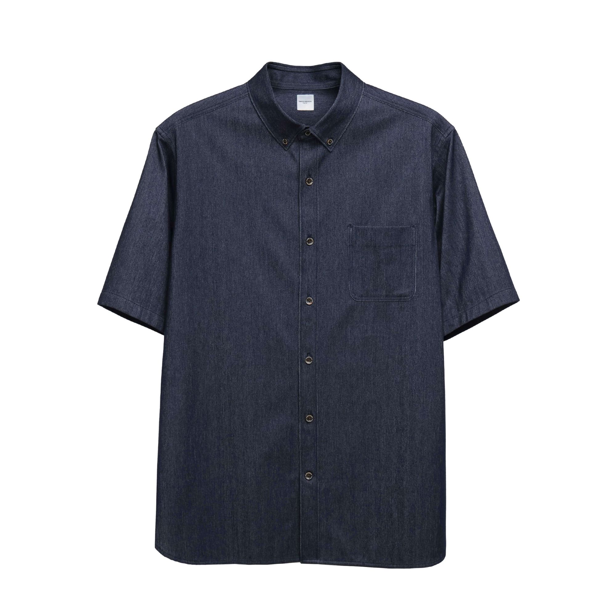 Short-Sleeve Button-Down Shirt Made from yarn-dyed jersey knit fabric, this shirt features a soft, bouncy, and highly stretchable texture. The high-gauge construction makes it lightweight, while the twill weave in a herringbone pattern gives it a refined look. The fabric is dyed to resemble denim, adding a stylish touch.