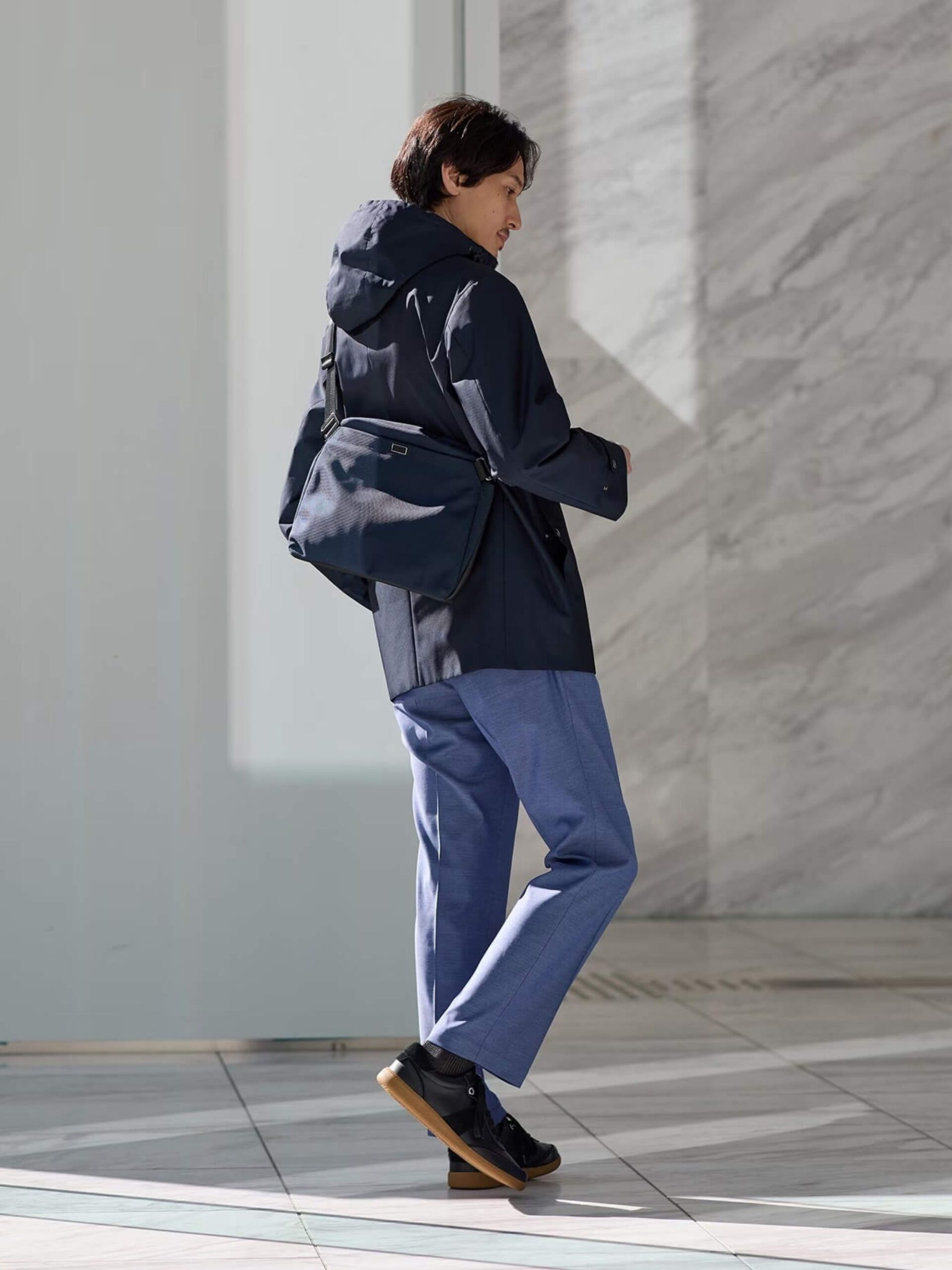 กระเป๋าสะพายไหล่ผลิตจากวัสดุผ้า Dobby สังเคราะห์ ขนาดแนวนอนใส่เอกสาร A4 ได้ จุดเด่นคือฟังก์ชันขยายพื้นที่จัดเก็บ ที่สามารถปรับขนาดความกว้างของก้นกระเป๋าได้ตามปริมาณสัมภาระ