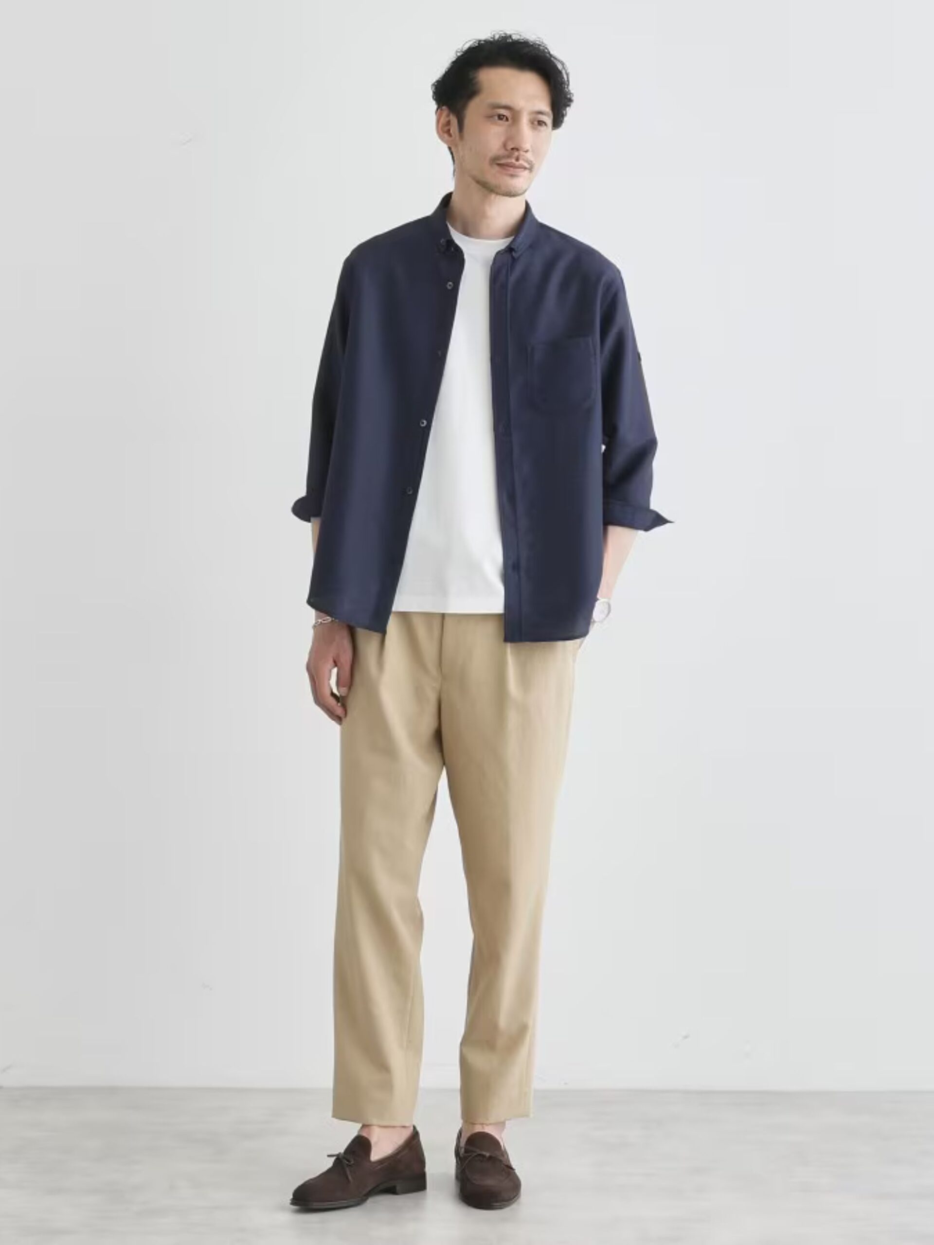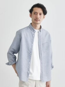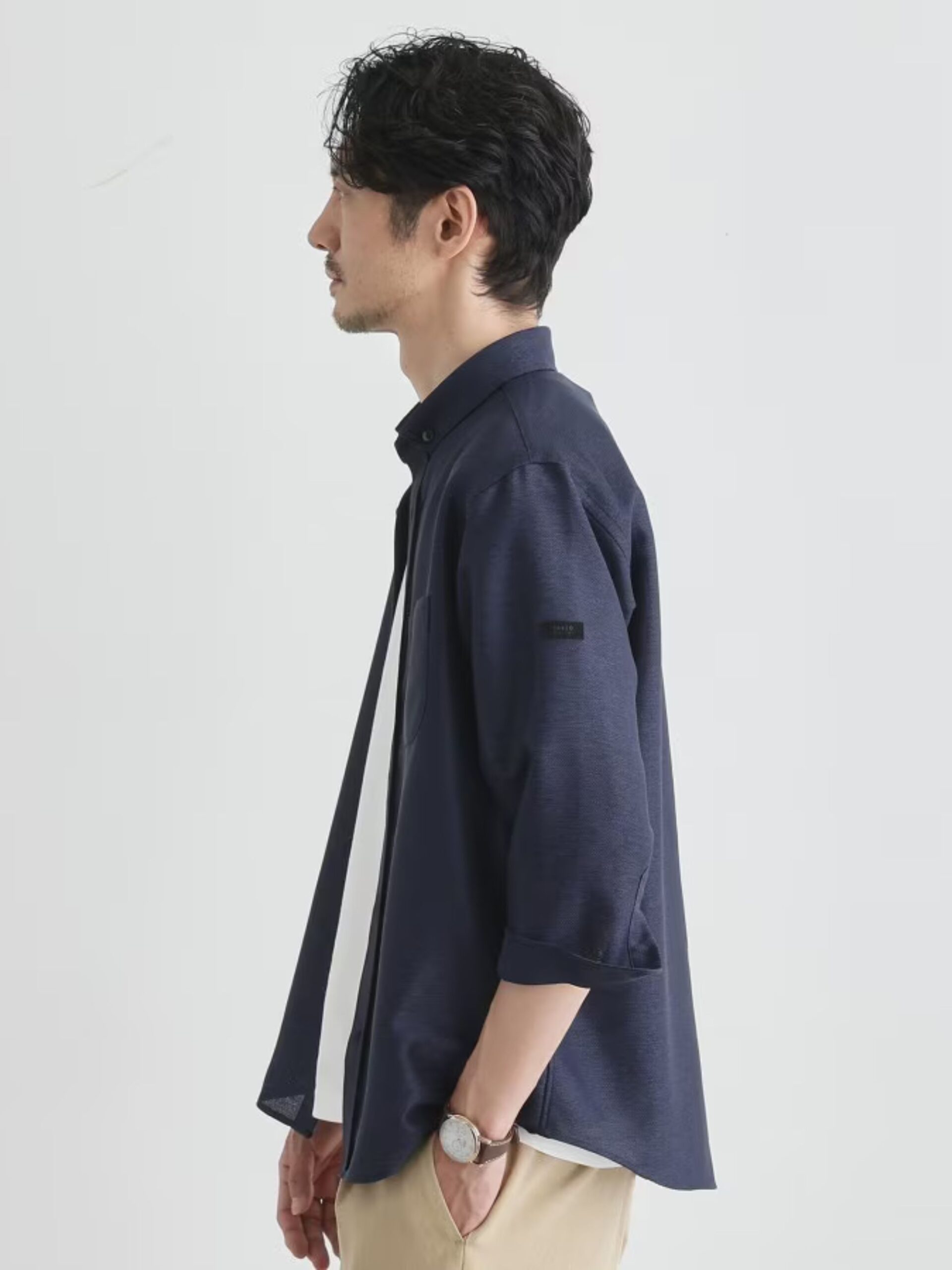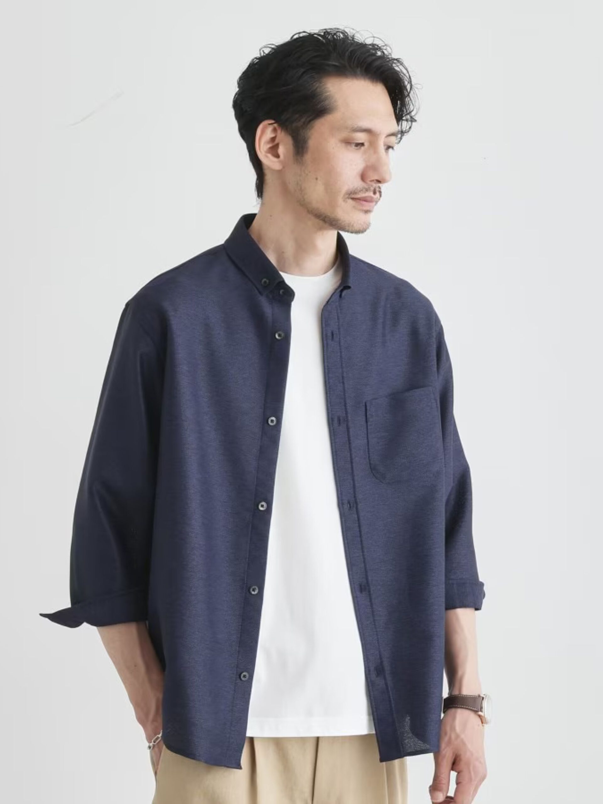 เสื้อเชิ้ตแขนสามส่วน ผลิตจากผ้าทวิล (Twill Weave) ให้สัมผัสแบบ Dry Touch และระบายอากาศได้ดี ทำให้รู้สึกสดชื่นและสวมใส่สบาย เหมาะอย่างยิ่งกับอากาศร้อนชื้นของญี่ปุ่น ดีไซน์ที่เรียบง่ายสะอาดตา ช่วยขับให้เห็นความโปร่งเบาของเนื้อผ้าและลายตารางที่ต่อเนื่องอย่างสวยงาม คอเสื้อแบบ Compact Button-down ให้ความรู้สึกคมเนี้ยบ แต่ดูเบากว่าคอเสื้อทั่วไป แขนสามส่วนออกแบบพร้อมปลายแขนที่สามารถพับขึ้นได้ง่าย สะดวกต่อการปรับอุณหภูมิให้เหมาะกับสภาพอากาศเสื้อตัวนี้สามารถสวมทับเสื้อยืดหรือเสื้อคัตแอนด์โซว์ได้อย่างมีสไตล์ เหมาะกับช่วงต้นฤดูร้อนที่อุณหภูมิแตกต่างระหว่างเช้าและเย็น รวมถึงช่วยบังแดดและใส่ได้อย่างสบายในอาคารช่วงกลางวันของหน้าร้อน