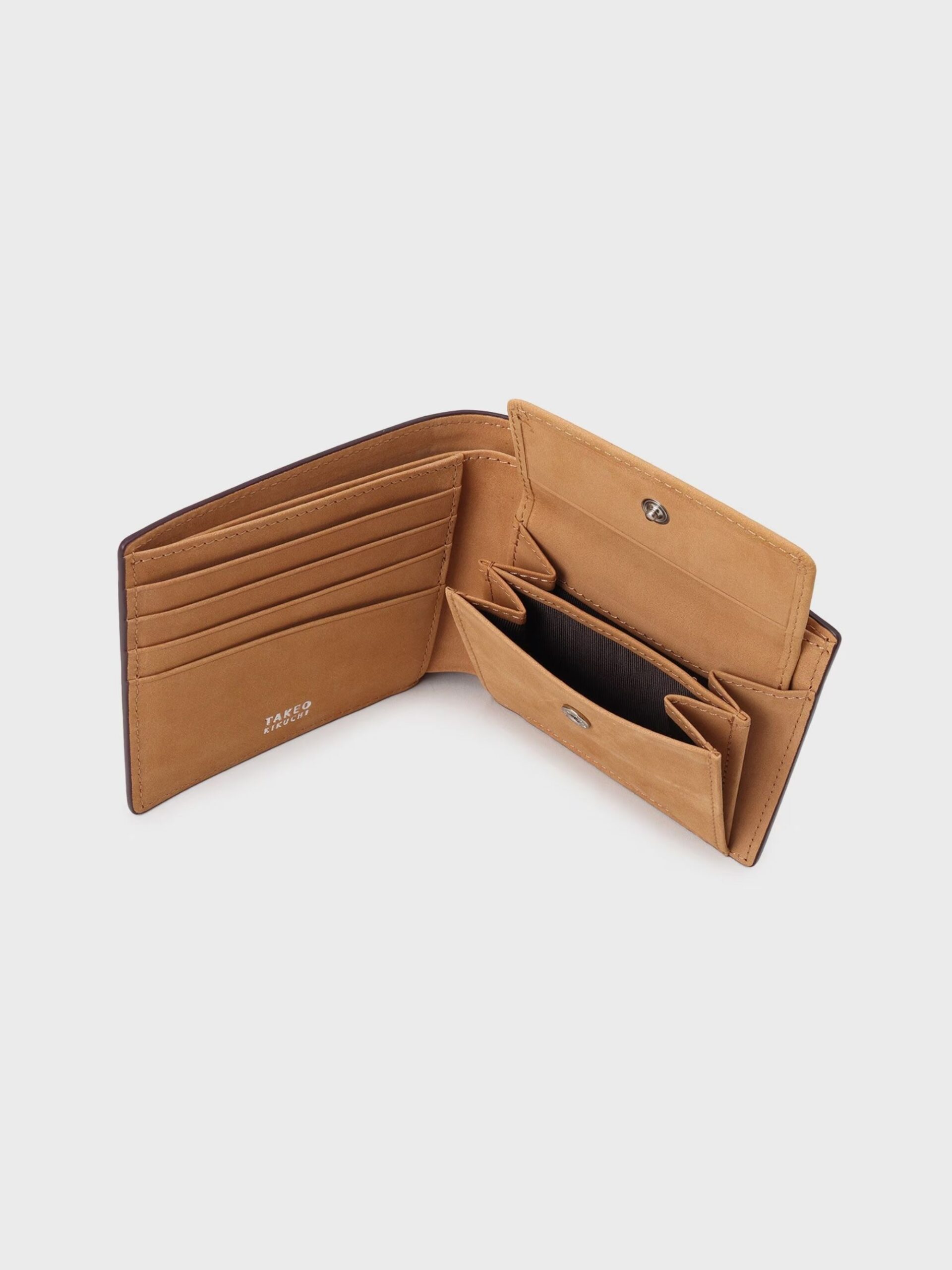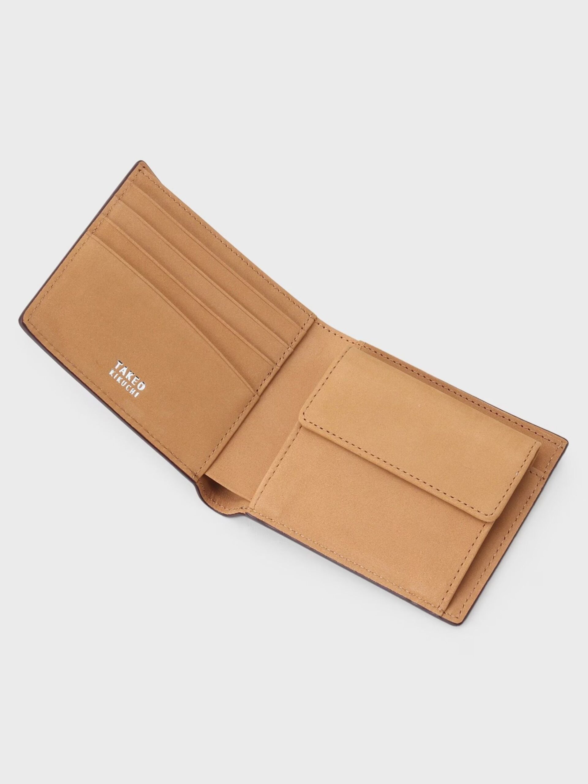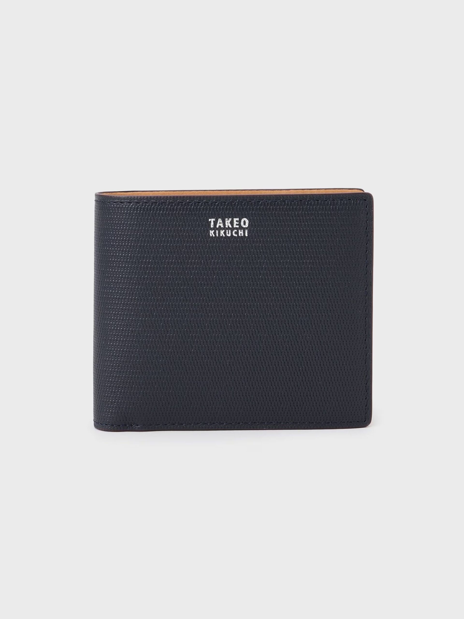 กระเป๋าสตางค์ใบสั้นทำจากหนังแท้ Soft Steer ที่มีผิวสัมผัสเนียน ผ่านการปั๊มลายตาข่ายขนาดเล็ก (small mesh emboss) แบบอริจินัลของ TAKEO KIKUCHI จับเก็บได้เยอะ แม้จะเป็นแบบพับสองทบก็ตาม