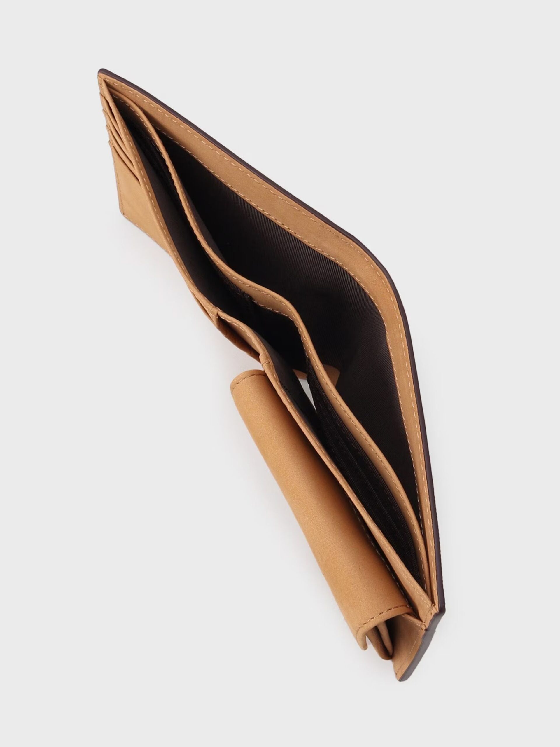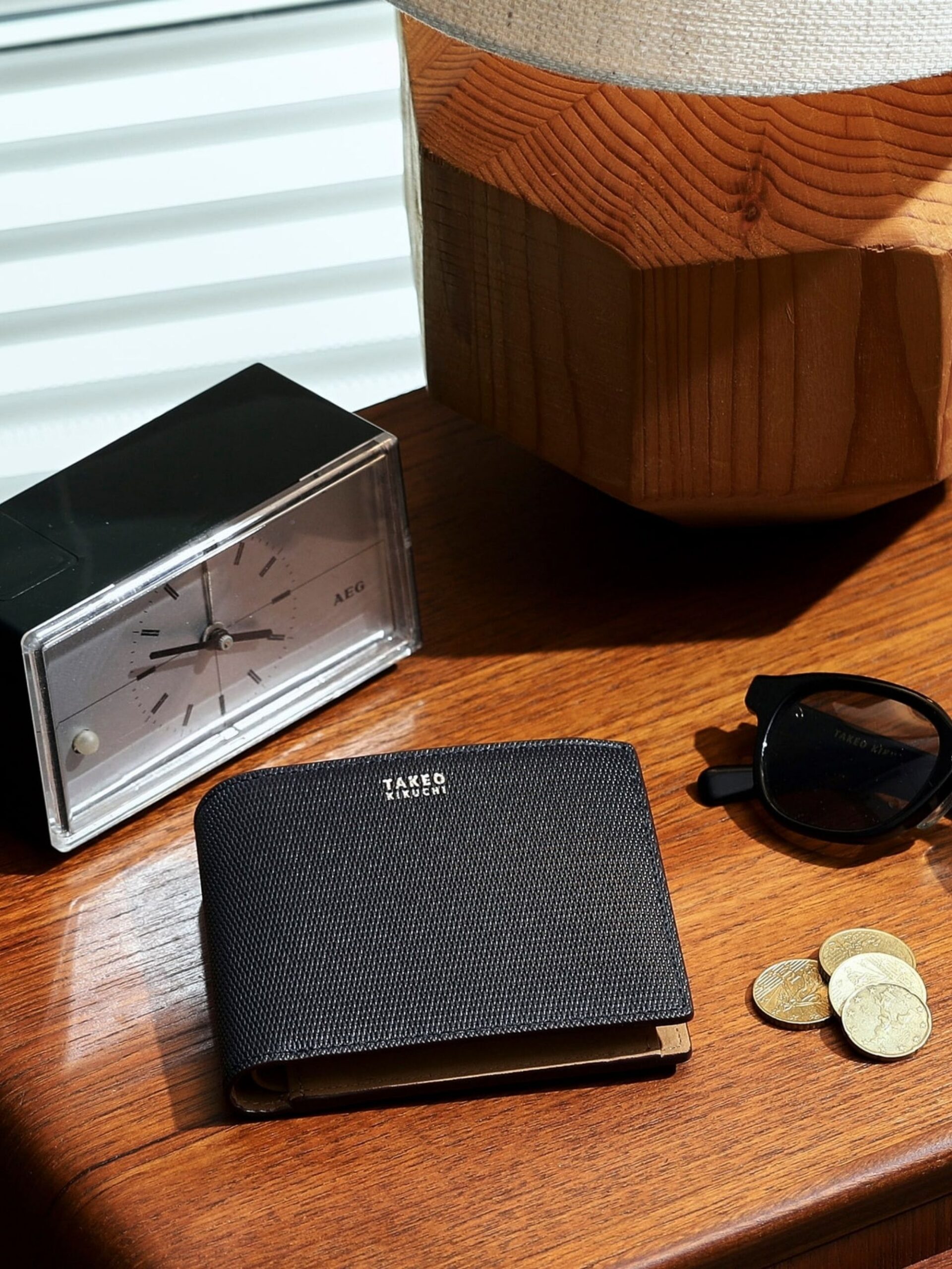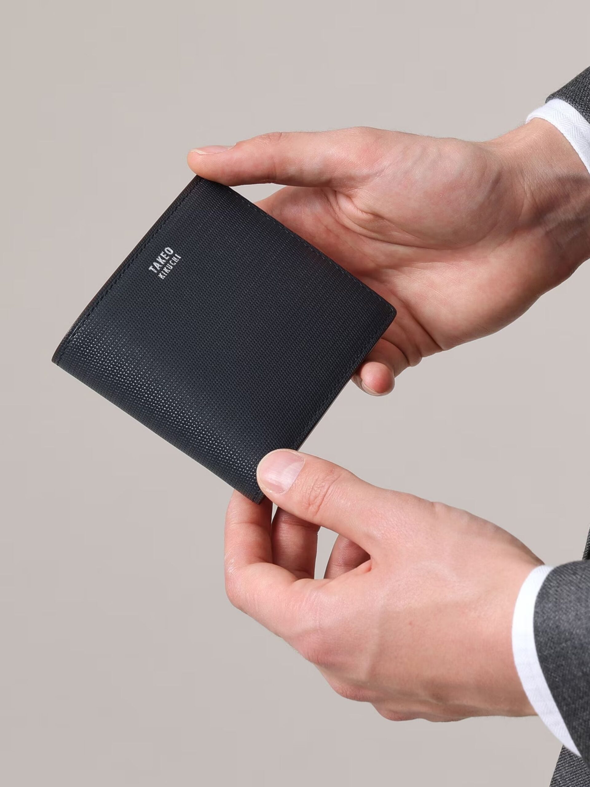 กระเป๋าสตางค์ใบสั้นทำจากหนังแท้ Soft Steer ที่มีผิวสัมผัสเนียน ผ่านการปั๊มลายตาข่ายขนาดเล็ก (small mesh emboss) แบบอริจินัลของ TAKEO KIKUCHI จับเก็บได้เยอะ แม้จะเป็นแบบพับสองทบก็ตาม