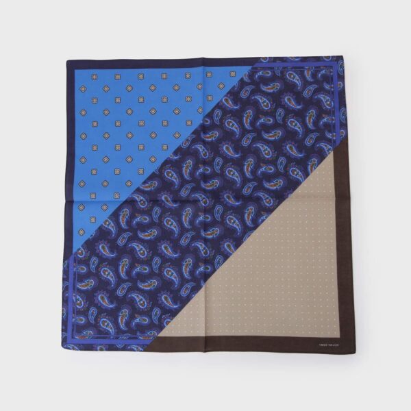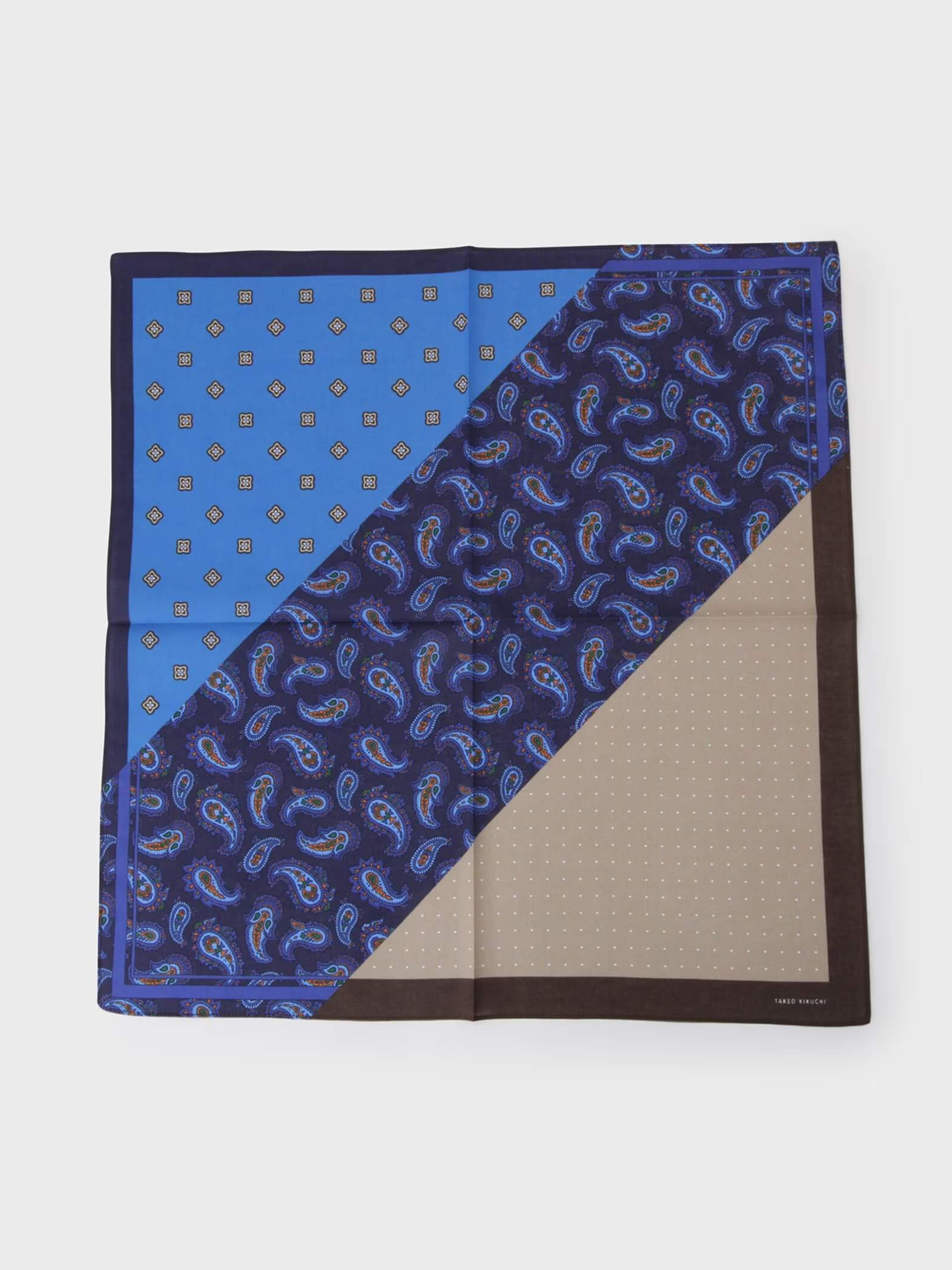 ผ้าเช็ดหน้าลายพิมพ์ที่มีลวดลายแบบเฉียง ประกอบด้วยจุด ลายเพสลีย์ ลายเล็ก ๆ และลายแบบดั้งเดิม เนื้อผ้านุ่ม ใส่สบาย และมีขนาดพอเหมาะที่จะใช้เป็นผ้าพันคอ จุดเด่นคือการสลับลวดลายให้มองเห็นเฉพาะลายเพสลีย์เมื่อใช้เป็นผ้าพันคอ ทำให้ง่ายต่อการแมตช์กับการแต่งตัว