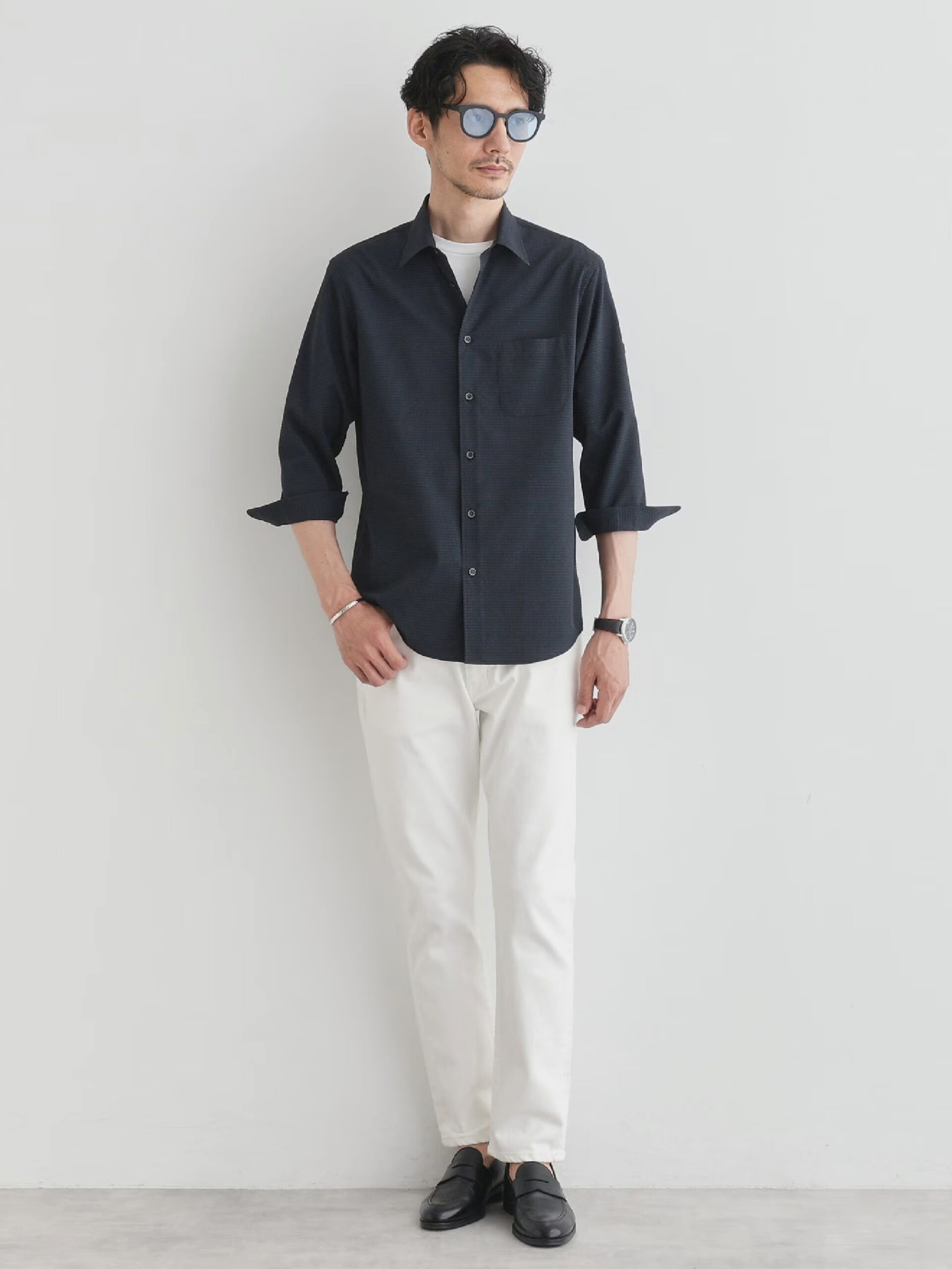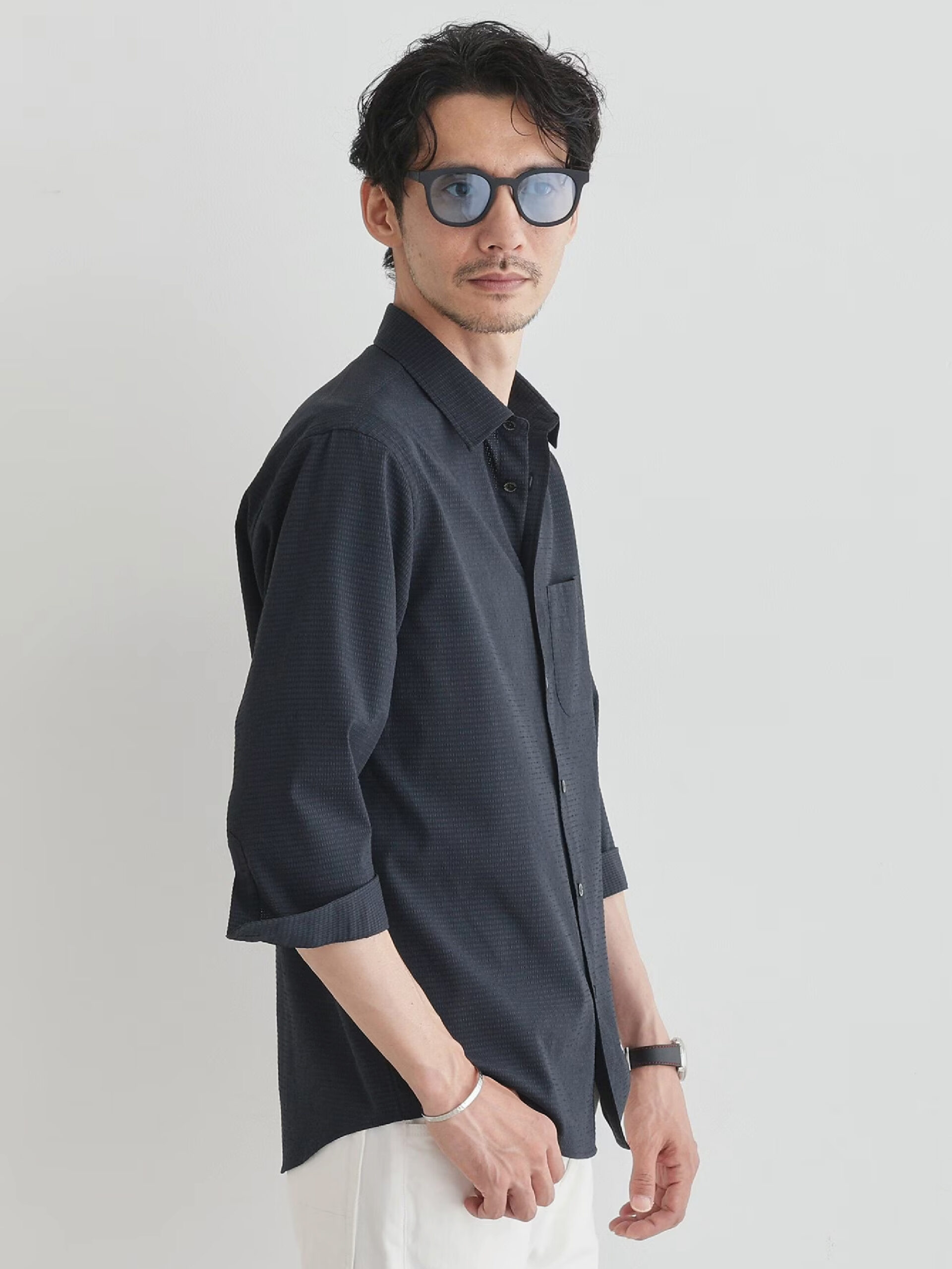 เสื้อเชิ้ตแขนสามส่วนนี้ตัดเย็บจากผ้าฟังก์ชันน้ำหนักเบา “DotAir” ของ TORAY ในเวอร์ชัน Seersucker ที่มีรูระบายอากาศขนาดเล็กในเนื้อผ้า จึงเหมาะอย่างยิ่งกับอากาศร้อนชื้นในช่วงซัมเมอร์ ผ้า Seersucker ยังช่วยลดการสัมผัสกับผิวโดยตรง ทำให้ใส่สบายมากขึ้น มีกระเป๋าอก 1 ช่อง