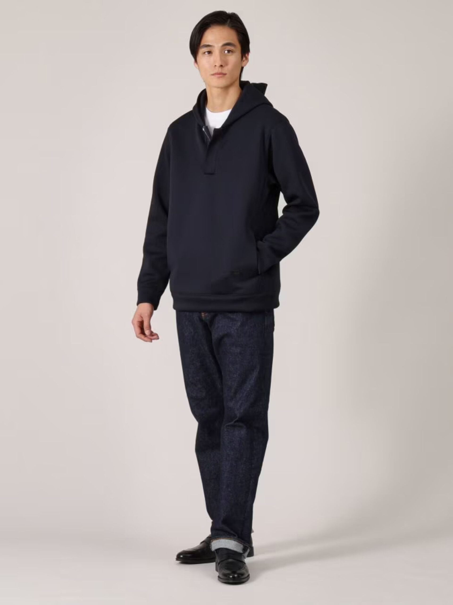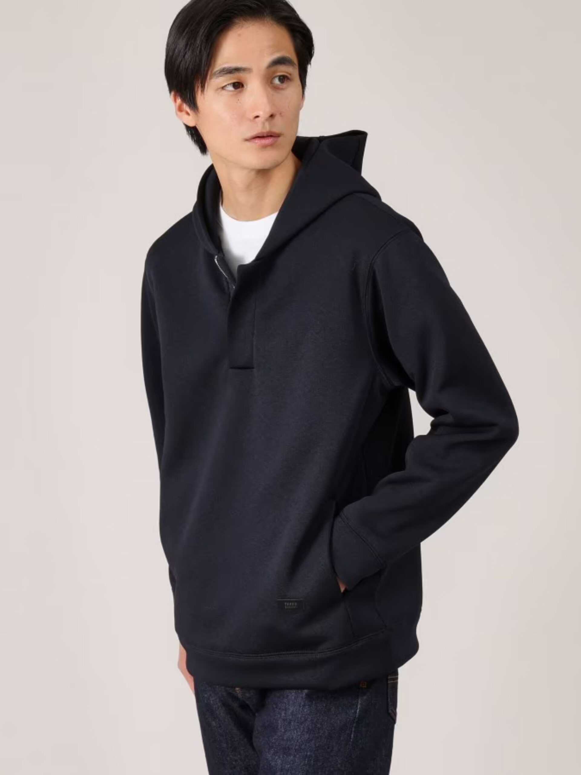 เสื้อฮู้ดครึ่งซิป เหมาะสำหรับฤดูใบไม้ผลิ ผลิตจากผ้า Cardboard Jersey ที่มีการทอแบบรังผึ้ง พร้อมลอนเล็ก ๆ คล้ายผ้า Piqué ให้สัมผัสโปร่งสบาย เหมาะกับอากาศเย็นสดชื่นในช่วงฤดูนี้ ผ้ามีน้ำหนักเบา เด้ง และคงรูปดี มอบทั้งความสบายในการสวมใส่และซิลูเอตที่สวยงามดูมีระดับ พื้นผิวไม่เรียบจากการย้อมแบบพิเศษยังช่วยเพิ่มมิติและสัมผัสนุ่มนวล ถือเป็นเอกลักษณ์เฉพาะของรุ่นนี้