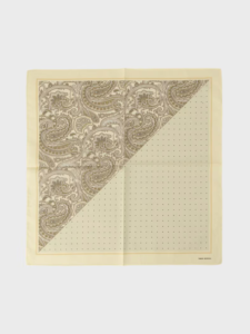 ผ้าเช็ดหน้าพิมพ์ลายที่มีดีไซน์แปลกตา ออกแบบโดยการรวมใบเพสลีย์และลายจุดแบบดั้งเดิมเข้าด้วยกันในแนวแทยงอย่างมีลูกเล่น เนื้อผ้านุ่ม เหมาะสำหรับใช้เป็นผ้าเช็ดหน้าหรือจะพับเป็นผ้าพันคอขนาดเล็กก็ได้เช่นกัน