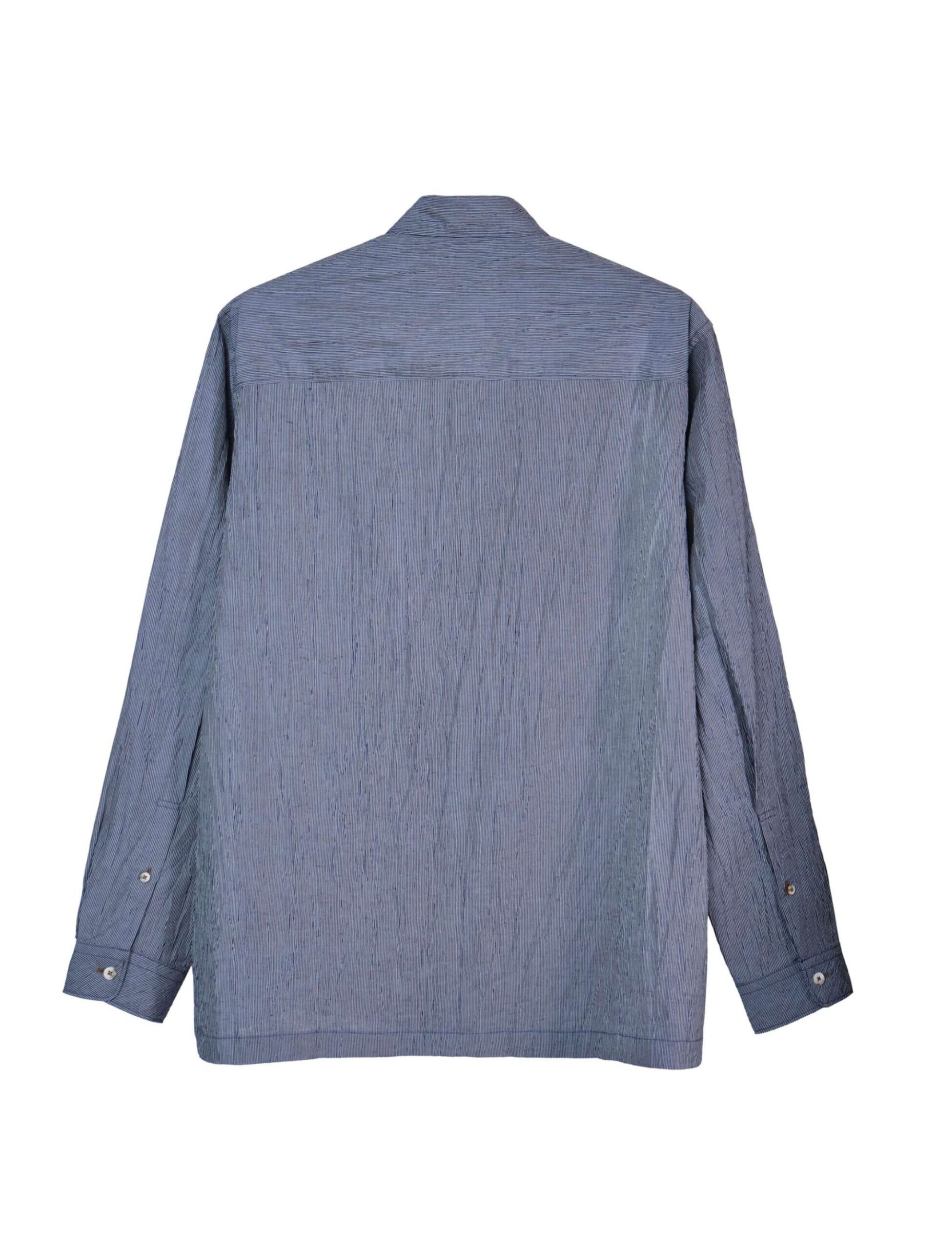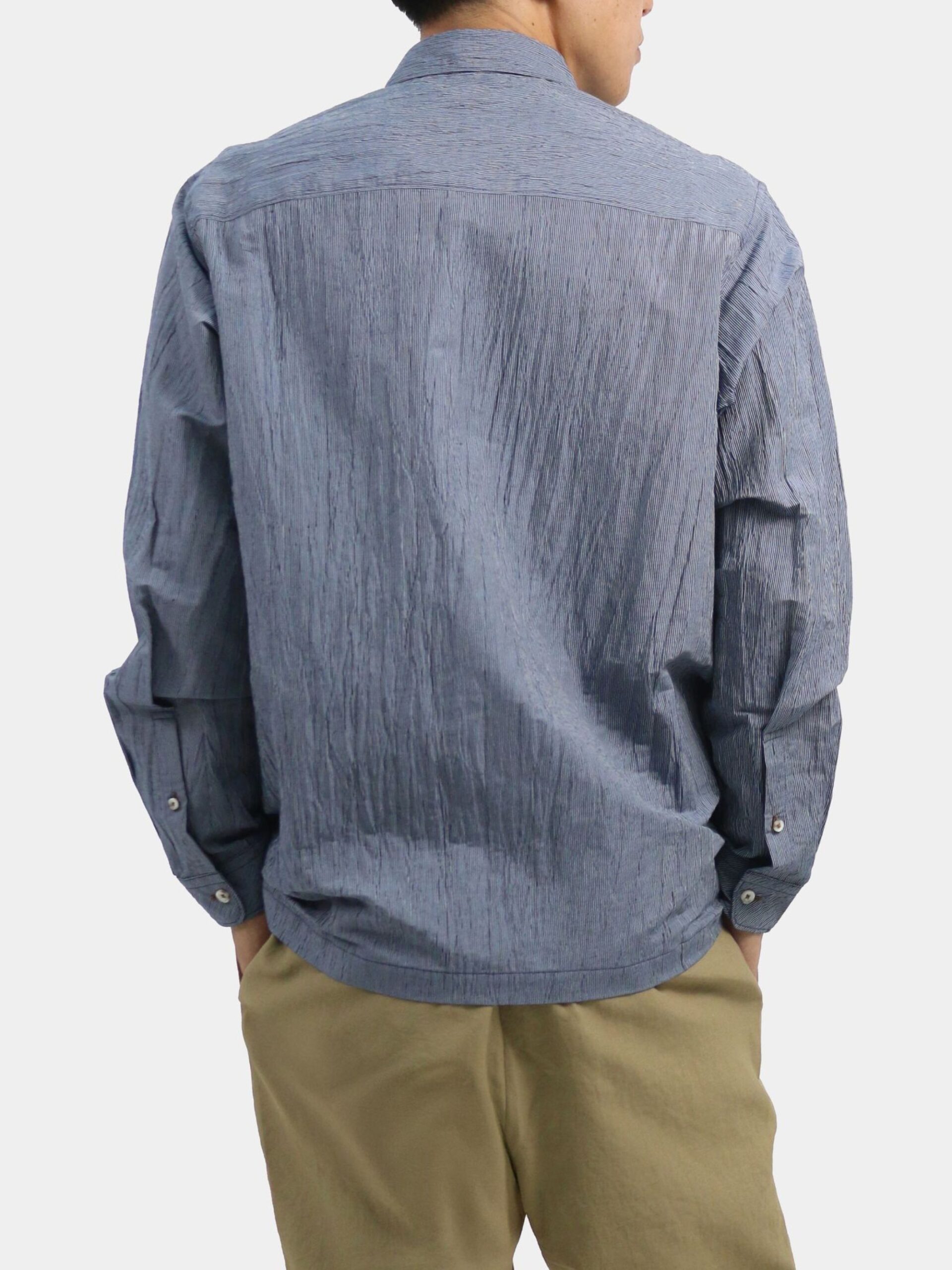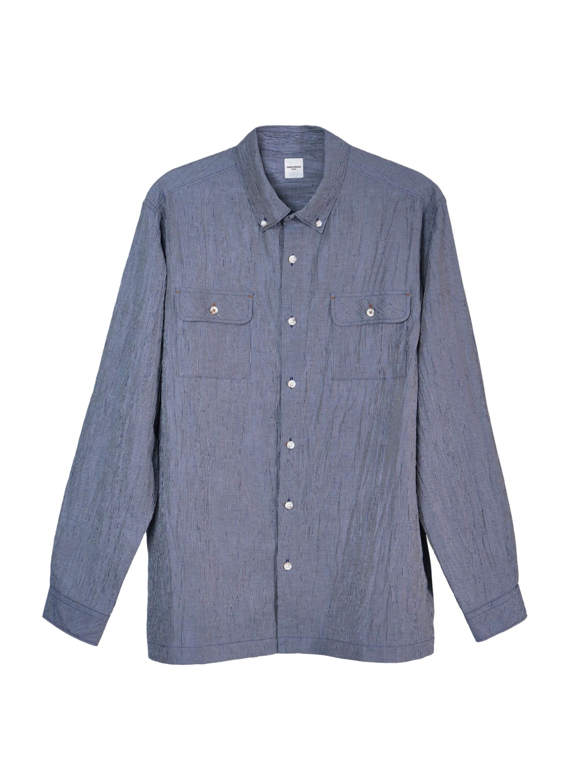 A long-sleeve shirt in a semi-oversized fit with a button-down collar, crafted from a blend of linen, cotton, and polyester—a signature fabric of the brand, known for its natural feel, comfort, and built-in wrinkles that eliminate the need for ironing. This shirt highlights the texture of the fabric, offering a lightweight and breathable wear.