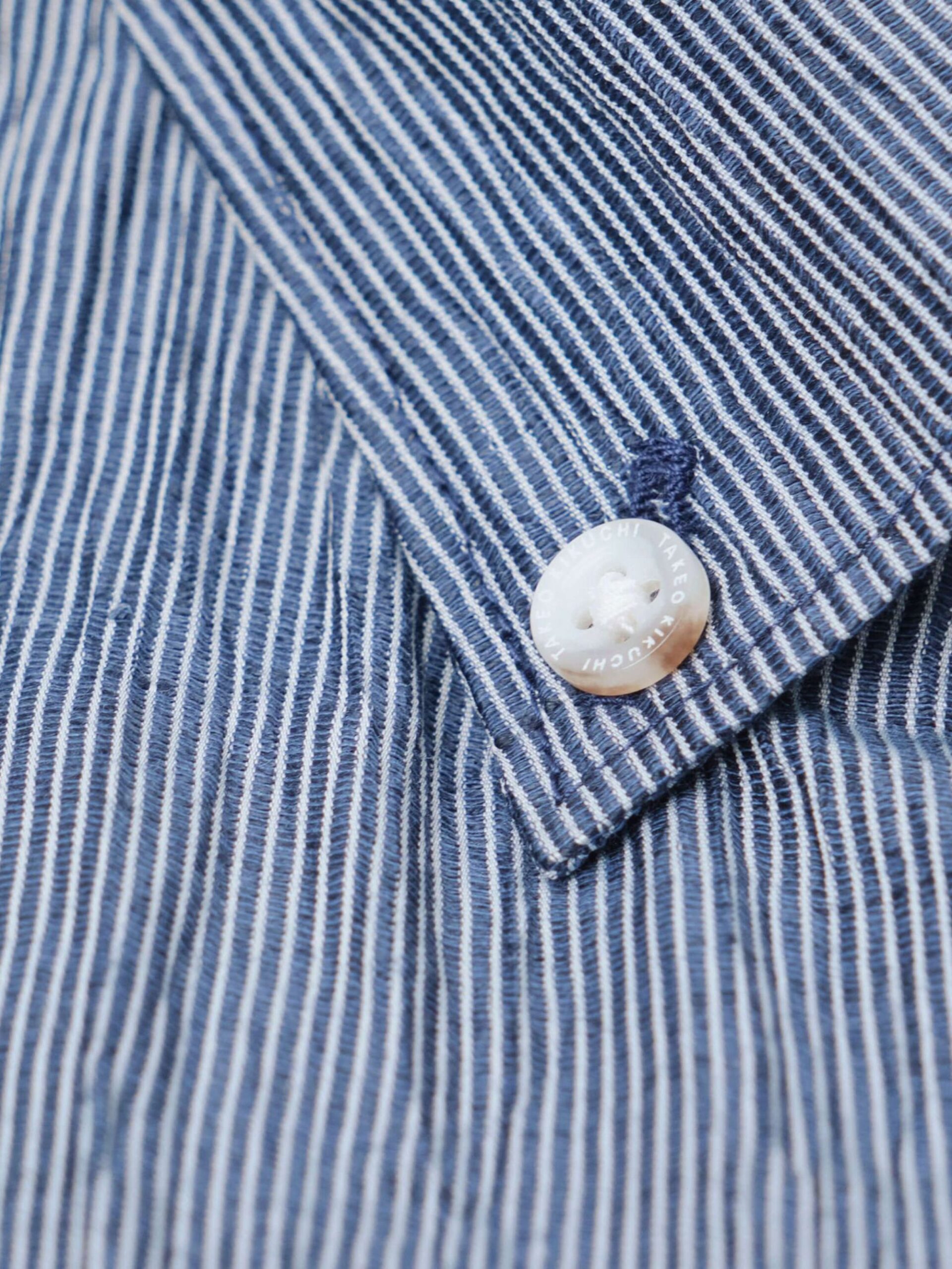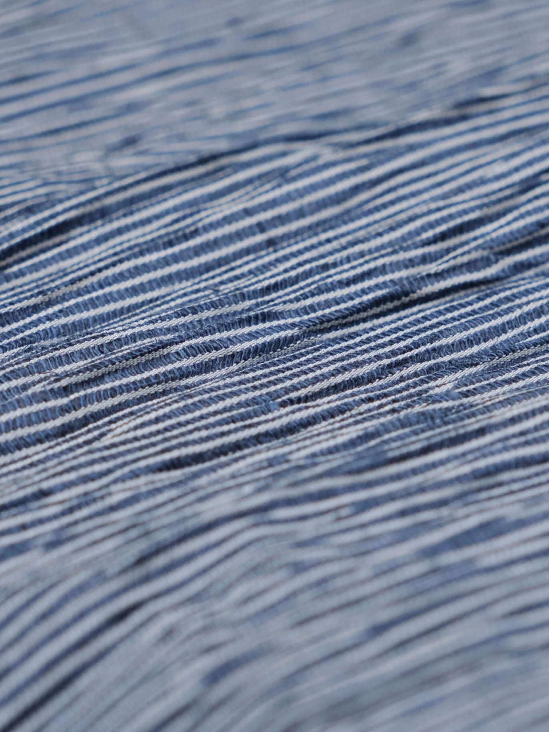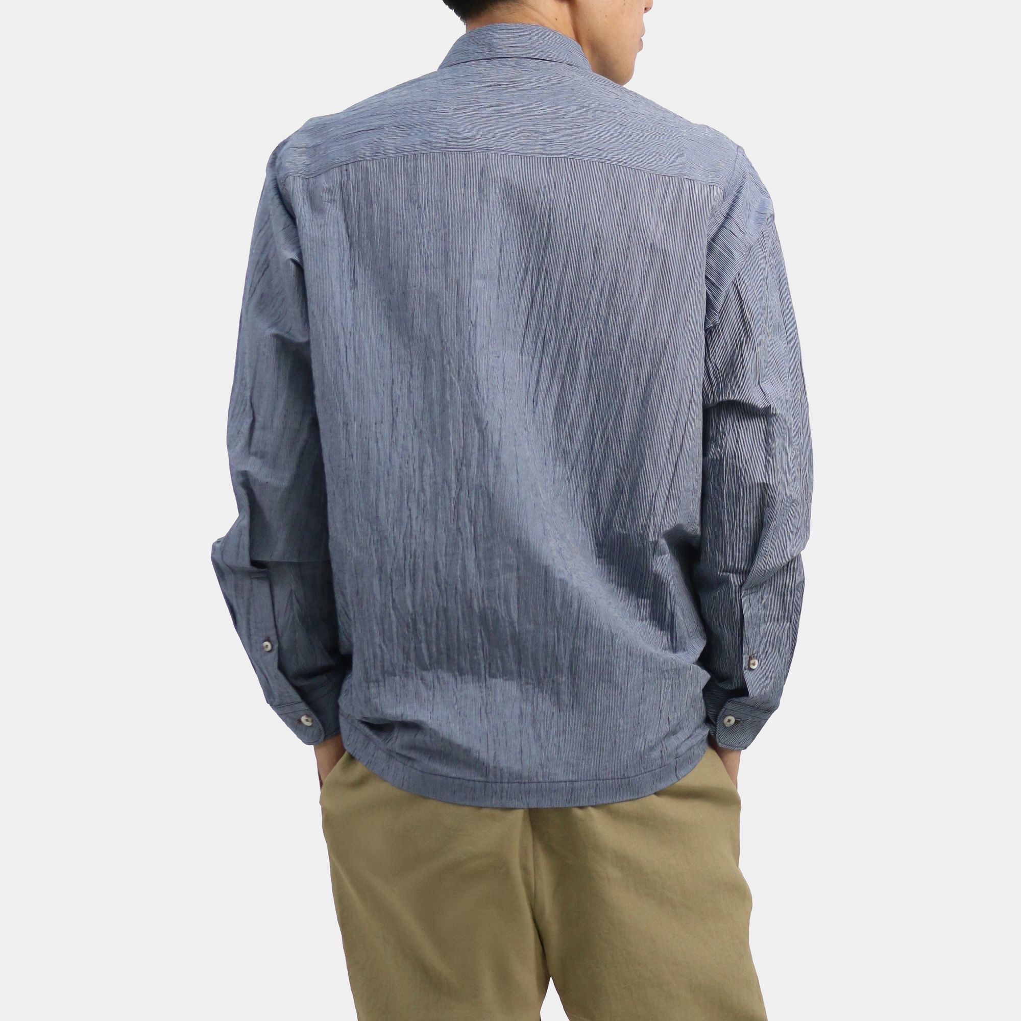 A long-sleeve shirt in a semi-oversized fit with a button-down collar, crafted from a blend of linen, cotton, and polyester—a signature fabric of the brand, known for its natural feel, comfort, and built-in wrinkles that eliminate the need for ironing. This shirt highlights the texture of the fabric, offering a lightweight and breathable wear.