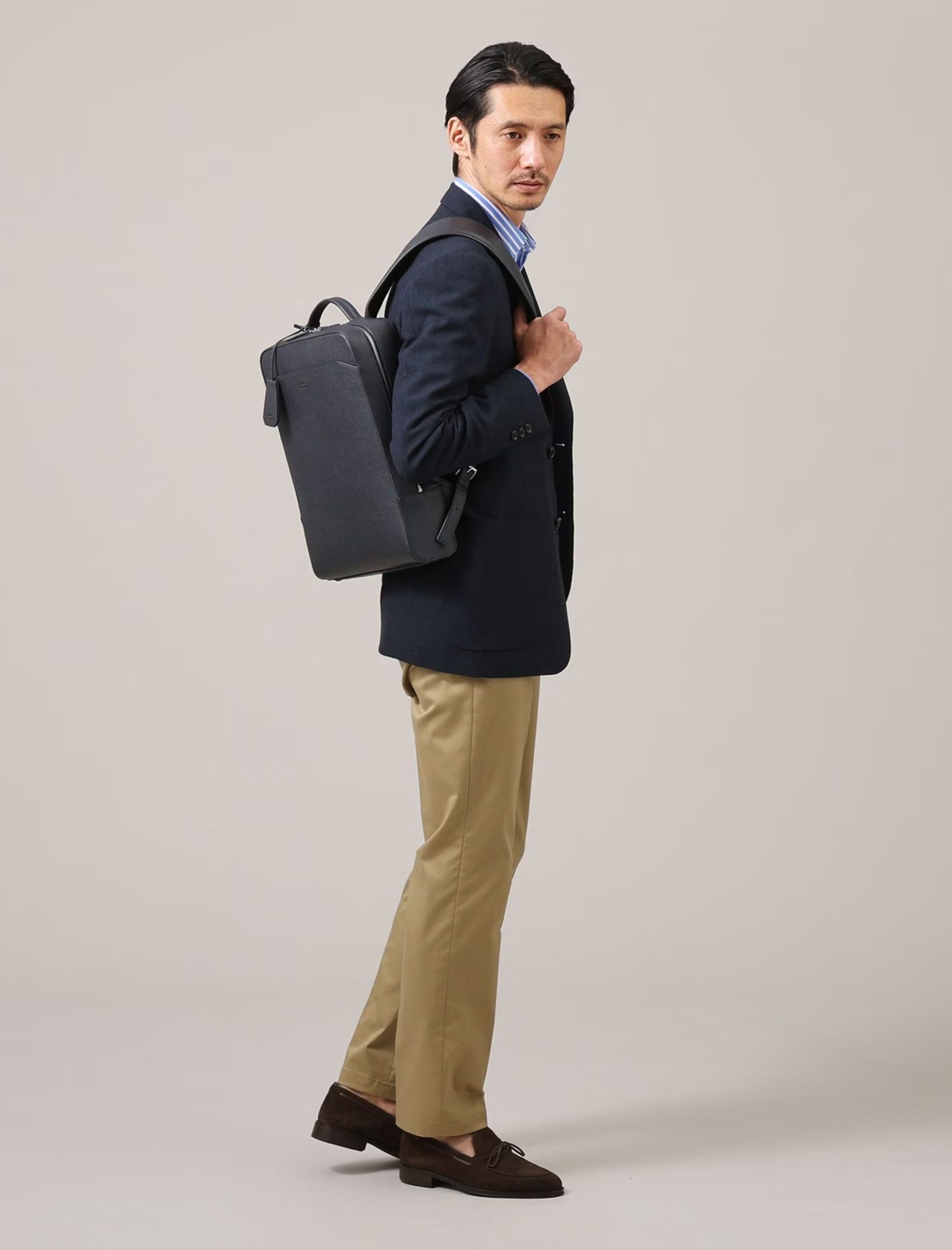 กระเป๋าเป้ดีไซน์เรียบหรูทรงกล่อง ทำจากหนังฟูลเวจแทน (Full Vegetable Tanned Leather) ซึ่งเป็นกระบวนการฟอกด้วยสารจากพืชที่ต้องใช้เวลานานและพิถีพิถัน ตัวกระเป๋าถูกออกแบบอย่างเรียบง่ายเพื่อเน้นความเป็นธรรมชาติของผิวหนัง และให้ความรู้สึกเรียบเท่แบบคนเมือง