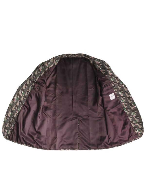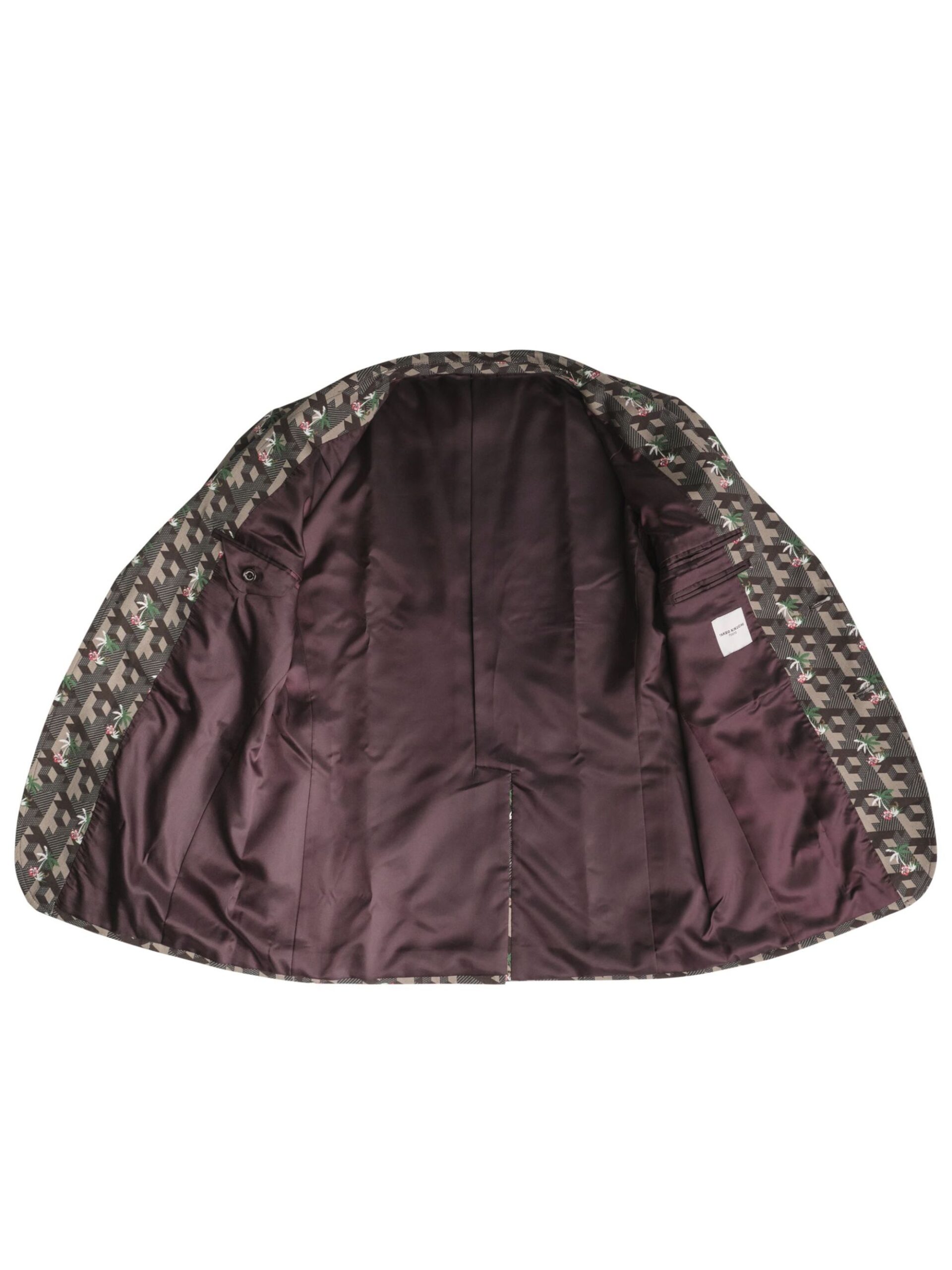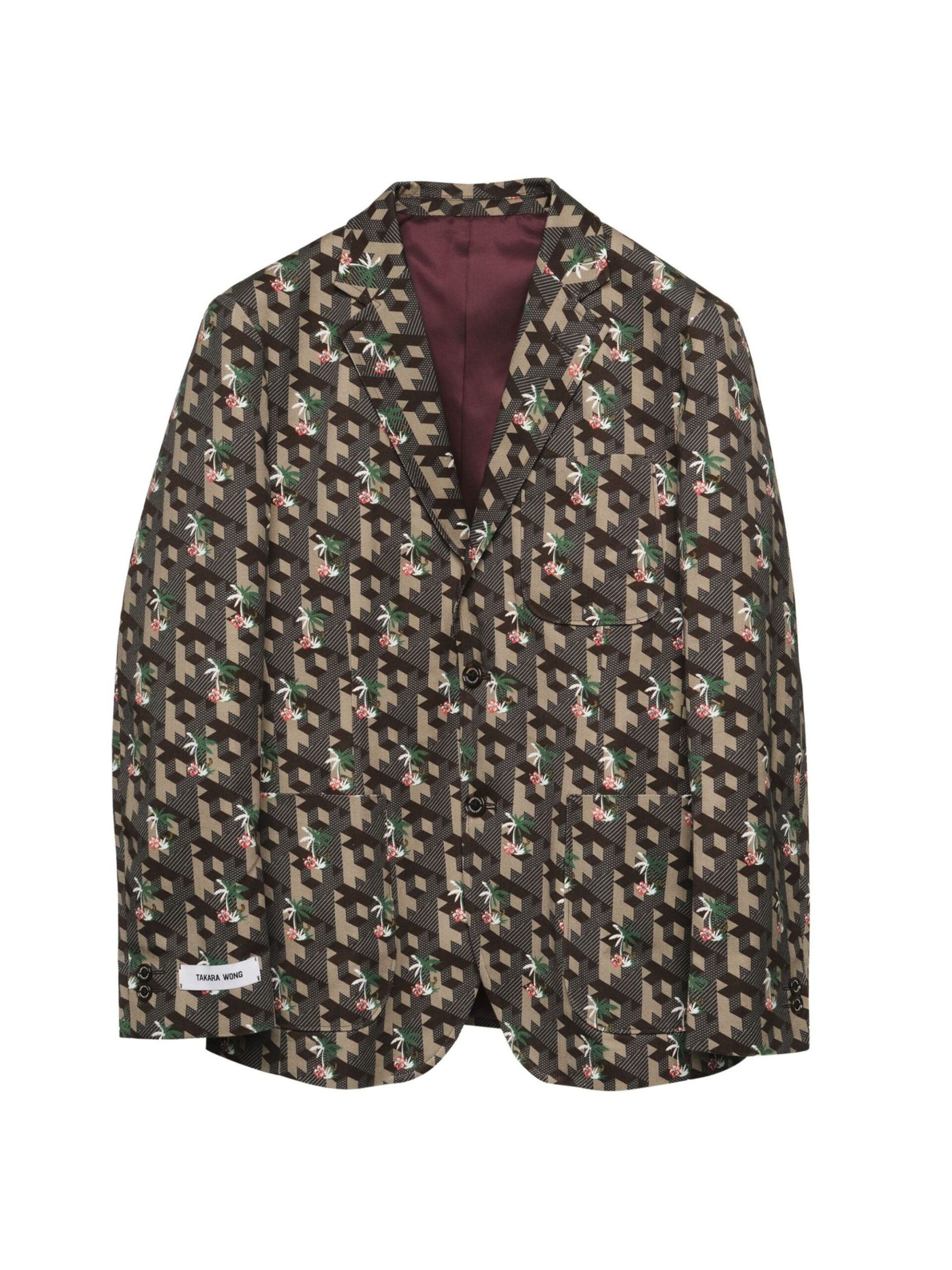 เสื้อแจ็คเก็ต ผ้า Twill cotton พิมพ์ลายทั้งตัว เป็น Full lining สี Red wine กระเป๋าจะเป็นกระเป๋าแปะทั้งหมด เพื่อแสดงความ casual กระดุมนำเข้าจากประเทศญี่ปุ่นของแบรนด์ TAKEO KIKUCHI ส่วนแขนขวามีป้ายโลโก้ของ TAKARA WONG อยู่