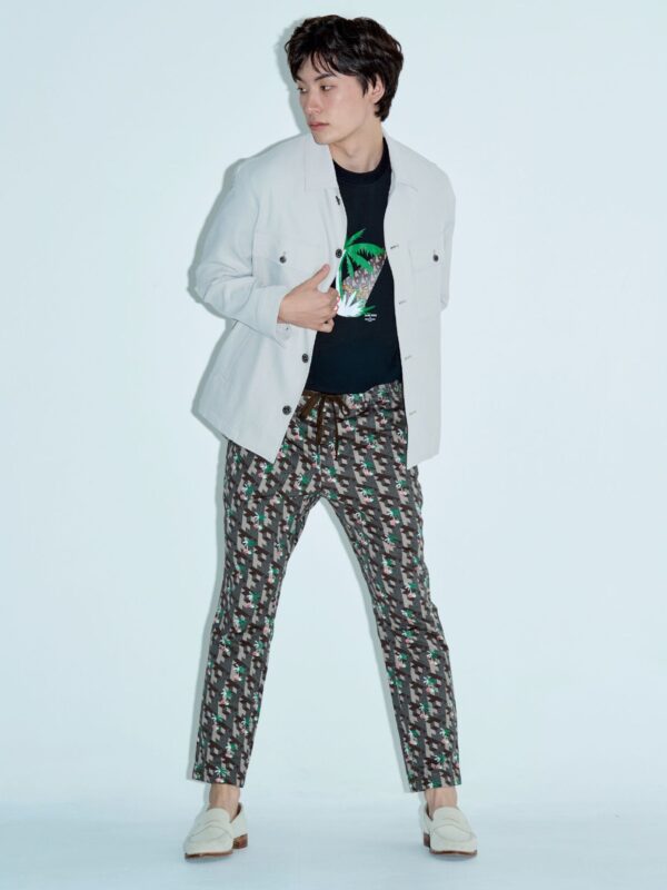 กางเกง easy pants ผ้า Twill cotton พิมพ์ลายทั้งตัว แต่จะอ้างอิง Silhouette ที่เป็นผลิตภัณ์ขายดีของ TAKEO KIKUCHI เนื่องจากผ้าไม่ได้มีความยืดมาก จึงมีการขยายช่วงขาล่างเล็กน้อย เพื่อสะดวกสบายในการสวมใส่ มีป้าย TAKARA WONG อยู่ด้านในของกางเกง