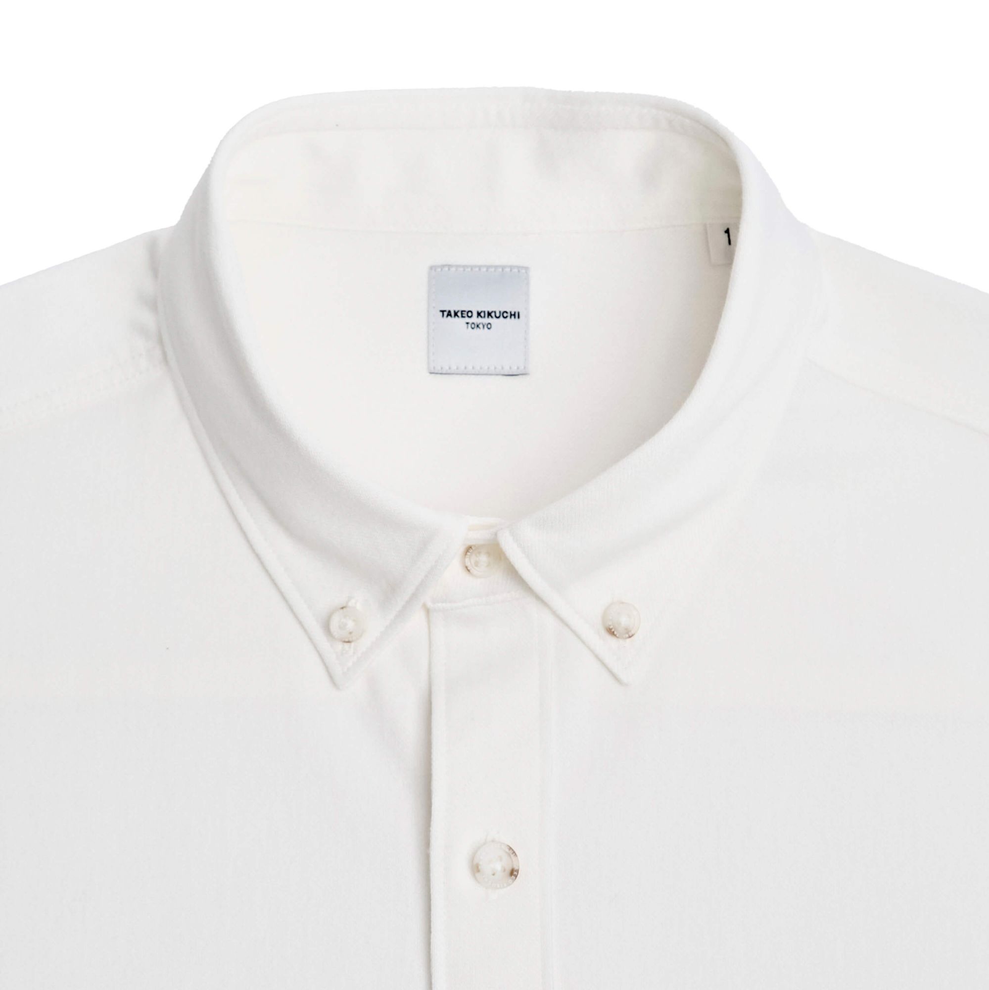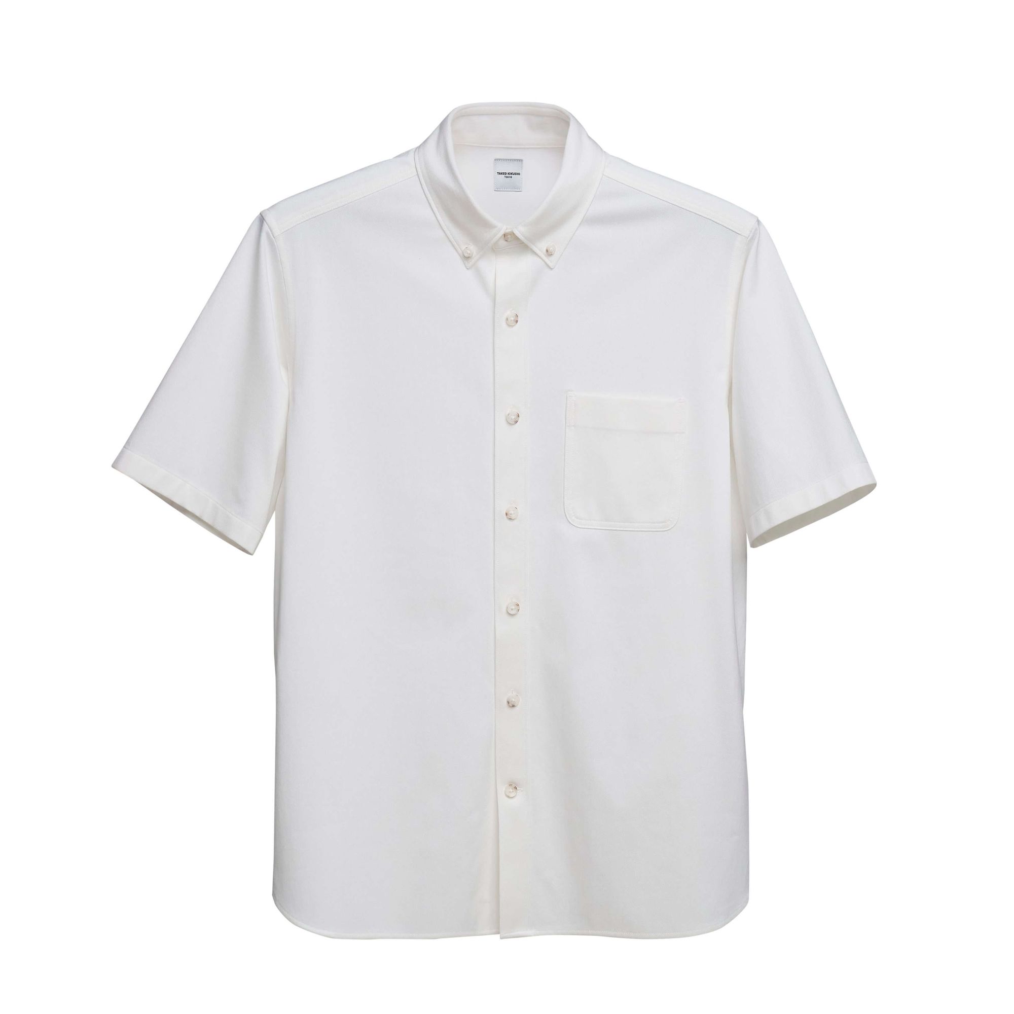 เสื้อเชิ้ตแขนสั้นคอ Button-Down ผลิตจากผ้า Yarn-Dyed Jersey Knit ที่มีเนื้อนุ่ม เด้ง และยืดหยุ่นสูง ด้วยโครงสร้างแบบ High-Gauge ทำให้ผ้ามีน้ำหนักเบา ทอแบบ Twill ลาย Herringbone และผ่านกระบวนการย้อมสีให้มีลักษณะคล้าย Denim