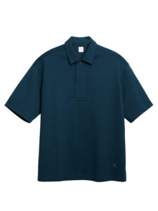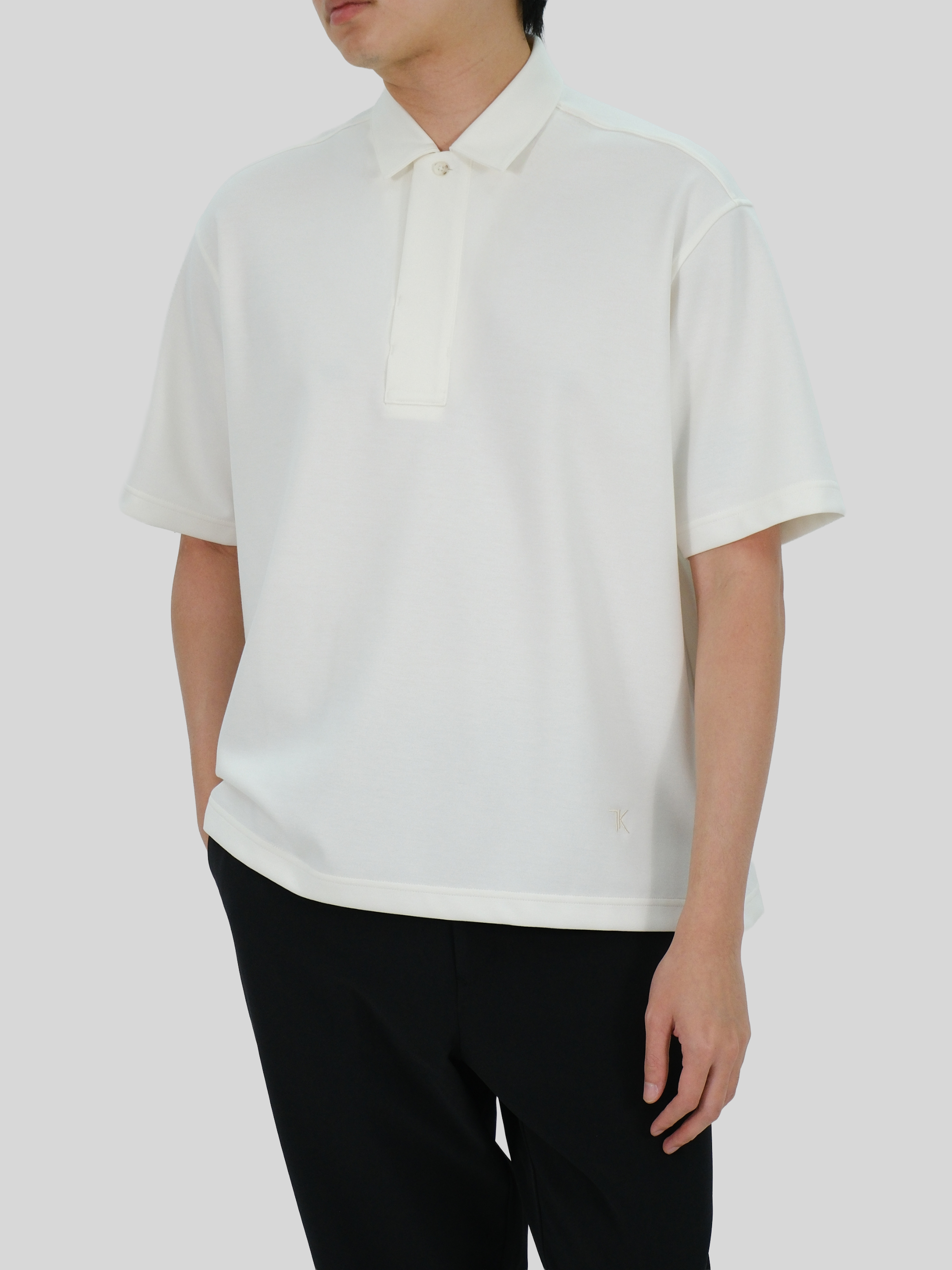 เสื้อโปโล 2Way Collar ทรงหลวม สามารถใส่ได้สองแบบ แบบปิดคอ หรือแบบ Open Collar ก็เพิ่มความ Casual ขึ้นมาได้ มีดีไซน์เพิ่มขนาดตัว Placket ให้ใหญ่กว่าปกติ แต่ยังตอบรับกับความเรียบง่ายและความเงาของผ้า มีงานปัก TK ตรงชายเสื้อ