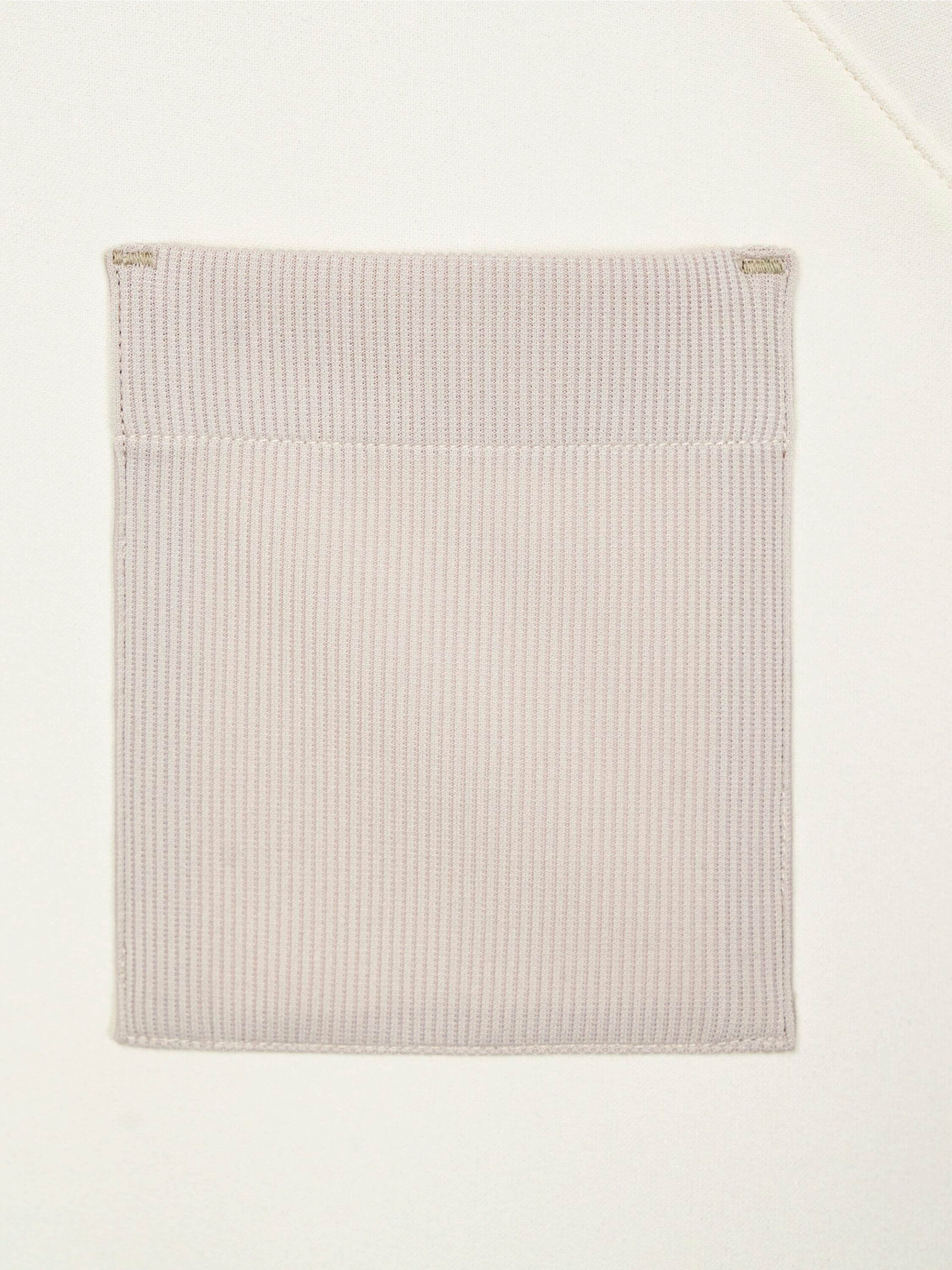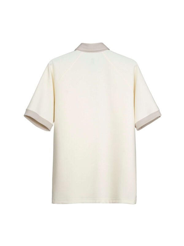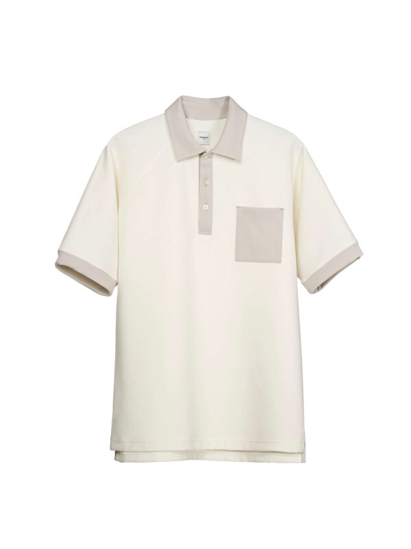 เสื้อโปโล แขน Raglan ผ้า Woven 2 ชั้น เนื้อจะมีความหนาเล็กน้อย มีความเด้ง เป็น Recycle polyester มีคุณสมบัติ Cool touch (สัมผัสเย็น), 2Way stretch (มีความยืด), UV protection (ป้องกันรังสี UV) และ Eay care (ดูแลรักษาง่าย ยับยาก) มีการแต่งผ้าด้วยผ้า rib สี on tone ผ้าที่แต่งจะมีที่คอ สาบหน้า กระเป๋า ขอบแขน และผ้าแต่งตรงผ่าข้าง ทรงหลวม สวมใส่สบาย