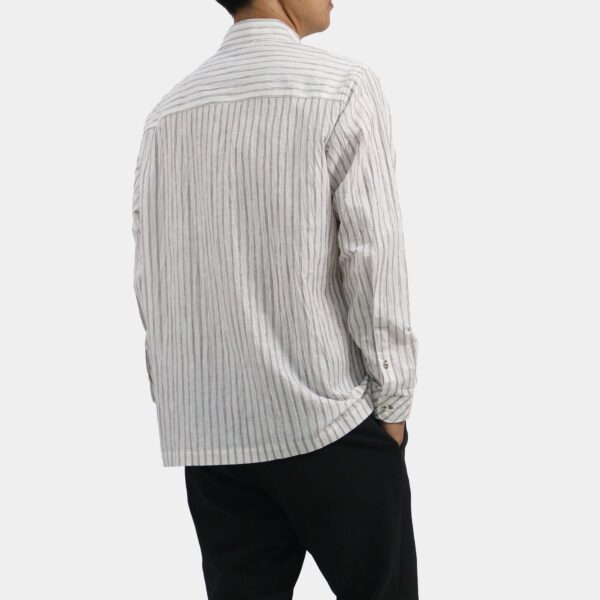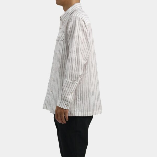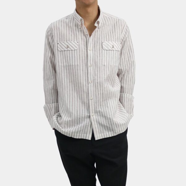 เสื้อเชิ้ตแขนยาวทรง Semi Oversize พร้อมปกแบบ Button-Down ผลิตจากผ้า Linen ผสม Cotton และ Polyester ซึ่งเป็นเนื้อผ้ายอดนิยมของแบรนด์ เนื่องจากให้สัมผัสที่เป็นธรรมชาติ สวมใส่สบาย และมีความยับในตัวอยู่แล้ว จึงไม่จำเป็นต้องรีด เสื้อเชิ้ตตัวนี้เน้นการโชว์ Texture ของผ้า มีน้ำหนักเบาและให้ความรู้สึกเย็นสบาย มาพร้อม กระเป๋าที่อกและกระเป๋าด้านข้าง เพิ่มดีเทลด้วย การเดินด้ายสีตัดกัน บริเวณฝากระเป๋า ปากกระเป๋าเอว รังดุมที่ฝากระเป๋า และบริเวณข้อมือ นอกจากนี้ยังใช้ กระดุมคุณภาพนำเข้าจากญี่ปุ่น เพิ่มความพรีเมียมให้กับดีไซน์