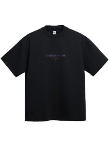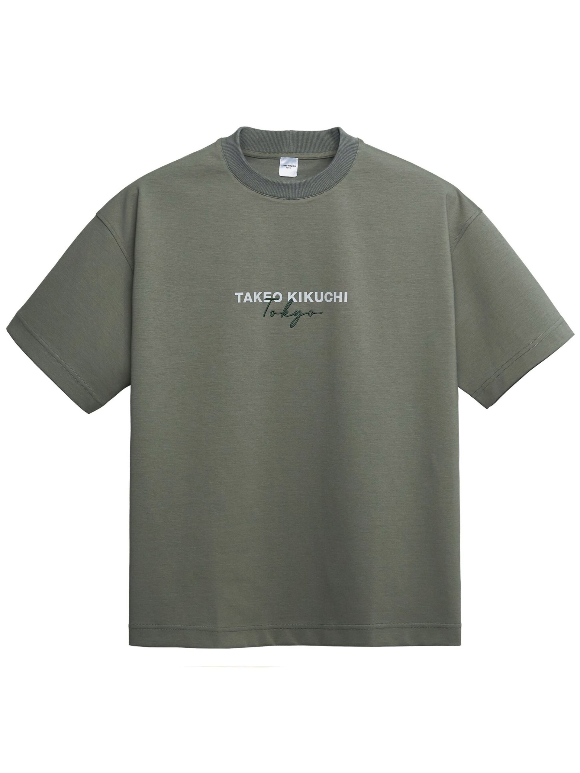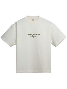เสื้อยืดทรงพอดีตัว มีงานพิมพ์กราฟิกโลโก้ TAKEO KIKUCHI ตรงช่วงอก ปักทับด้วยลาย Handwritten Tokyo ด้านหลังเพิ่มงานปักโลโก้ TK ตรงชายเสื้อ