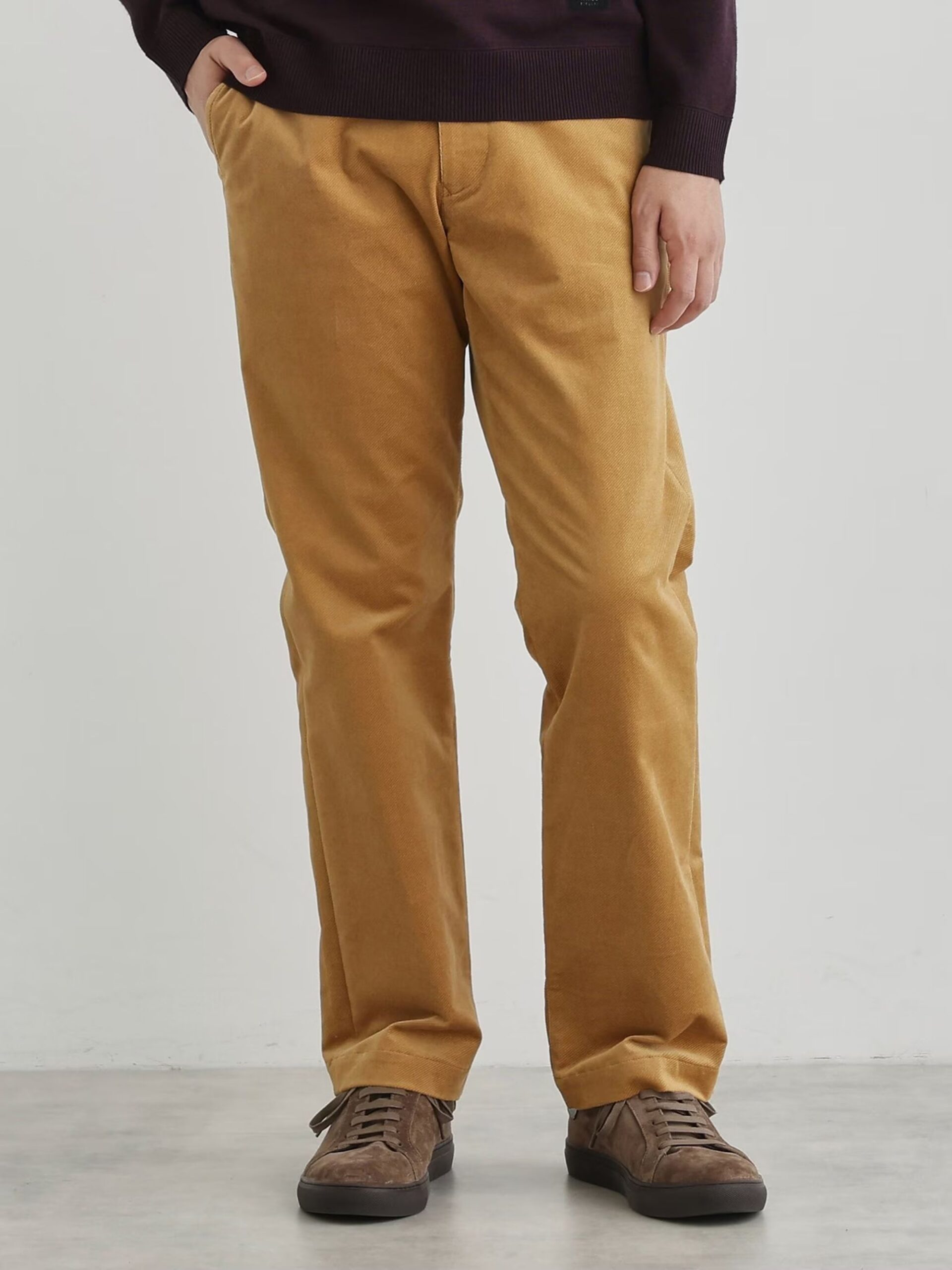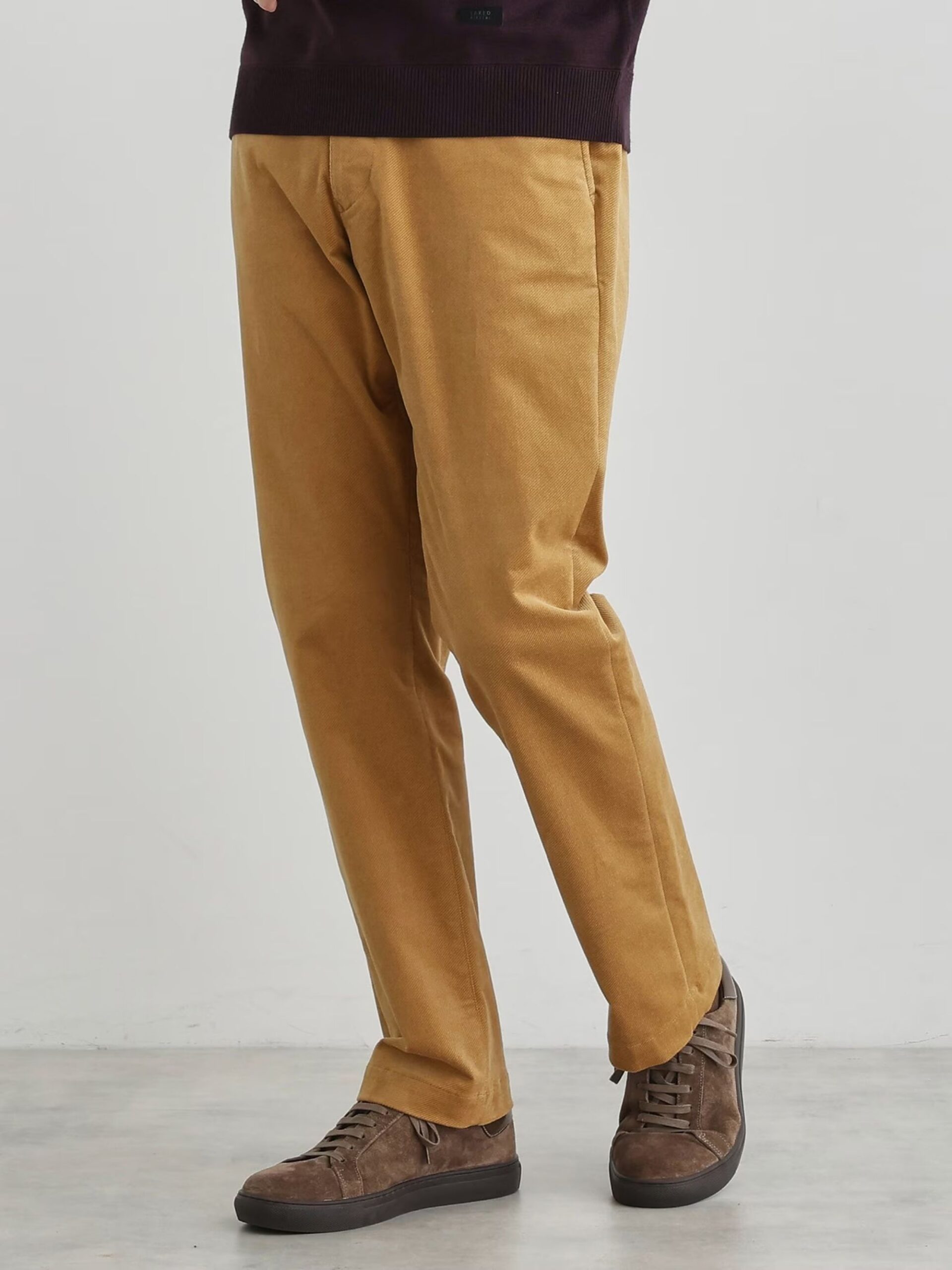 ลูกฟูกของรุ่นนี้เป็นแบบทอแนวเฉียง (twill weave) ไม่ใช่ลายเส้นตั้งแบบทั่วไป ทำให้ดูแตกต่างและพรีเมียมยิ่งขึ้น ผิวสัมผัสที่ฟูนุ่มและเงางามแบบลูกฟูกมอบความหรูหราให้ลุคแคชวลอย่างลงตัว เนื้อผ้าผสมคอตตอนและเรยอน ให้ความนุ่มสบาย พร้อมด้วยความยืดหยุ่นทำให้เคลื่อนไหวได้ดี พื้นผิวผ้าแบบซีซันนัลช่วยเพิ่มมิติ ให้ลุคดูมีเลเยอร์ เหมาะอย่างยิ่งสำหรับตู้เสื้อผ้าฤดูใบไม้ร่วง–ฤดูหนาว